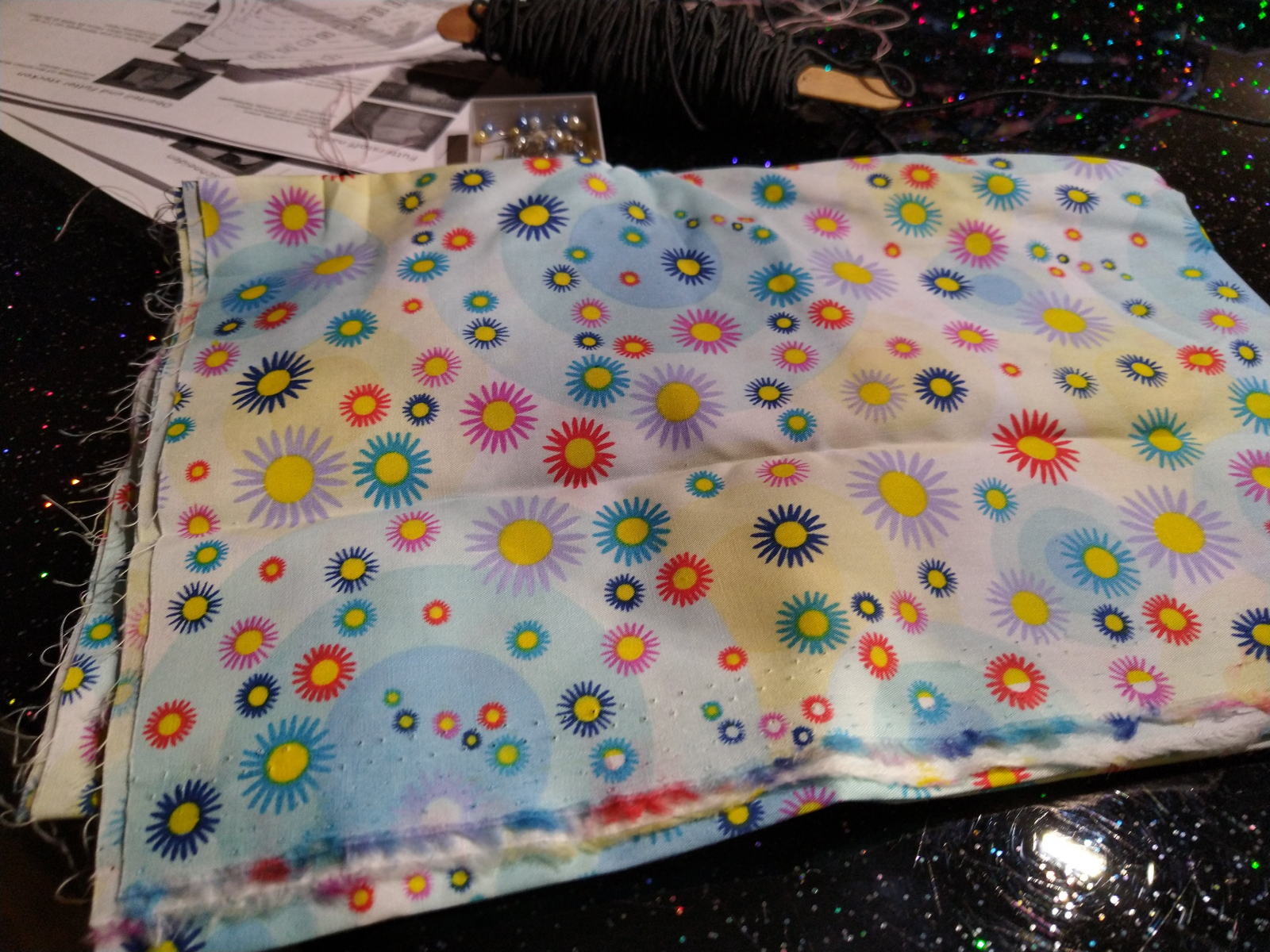 Bild 3: Ursprünglich gekauft als Blümchenmotiv. Das sind aber eindeutig Coronaviren, nicht wahr? Dahinter die Elastikschnur für die Schlaufen.