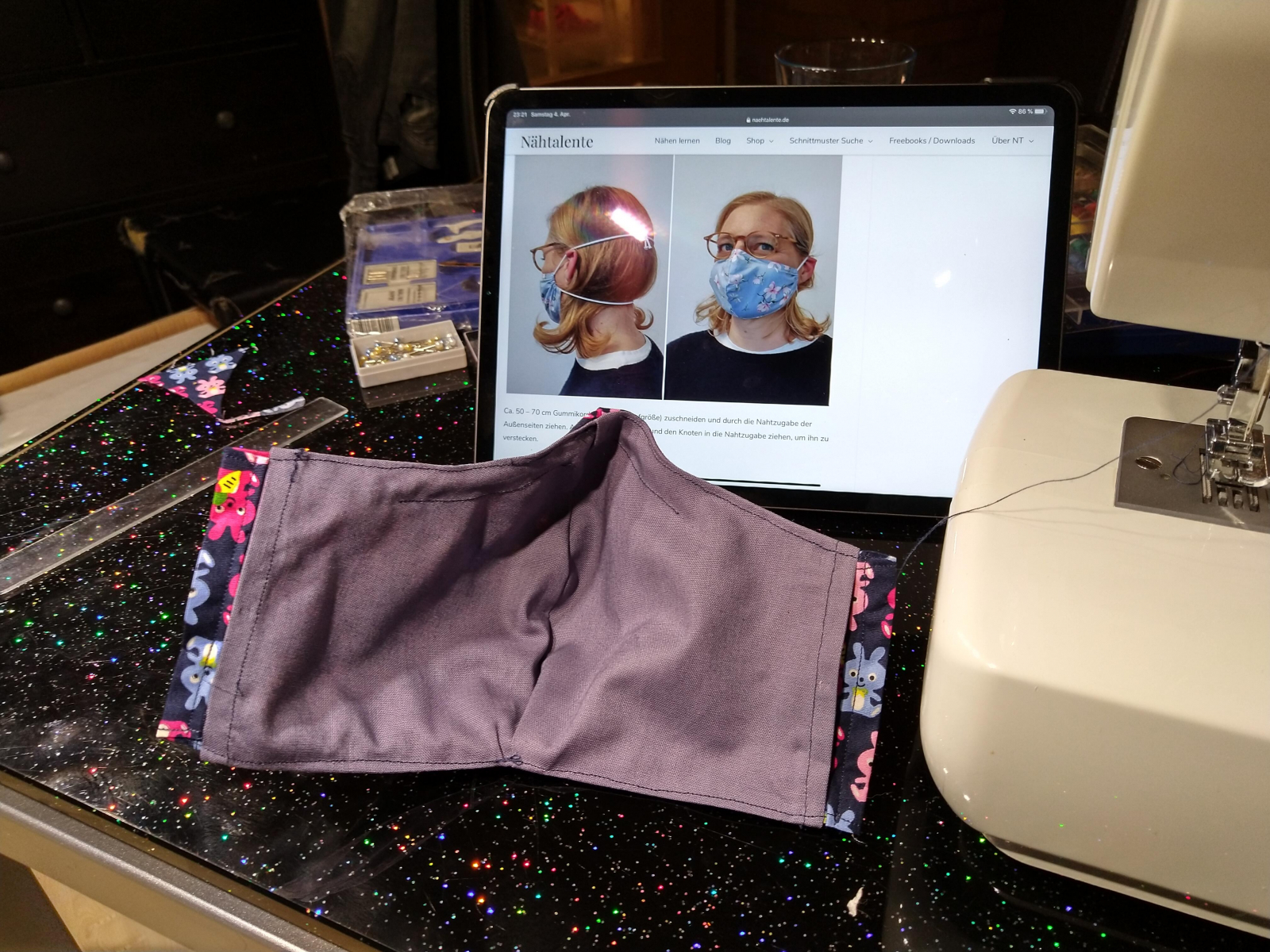 Als Nähanleitung habe ich mich für die Version von "Nähtalente.de" entschieden. Sehr kompfortabel zu tragen, Schablobe mit vielen Größen, Nasen-Drahtbügel aus Schnellheftern, Schlaufe hinterm Kopf (Ohrschlaufen stören mich) und der Option, Filter einzuschieben (z.B. aus HEPA-Staubsaugerbeutel geschnitten, mache ich aber nicht).
