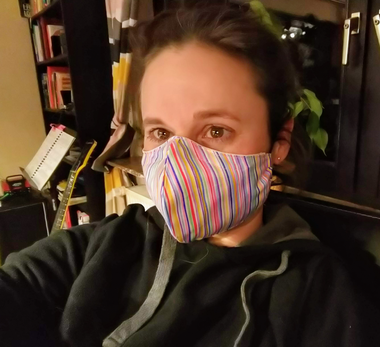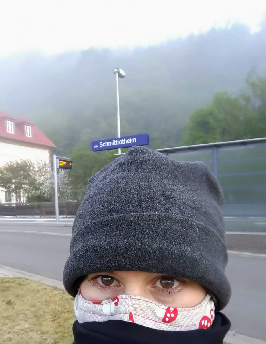 Bild 4: Selfie früh morgens bei Frost. Damit werde ich auch nach Corona zum Bahnhof radeln! Sehr praktisch. Das ist mein Pilzstoff, aus dem ich die Vorhänge der Gartenhütte genäht hatte.