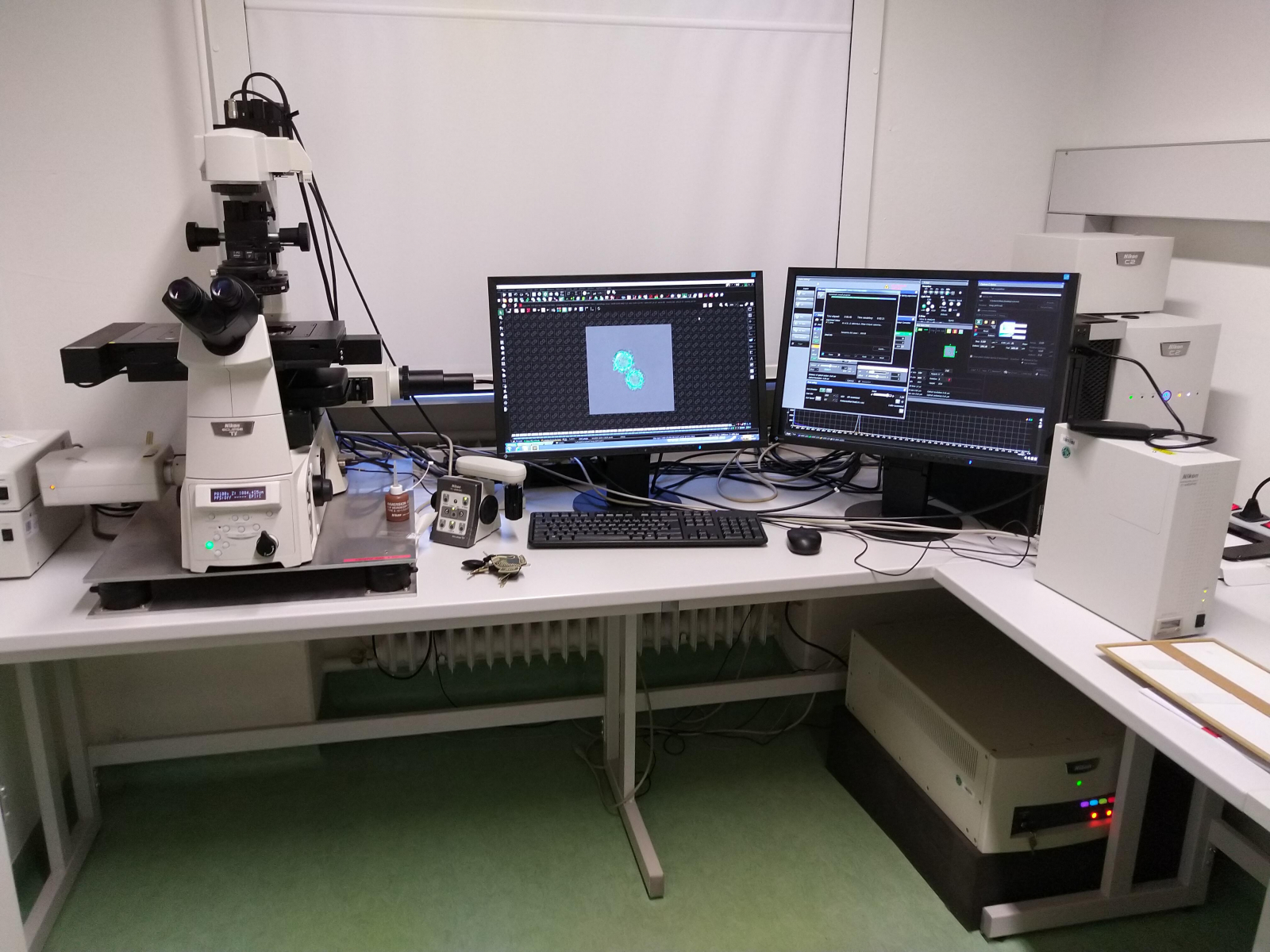 Bild 1 (Nikon-LSM): rechts unten der Laser, rechts auf dem Tisch Computer und Detektor, vorne rechts Fluoreszenzlampe zur normalen Fluoreszenzmikroskopie, um sich per Okular in der Probe zu orientieren. Die habe ich etwas abseits gestellt, weil der Lüfter mir Artefakte ins Bild vibriert hat (zusätzlich waren aber auch die Luftpolster-Füßchen am Mikro-Tisch platt, nun wieder aufgepumt). Alles mit Lichtleitern verkabelt.