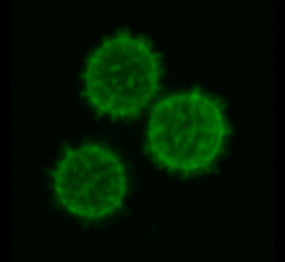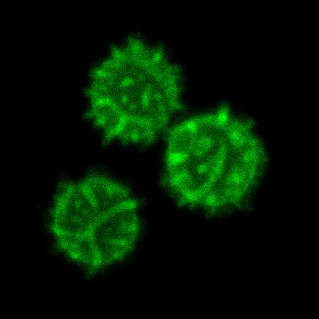 Bild 6: Drei Sporen im Grünkanal, als Z-Projektion. Und zwar nur die Bilder 40-80, also nur eine Halbschale der Sporen. Man will ja nicht noch die Rückseite übereinanderprojizieren (macht man beim focus stacking ja auch nicht).