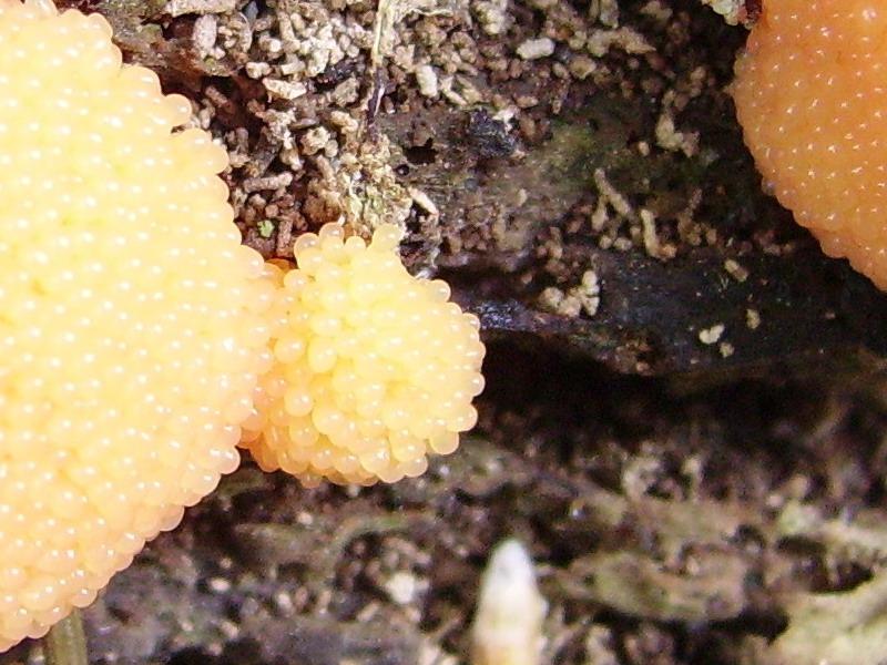 ende Mai habe ich auf einem feuchten, vermoderten Baumstamm im Mischwald etwas oranges gefunden? Der erste Eindruck war Hexenbutter, Fuligo septica - aber in orange? Bei näherem Betrachten erinnert das Gebilde mich eher an Eier? Wer kann mir weiterhelfen?