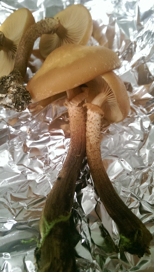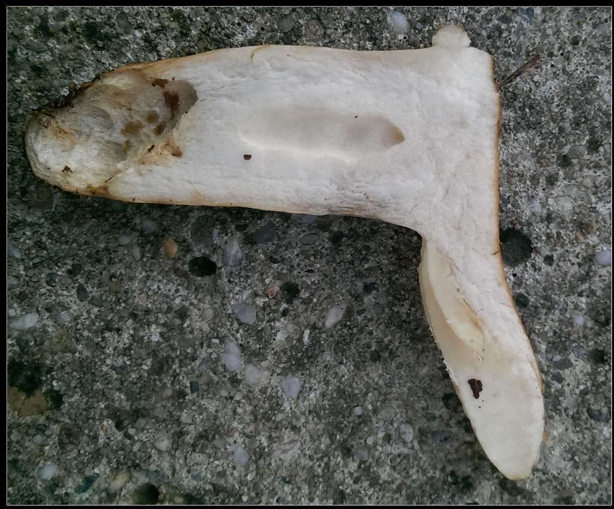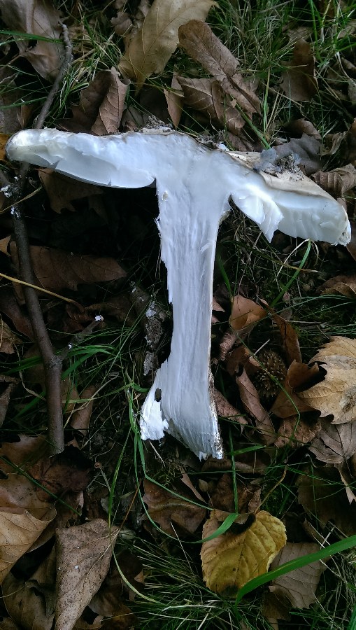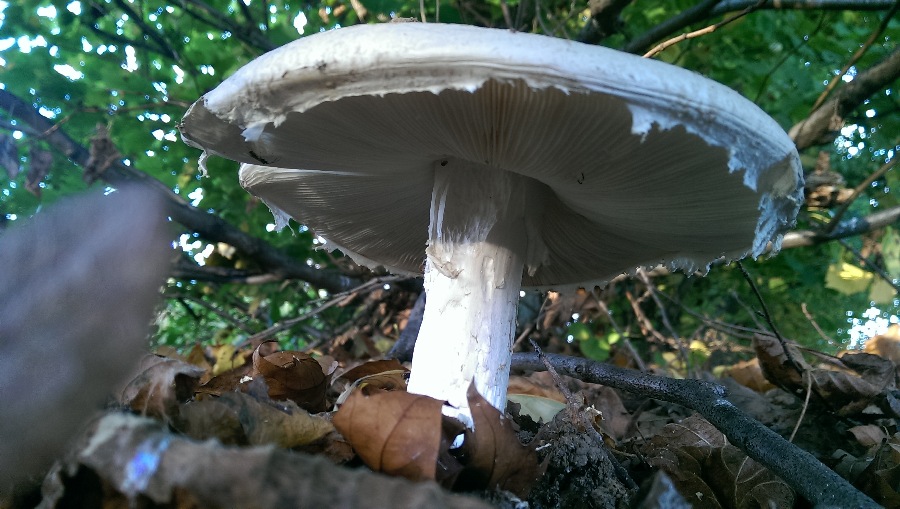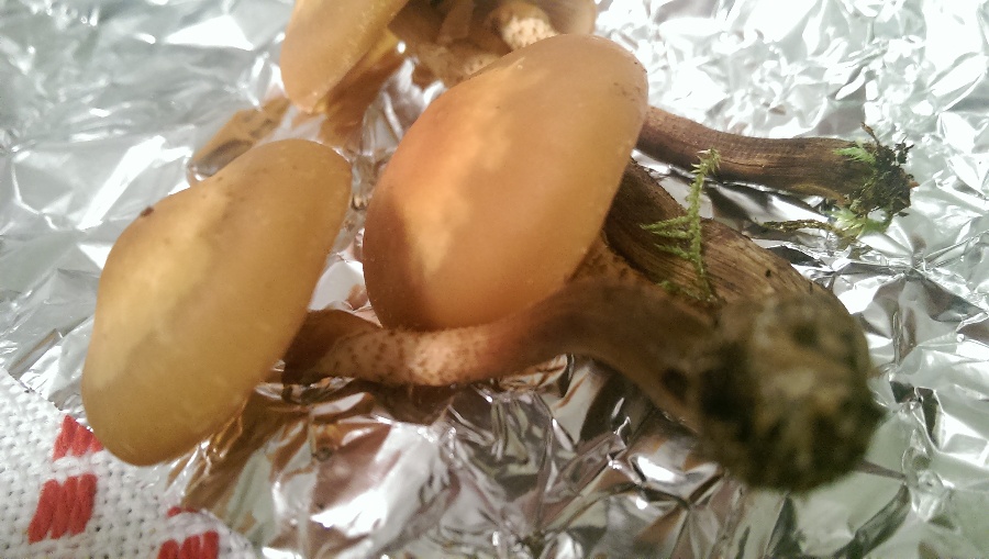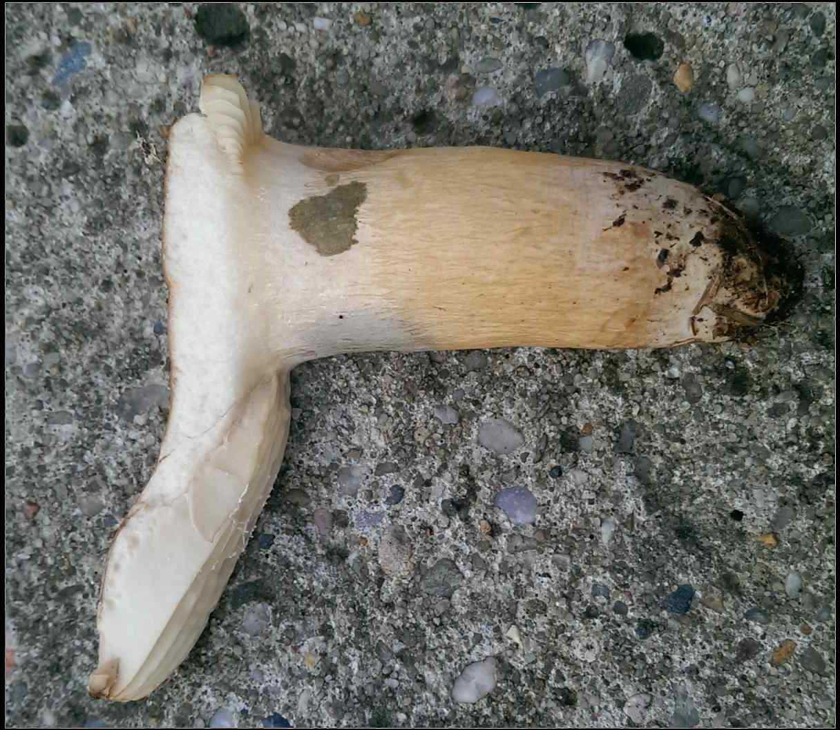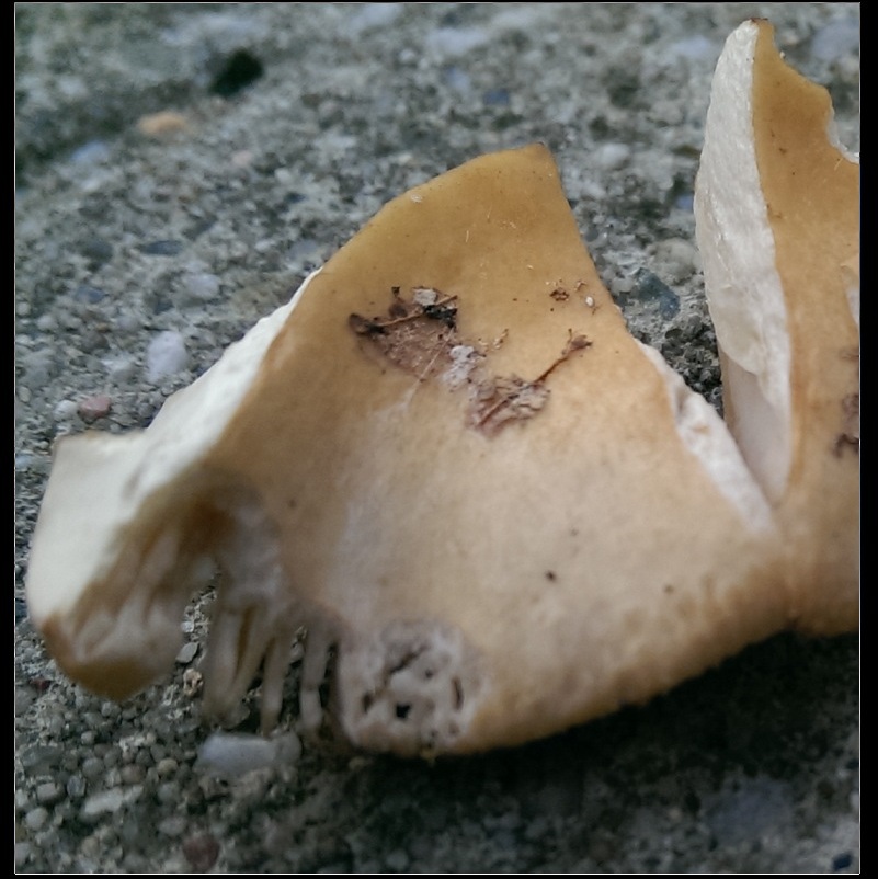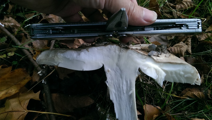 Zunächst: Leider war fürs Foto nur noch Pilzfragmente übrig. Ich gelobe feierlich Besserung: das nächste mal werde ich ZUERST den Pilz fotografisch dokumentieren und ihn ERST DANN zwecks Bestimmungsversuch zerfleddern.