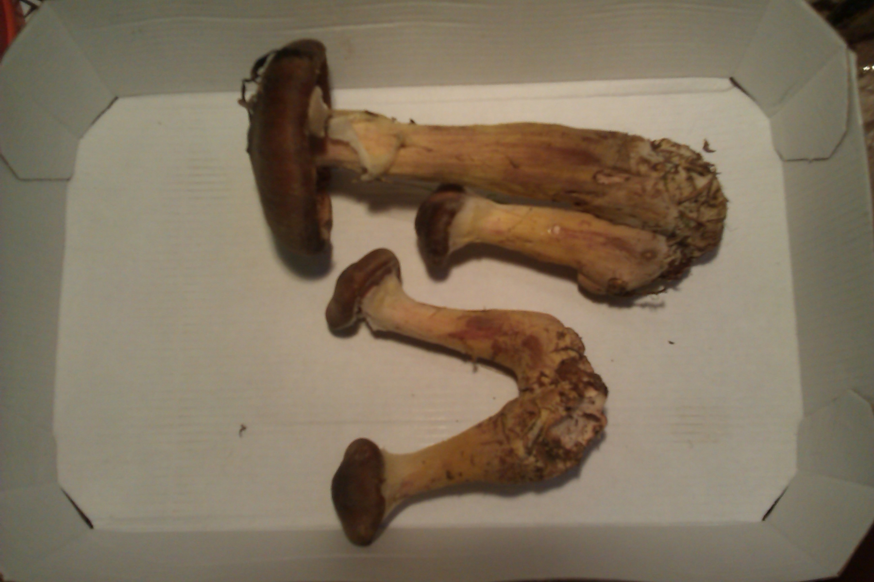 Pilz 6: Das halte ich für Semmelstoppelpilze. Ich denke die sind auch relativ sicher zu bestimmen. Einige Zeit nach dem aufschneiden war das Fleisch gelb-orange.