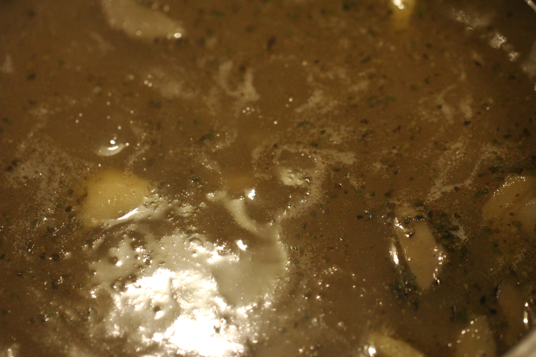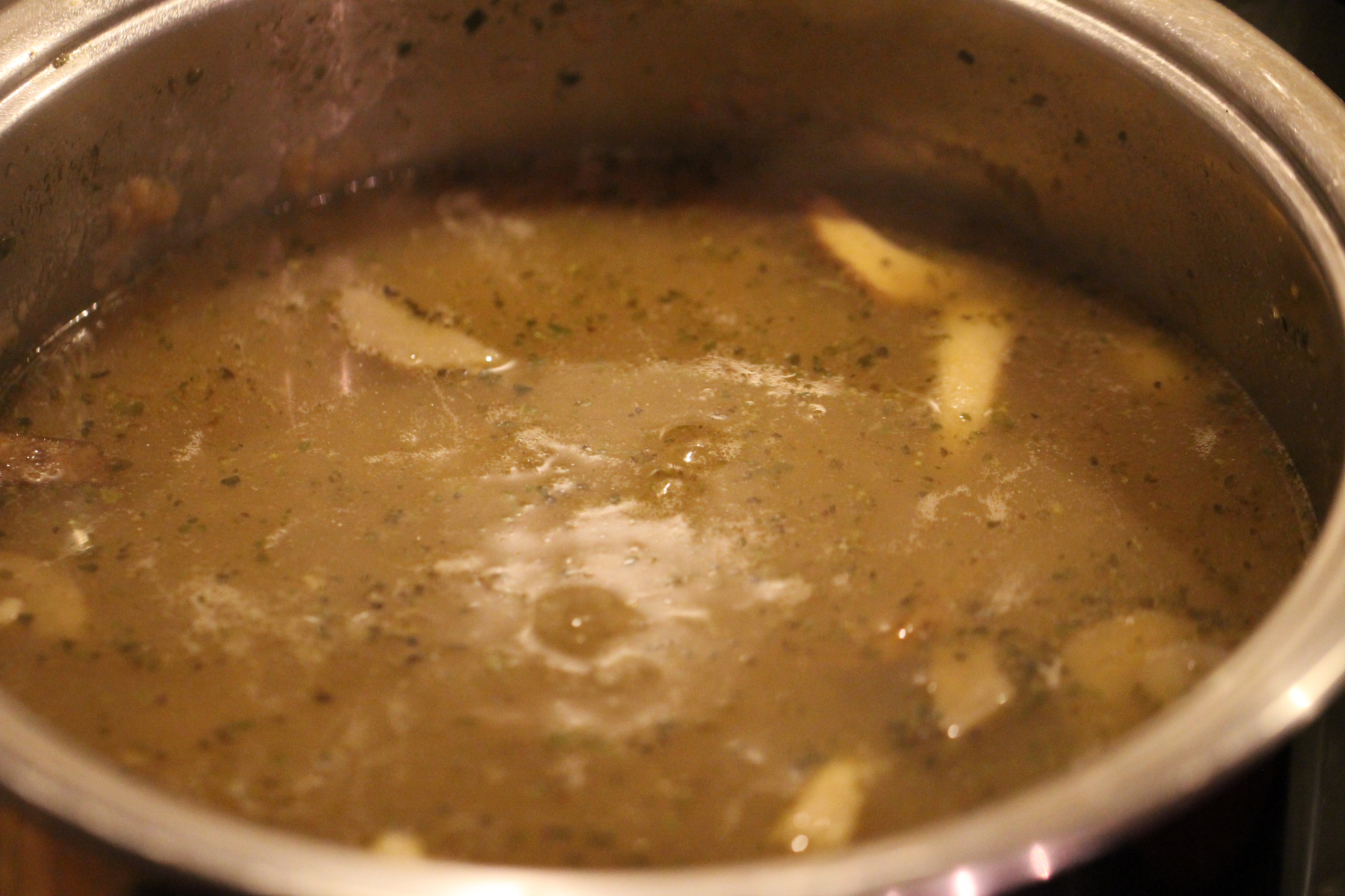 die Mehlschitze wird dann in die Suppe unterrührt, sodass sie eine leicht sämige Konsistenz bekommt; falls es an der Konsitenz fehlt, kann man auch noch mit etwas Mondamin nachhelfen