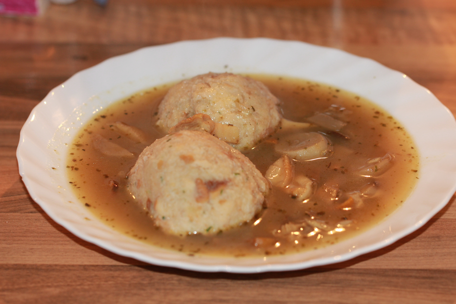Zu der Pilzsuppe gibt es Semmelknödel.