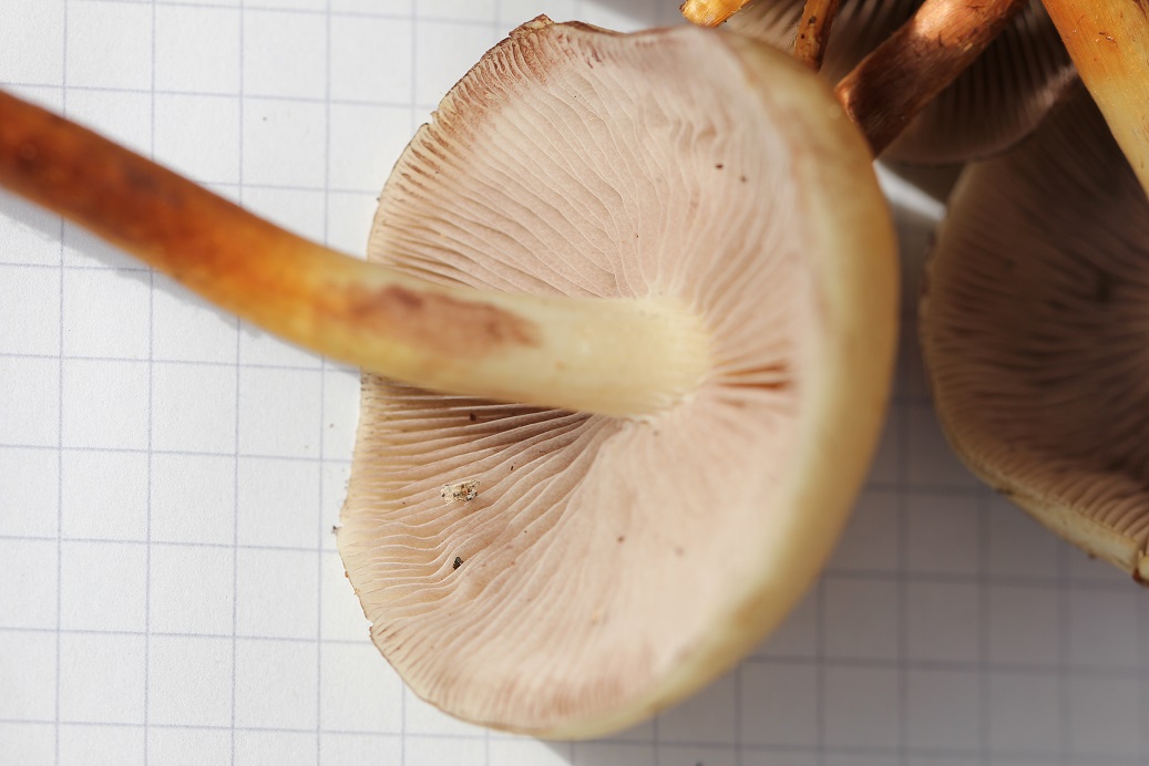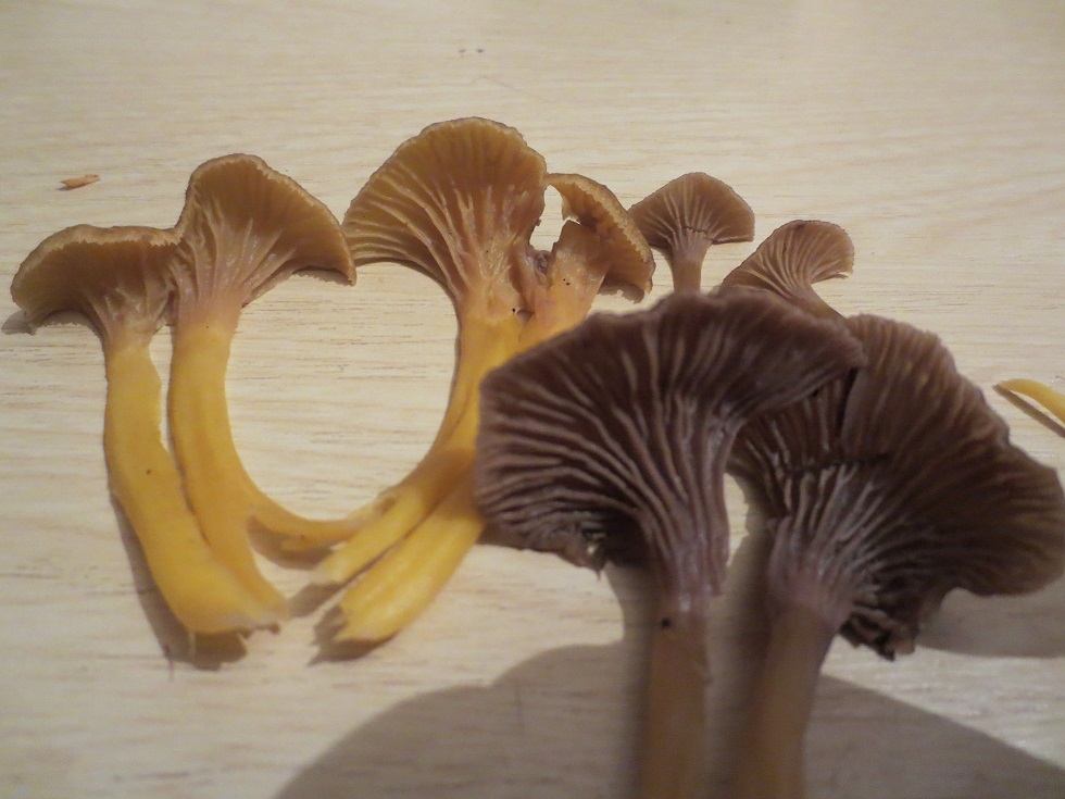 Die Bilder zeigen den Trompetenpfifferling von oben (ein älteres Exemplar, das schon in gräuliche geht), dann ein paar Bilder von den Leisten. Es kommt immer wieder mal vor, dass mehrere Stiele zusammenwachsen und einen gemeinsamen Hut haben.