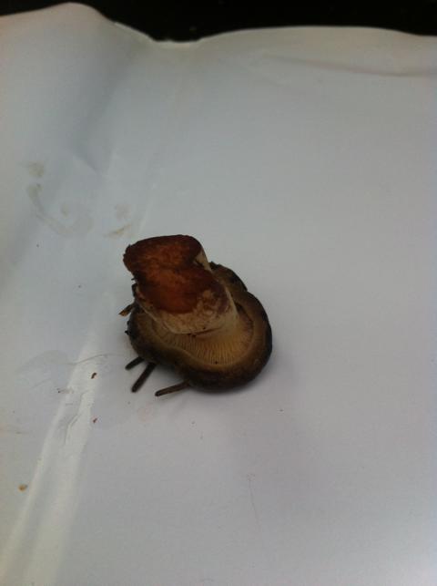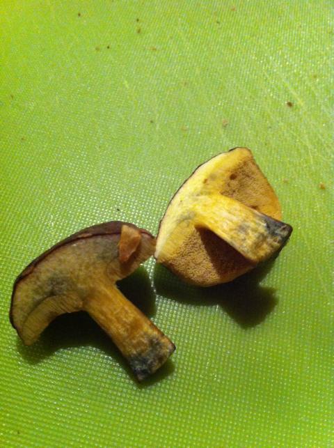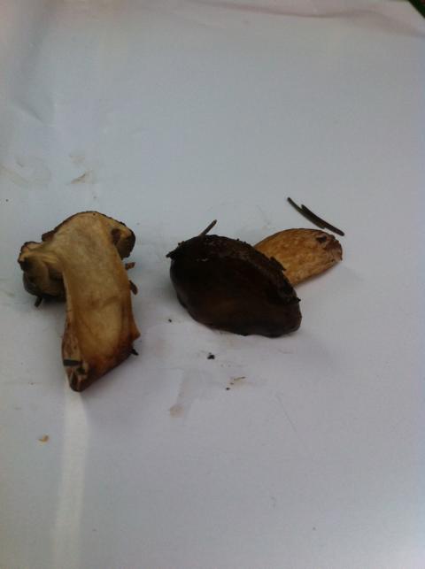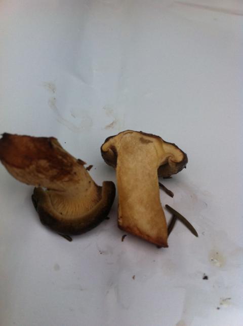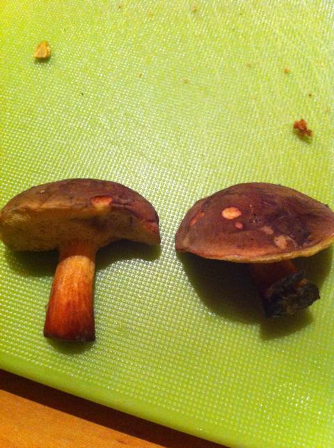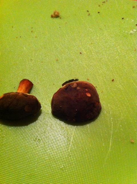 Also der erste wuchs unter Nadelbäumen und wenn man einen gefunden hat, gabs auch immer gleich mehrere in in der Nähe. Sie waren relativ klein, kann also irgendeine junge Art von irgendwas sein. Von weitem sahen sie immer erstmal aus, wie ein kleiner Steinpilz, aber kaum kam man näher dran, waren sie sehr glänzend und der Deckel etwas schleimig, aber nicht zu extrem. Sie haben einen schönen dicken Stil. Am Rand sind sie so umgekrempelt und haben kleine Lamellen, aber wenn der Pilz ganz klein ist, hat man die kaum gesehen.