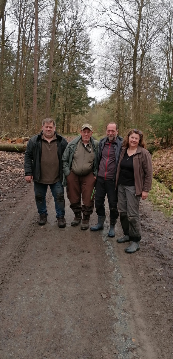 Am Samstag war ich noch einmal auf der Brandstelle, Karl hatte mich zu einer gemeinsamen Exkursion eingeladen. Mit von der Partie waren außerdem noch RaDa und Rainer Wald, meine drei persönlichen Erstfunde waren mir also schon einmal gewiss. Hier im typischen Mykologengang bzw. Mykologen-Foto-Haltung Karl W Rada