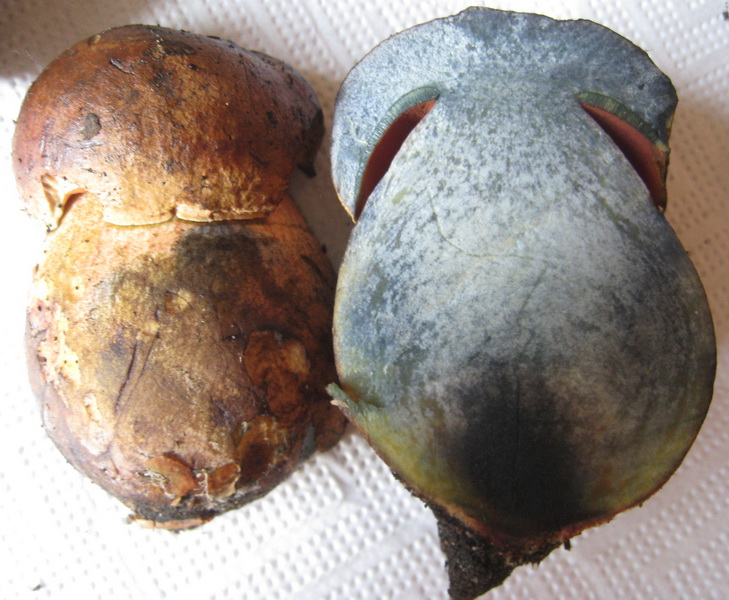 Bild 14: Huthaut bei beiden Pilzen leicht abziehbar, die Trama darunter ist blass rötlich braun gefärbt