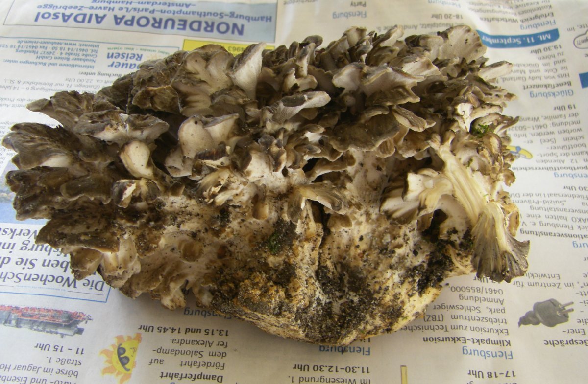 ich habe gestern am Fuß eines Baumes, ich meine, es war eine Eiche, einen ziemlich großen Pilz gefunden, den ich für etwas aus der Verwandtschaft der Krausen Glucke hielt. Ich hab dann mal ein Stück zur näheren Bestimmung mitgenommen, bin dabei dann aber nicht weitergekommen. Viel Verwandtschaft scheint die Glucke ja nicht zu haben, und vor allem die dunkelgraue Farbe paßt da nirgends.