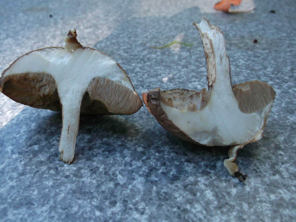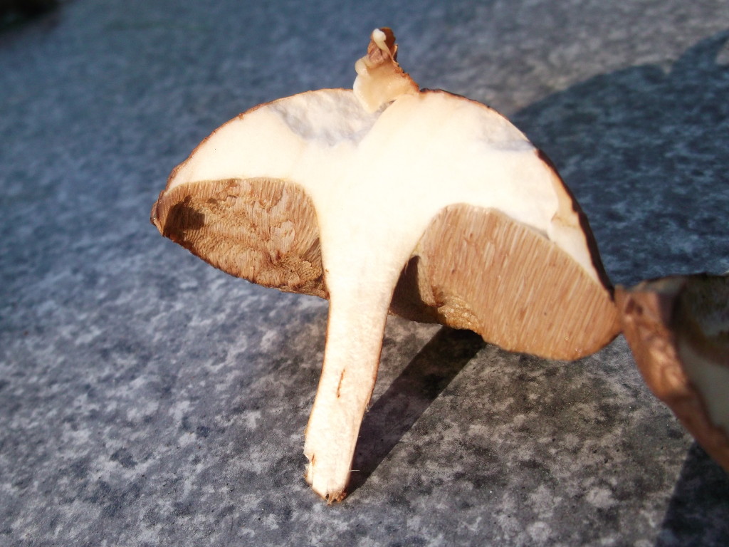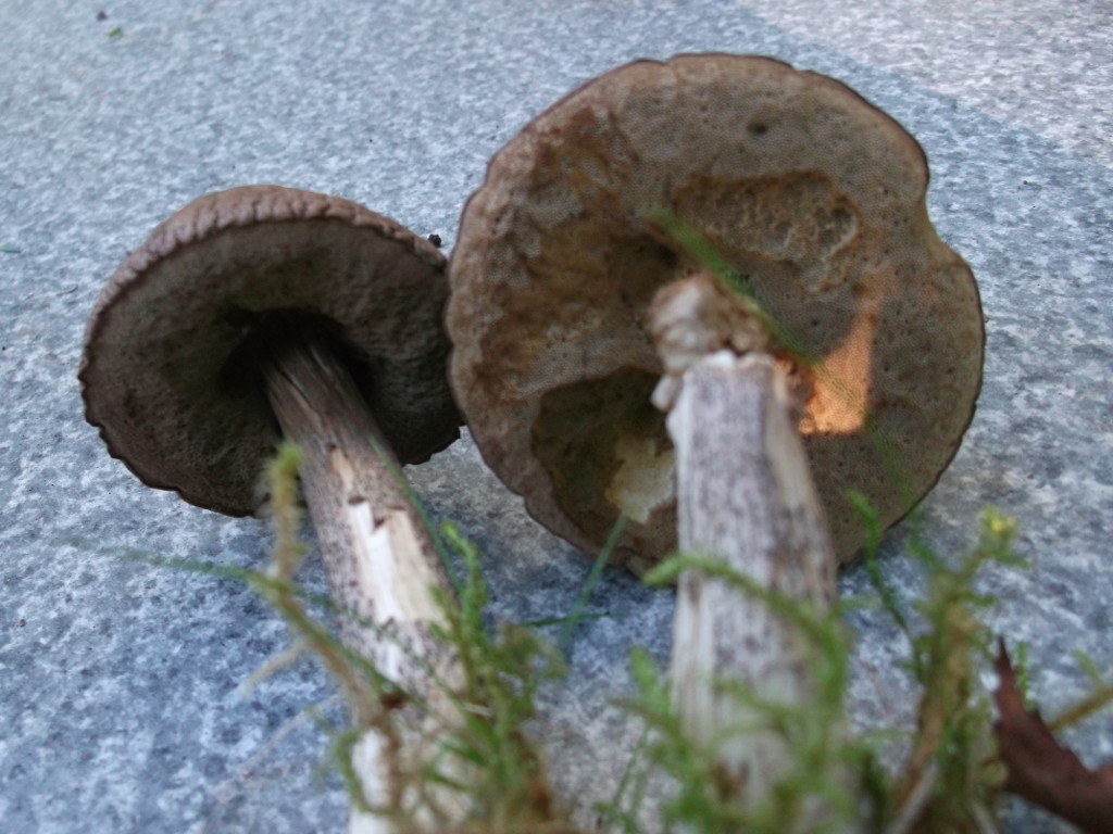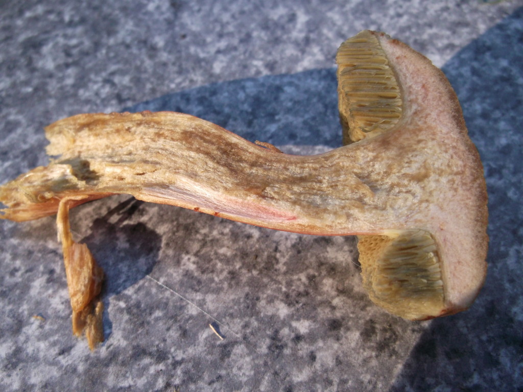 Mir sind vor allem drei Pilze ins Auge gesprungen. Der erste ist ein Röhrling mit angenehmem, pilzigem Geruch. Die Kappen sind oben braun, runzlig und trocken, das Fleisch ist weiß, die Röhren braun. Die Huthaut ist nicht allzu fest mit dem Hut verwachsen. Die Färbung verändert sich im Anschnitt nicht. Auch der Stiel ist innen weiß, außen rauh mit bräunlicher Zeichnung und ohne Ring.