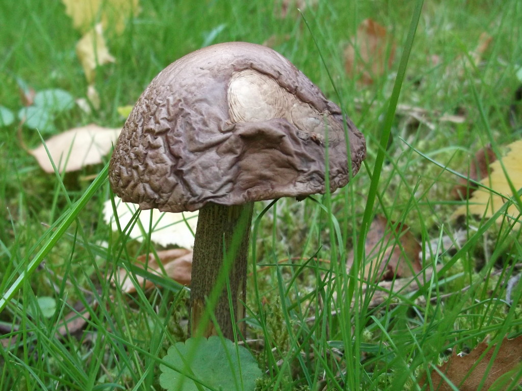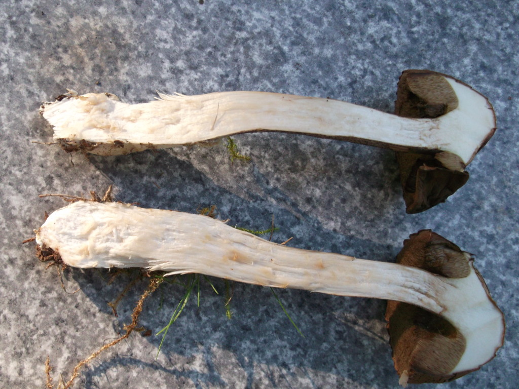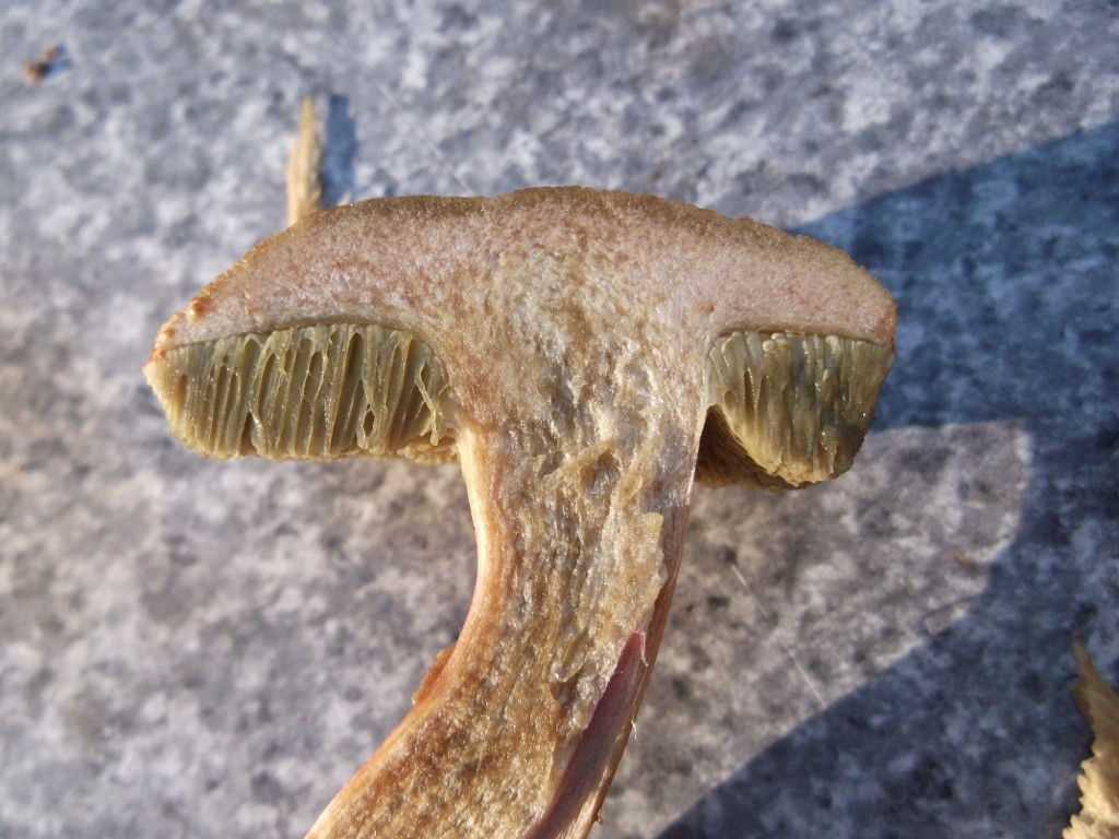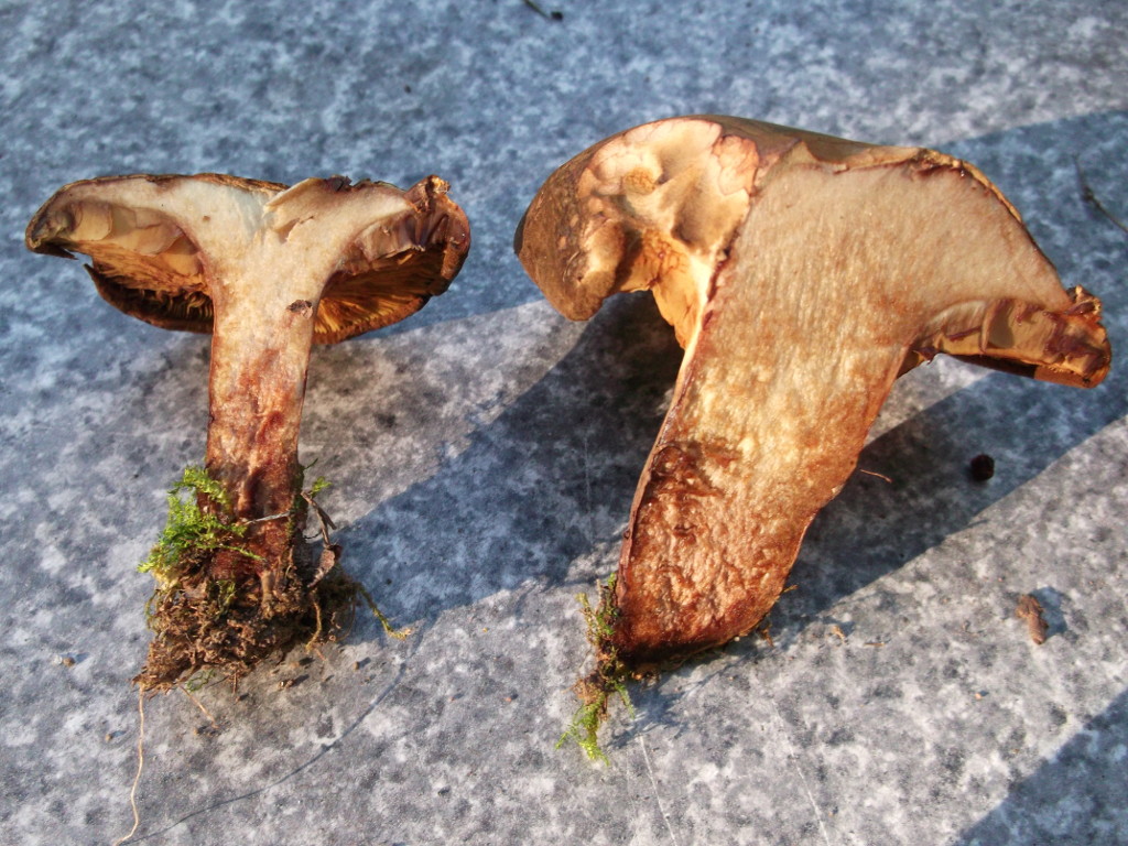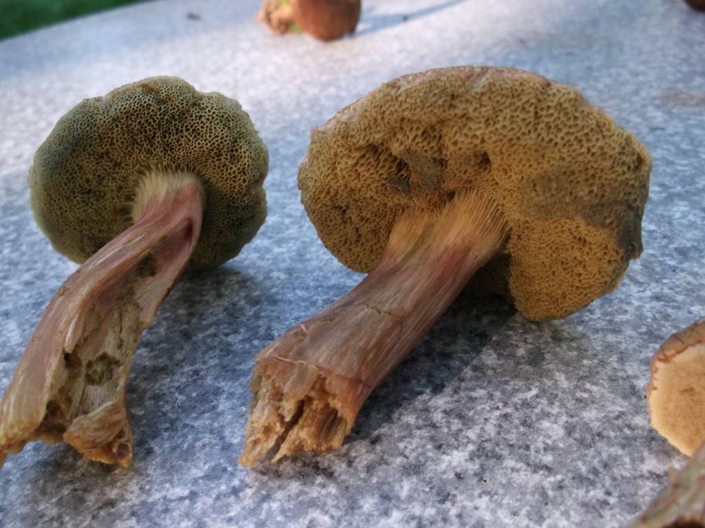 Mir sind vor allem drei Pilze ins Auge gesprungen. Der erste ist ein Röhrling mit angenehmem, pilzigem Geruch. Die Kappen sind oben braun, runzlig und trocken, das Fleisch ist weiß, die Röhren braun. Die Huthaut ist nicht allzu fest mit dem Hut verwachsen. Die Färbung verändert sich im Anschnitt nicht. Auch der Stiel ist innen weiß, außen rauh mit bräunlicher Zeichnung und ohne Ring.
