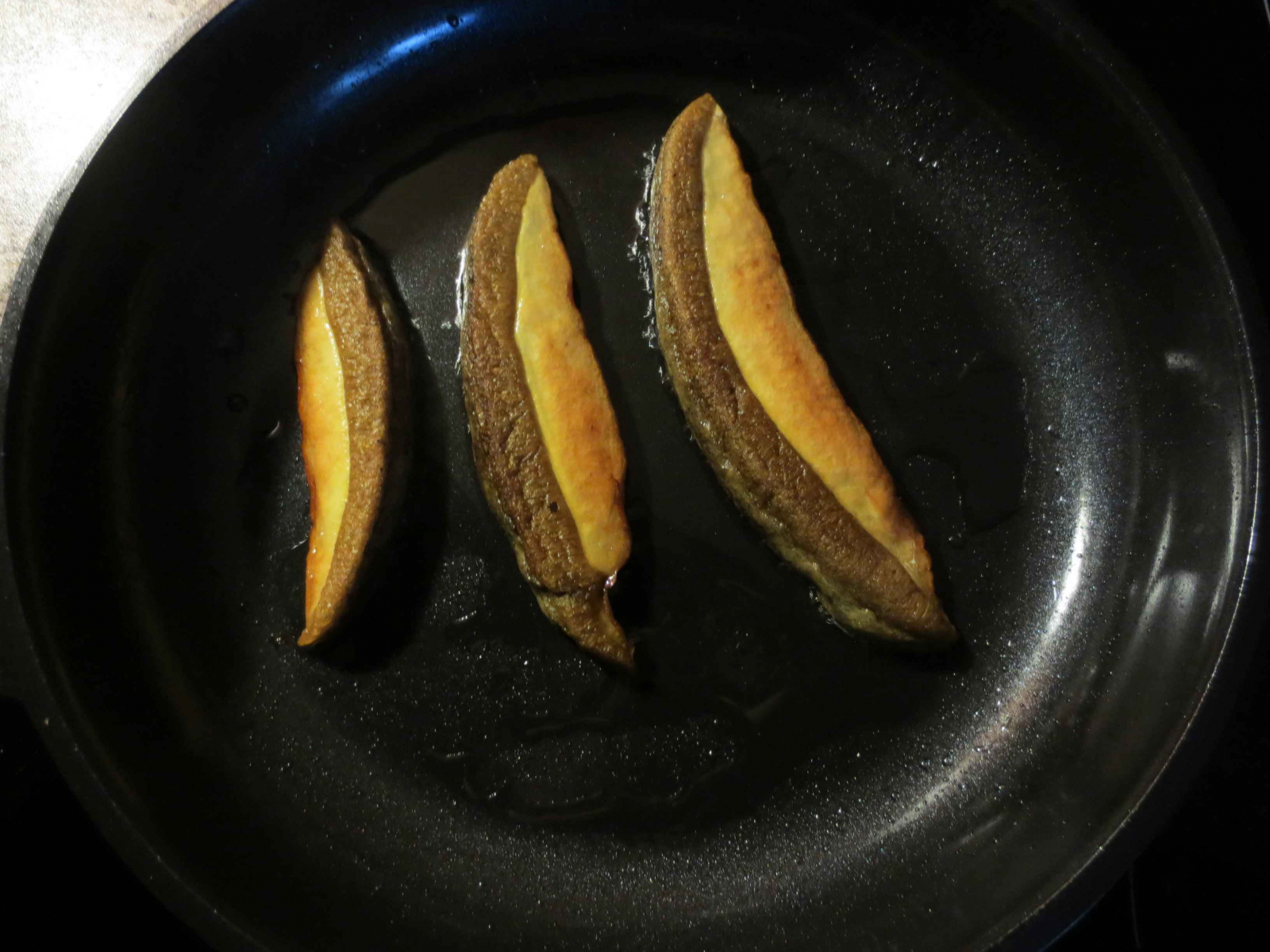 habe ich Stücke nur mit Traubenkern-Öl angebraten, ohne Gewürze.Das Ergebnis war, dass die Stücke wie eine Fettschwarte aber ohne