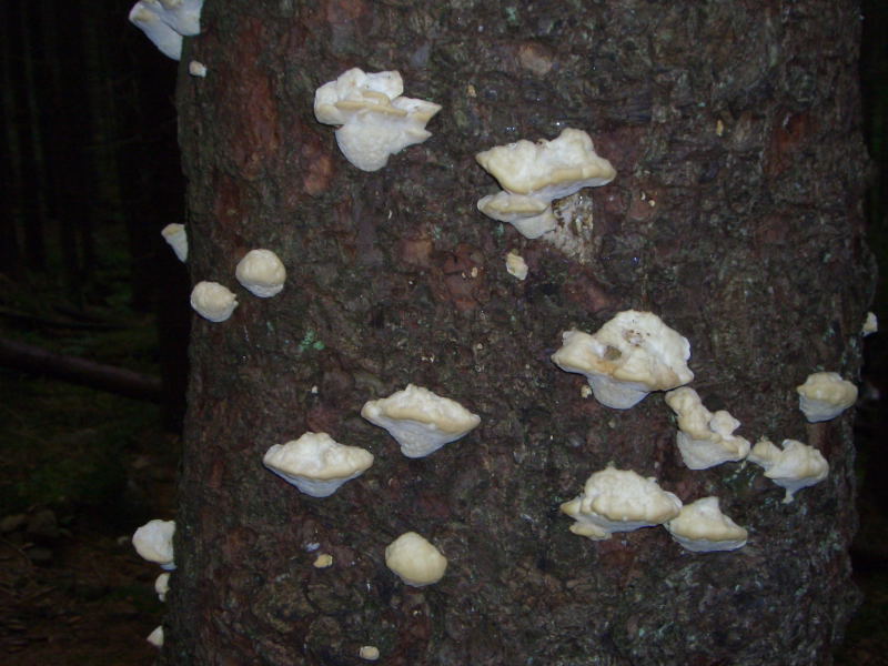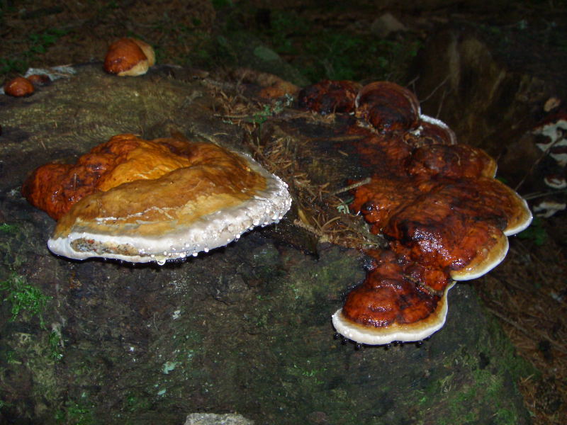 Immerwieder trafen wir auf den ungenießbaren Fichtenporling (Fomitopsis pinicola), der die Würfelfäule hervorruft und auch an Birken und Obstbäumen vorkommen kann.