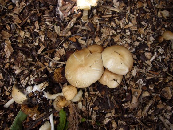 Habitus und Struktur weisen auf eine Art der Gattung Clitocybe (Trichterling) hin, allerdings kann man auf diese Entfernung und ohne Mikroskop nun wirklich nicht erkennen, welche Art das denn sein soll. Es gibt diverse weiße Trichterlinge, von denen einige aufgrund der hohen Muscarinkonzentration stark giftig sind.
