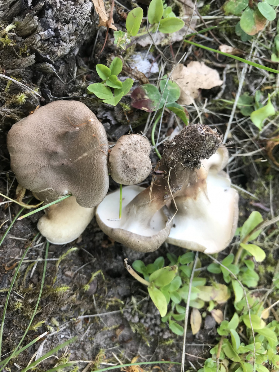 Er fast sehr zäh, wuchs etwas knäuelig mit diversen Fruchtkörpern. Die Hüte waren fein schuppig mit leichtem Buckel in der Mitte - von oben hätte ich keinen Porling vermutet. Die Stiele waren erstaunlich kräftig, auch leicht marmoriert - nach oben weiß, nach unten rotbraun. Poren waren mit bloßem Auge nicht zu erkennen.