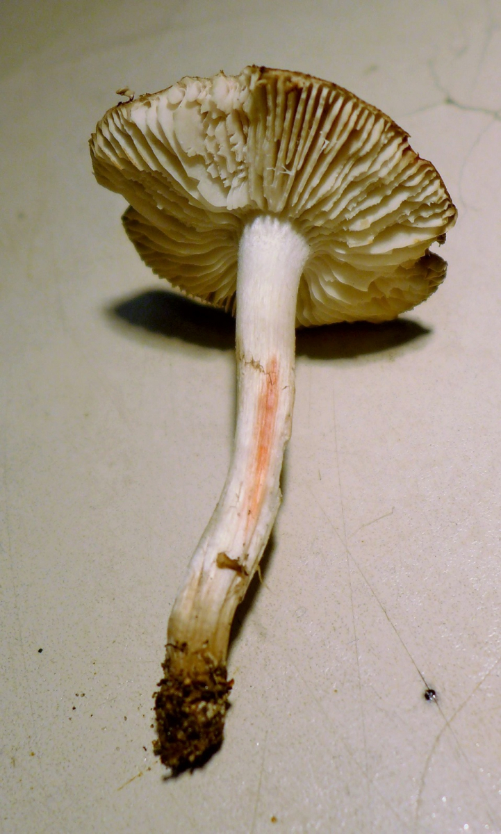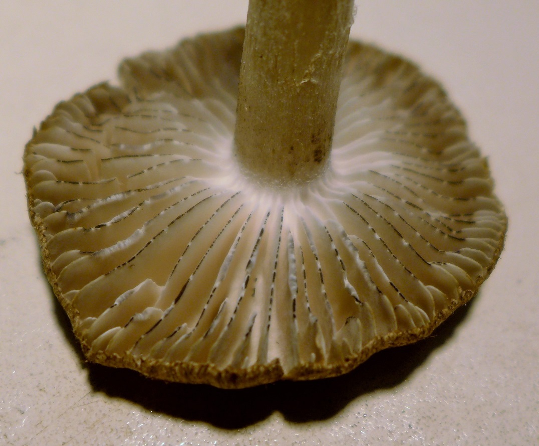 Dann heute ebenso ein paar Meter weiter ergriffen und von oben als "Erdritterling" erkannt. Plötzlich, an der Nase aber, puuh, riecht total nach Mehl. Schmeckt ebenso unangenehm mehlig/wanzig. Beim genauen Hinsehen dann: Der Hut ist gar nicht so struppig/filzig und die Lamellen sind viel heller: