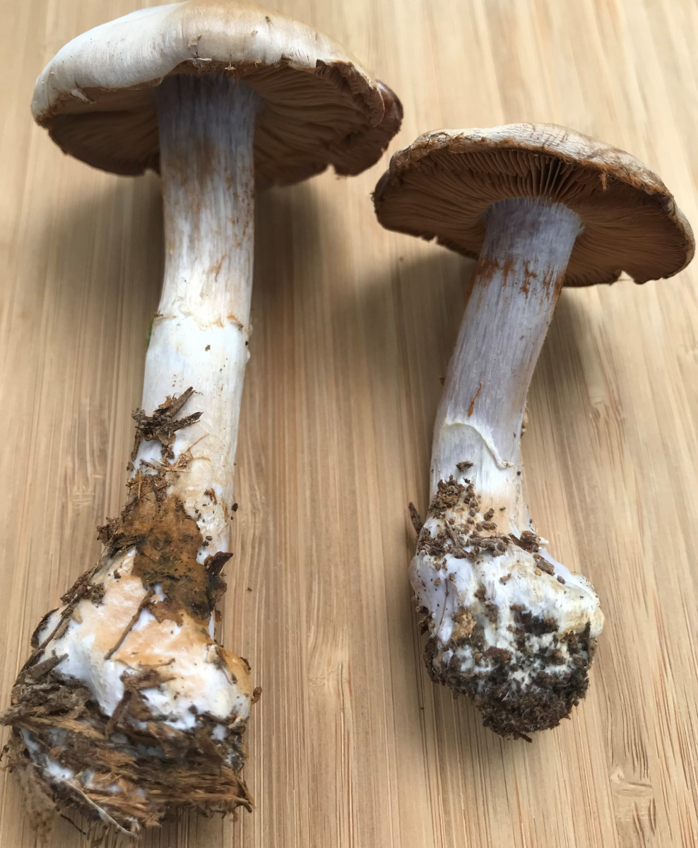 Längsstreifiger Stiel, im Querschnitt unter dem Hut deutlich lilafarben. Knolliger Fuß.