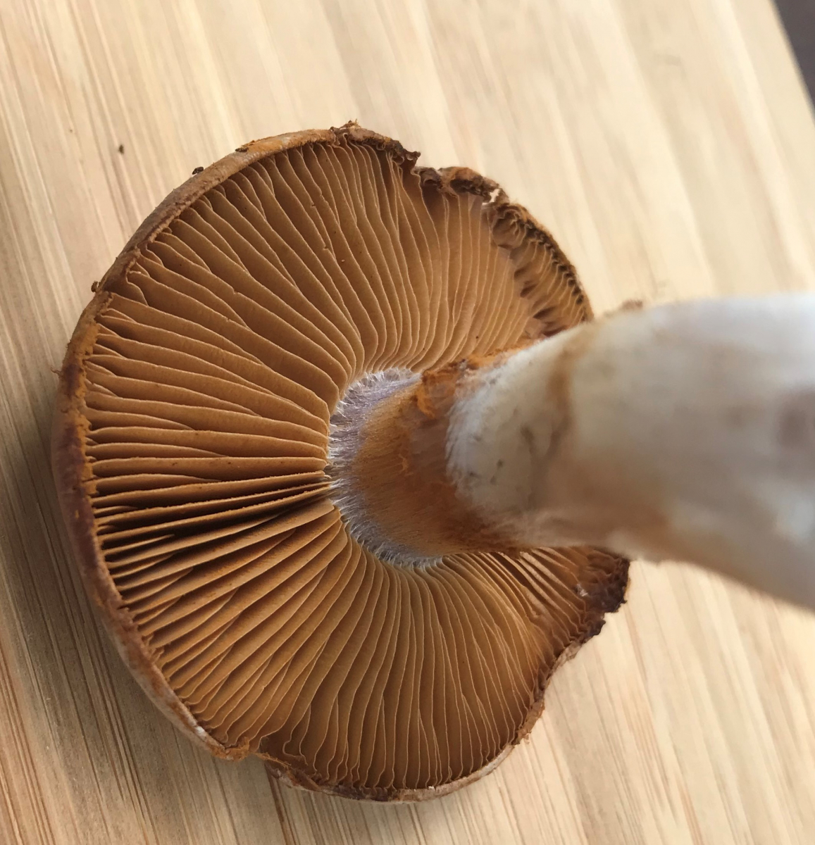 Lamellenschneiden leicht heller. Auffallend stark ausgebuchtet angewachsen.