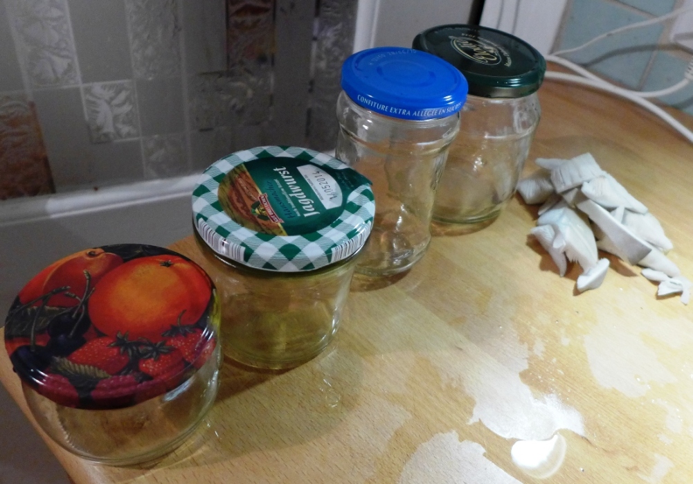 Ich nehme saubere Nutellagläser, fülle diese mit Kaffeesatz und gebe abschließend einen Schwupps Wasser drauf, schraube den Deckel locker drauf, in den in kleine Löcher gemacht habe, die wiederum mit einem dichten Filterpapier hinterlegt sind. Dann stelle ich die Nutellagläser für 5mins in kochendes Wasser, drehe danach den Deckel zu und das Glas um auf einen Filz. So kann das Wasser abfließen und das Substrat Kaffeesatz ist drastisch keimreduziert.
