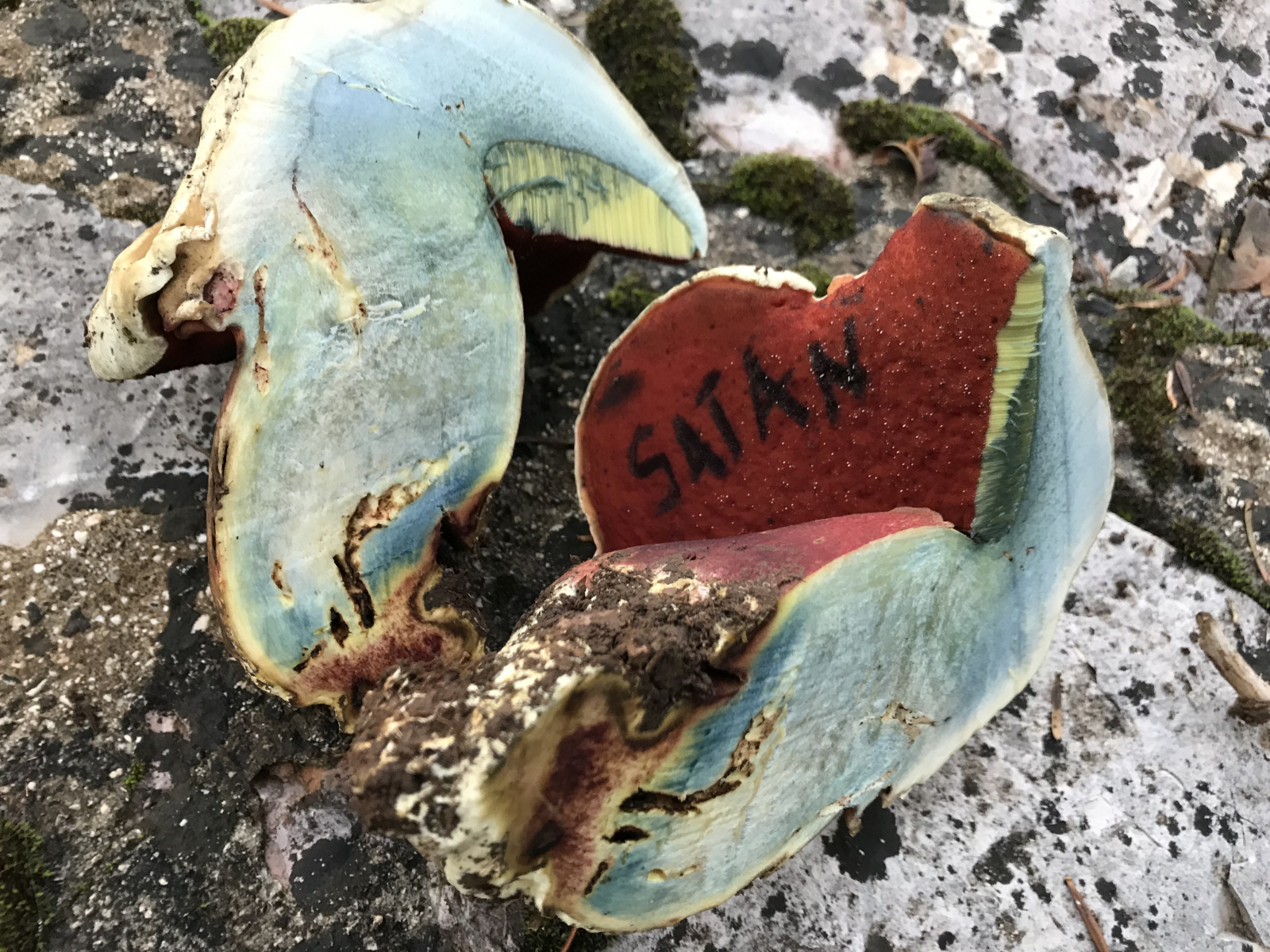 makroskopisch bin ich insbesondere bei Bild 1 rechter Aufschnitt bei Dir: rötlich im oberen Hut, blau über dem Fruchtfleisch und bläuend im Stiel - vermehrt zum Rand hin.