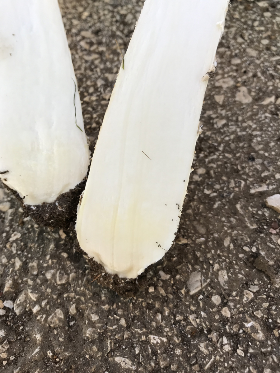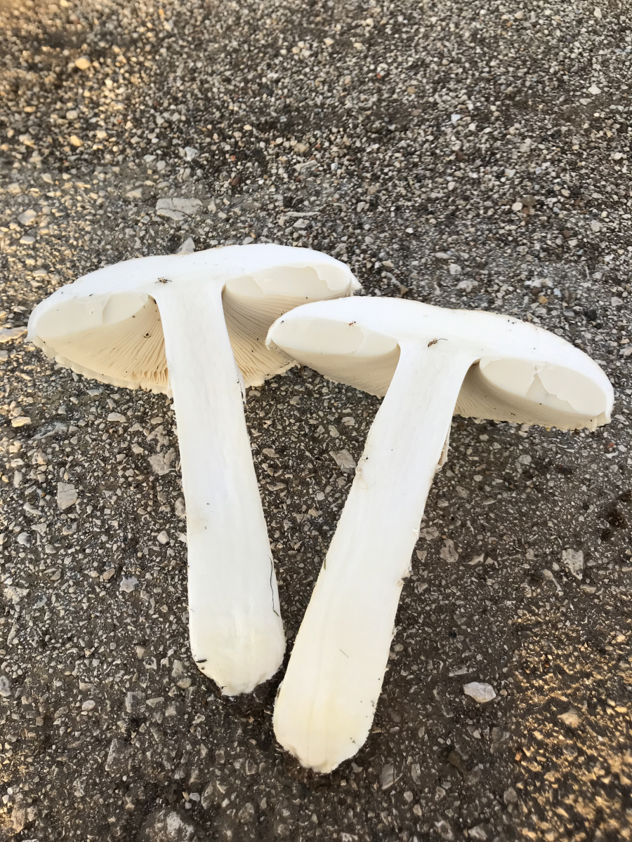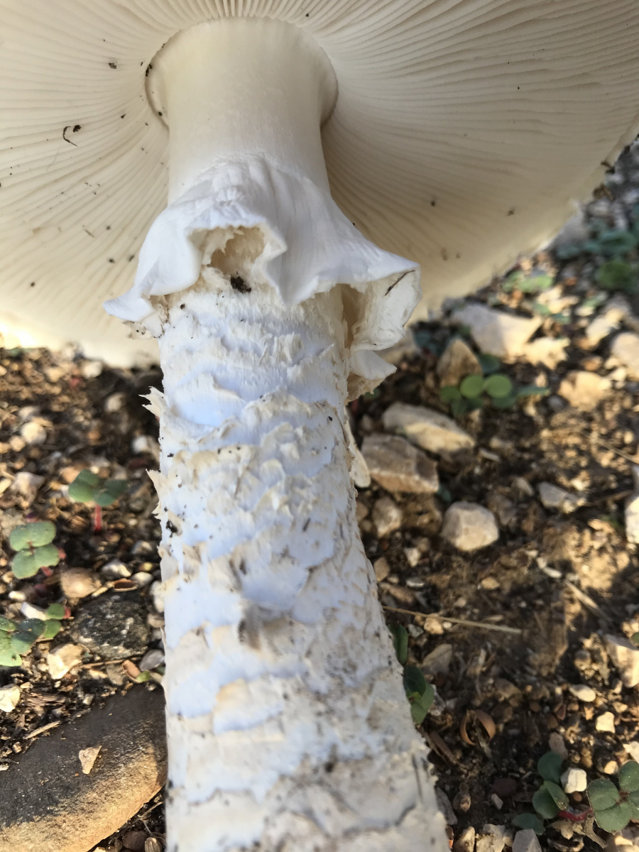 Stiel: weiß, im Alter dunkler werdend, leicht riefig mit weiß/grau-Riefen, 8cm hoch, keulig(!) unten dicker