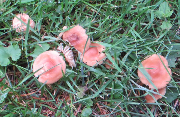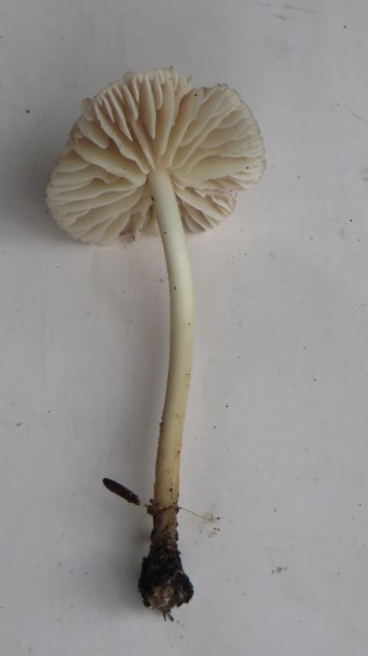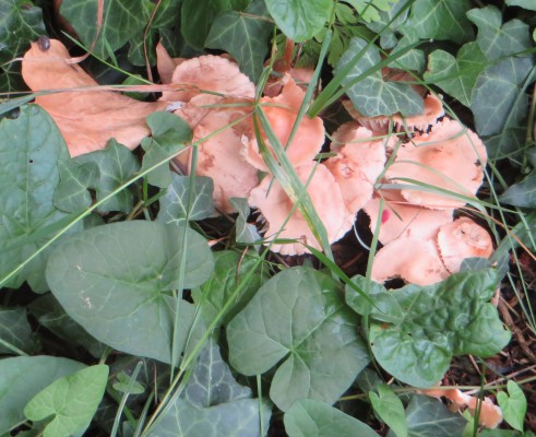 12. Die folgenden Pilze fanden sich gesellig in einer Parkanlage mit Laub- und Nadelbäumen unter einer Fichte. Bis 6 cm Hutdurchmesser, stämmig. Im Habitus einem Maipilz nicht unähnlich mit sehr dickem Hutfleisch bei sehr schmalen (der Hutform folgend herablaufenden) Lamellen. Die Pilze rochen aber nicht nach Mehl (sondern leicht unangenehm, schwach) und kamen mir auch sonst anders vor: kräftiger in der Farbe, die Lamellen etwas entfernter stehend, dicker und stahlhart (wie Hartplastik). Die Sporenpulverfarbe wird gerade bestimmt: