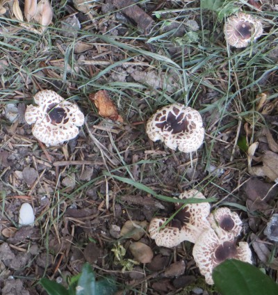 1. Der erste Pilz stand gesellig auf Fichtenstreu neben einer Buchsbaumhecke und Rosengewächsen in meinem Vorgarten, Hutdurchmesser c.a. 4 cm; ich vermute ein schwarzschuppiger Schirmpilz (Lepiota felina):