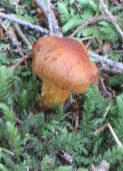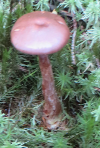 4. Ebenda der folgende Pilz mit 4-5 cm Hutdurchmesser, dessen Hut wie mit einer Kupfer-Metallic-Lackierung versehen aussah... ich vermute ein unerträglicher Schleimkopf (Cortinarius russeus):