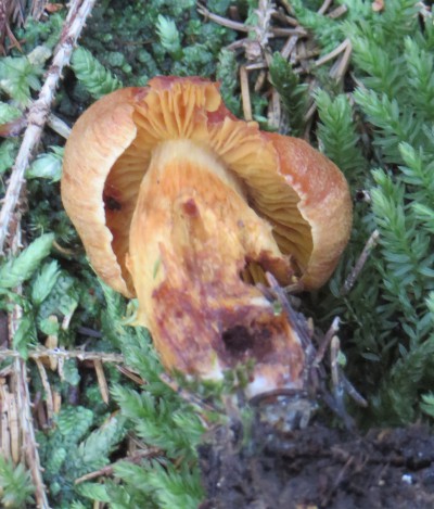 4. An der ersten Fundstelle unter Fichten waren die gesellig wachsenden Pilze von Starkregen so aufgeweicht (und auch so stark vermadet), dass ich nicht sinnvoll eine Kratzprobe auf Gilben an der Stielbasis durchführen konnte. Der älteste Pilzkörper hatte etwa 10 cm Hutdurchmesser: