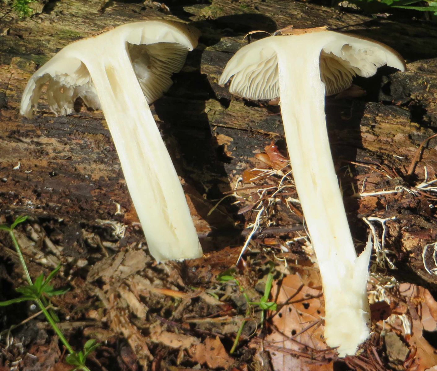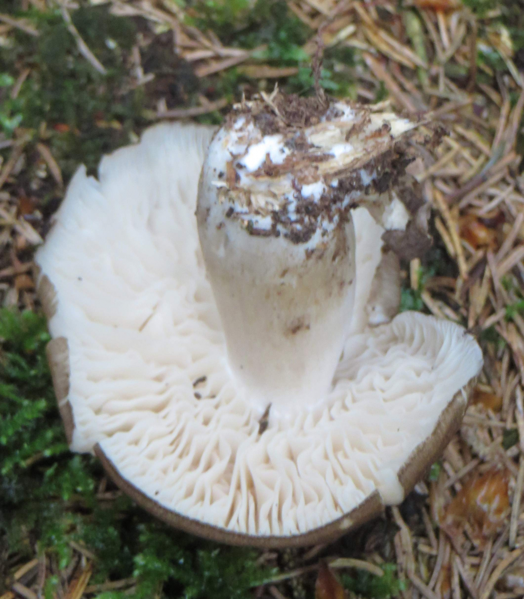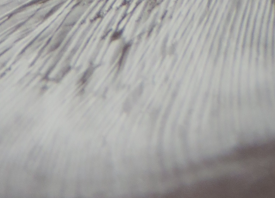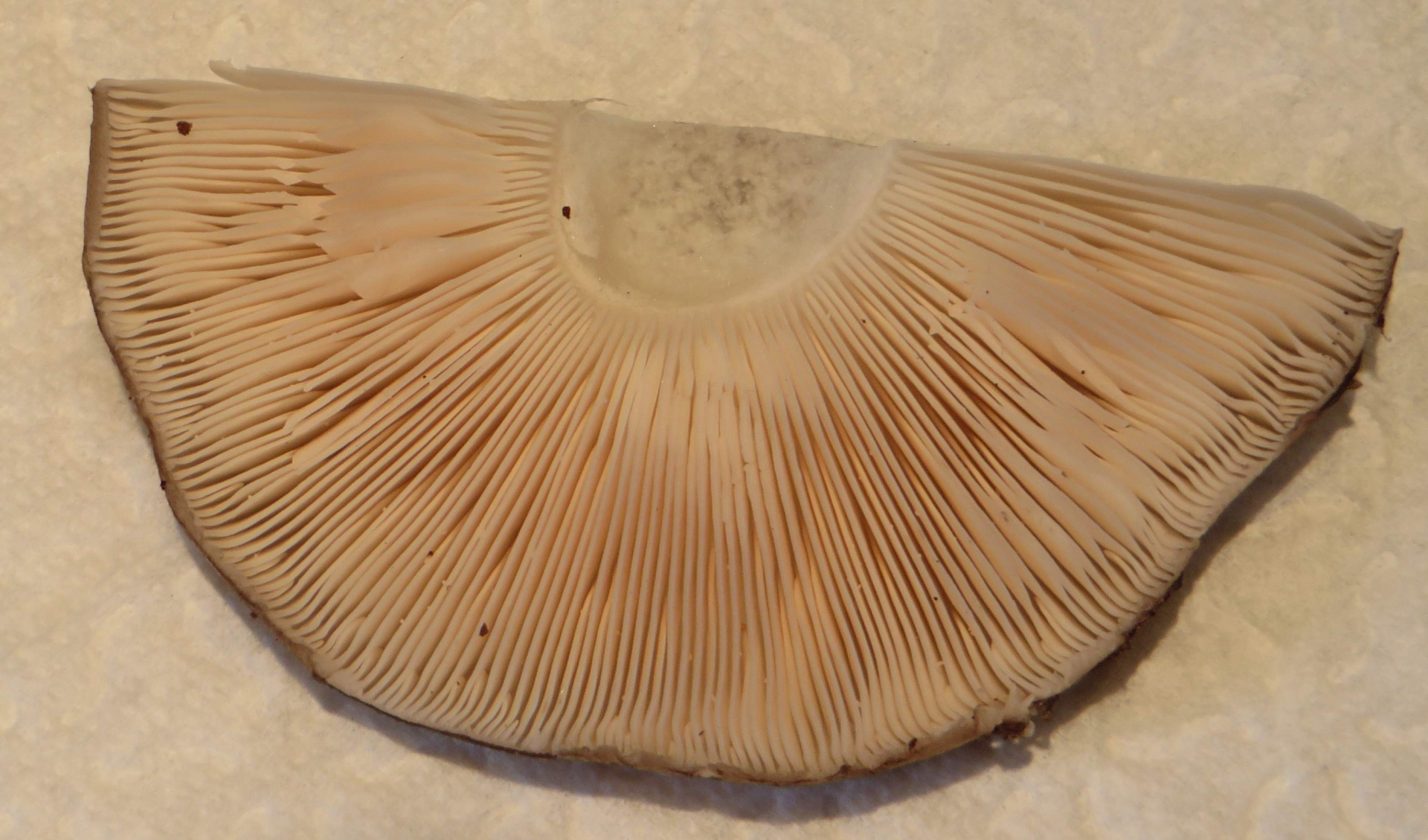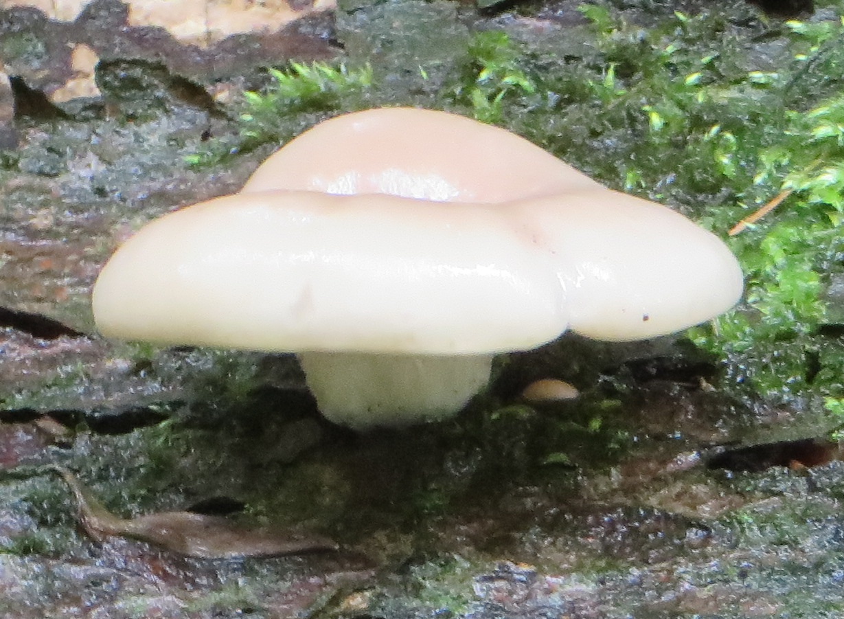 3. Die folgenden Pilze wuchsen auf morschem Totholz in einem Kiefern-Mischwald. Sie hatten bis zu 11 cm Durchmesser und waren auffällig kompakt und schwer. Die Lamellen waren sehr dick im Vergleich zum Hutfleisch und hatten recht großen Abstand voneinander; ein Paradies für um die Hundert kleiner Käfer, die sich darin versteckten und nach dem Pflücken aus dem Pilz fallen ließen... Im Vergleich zu den Lamellen der anderen hier gezeigten Pilze waren sie deutlich gelblicher. Der Hut hatte einen kleinen spitzen Buckel; Geruch unbedeutend: