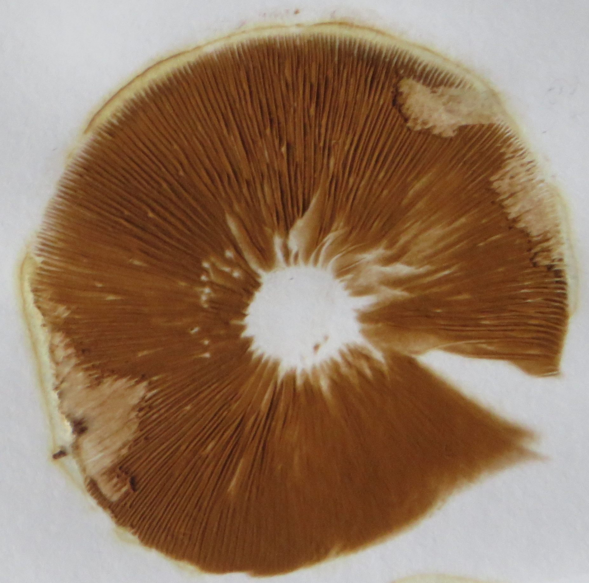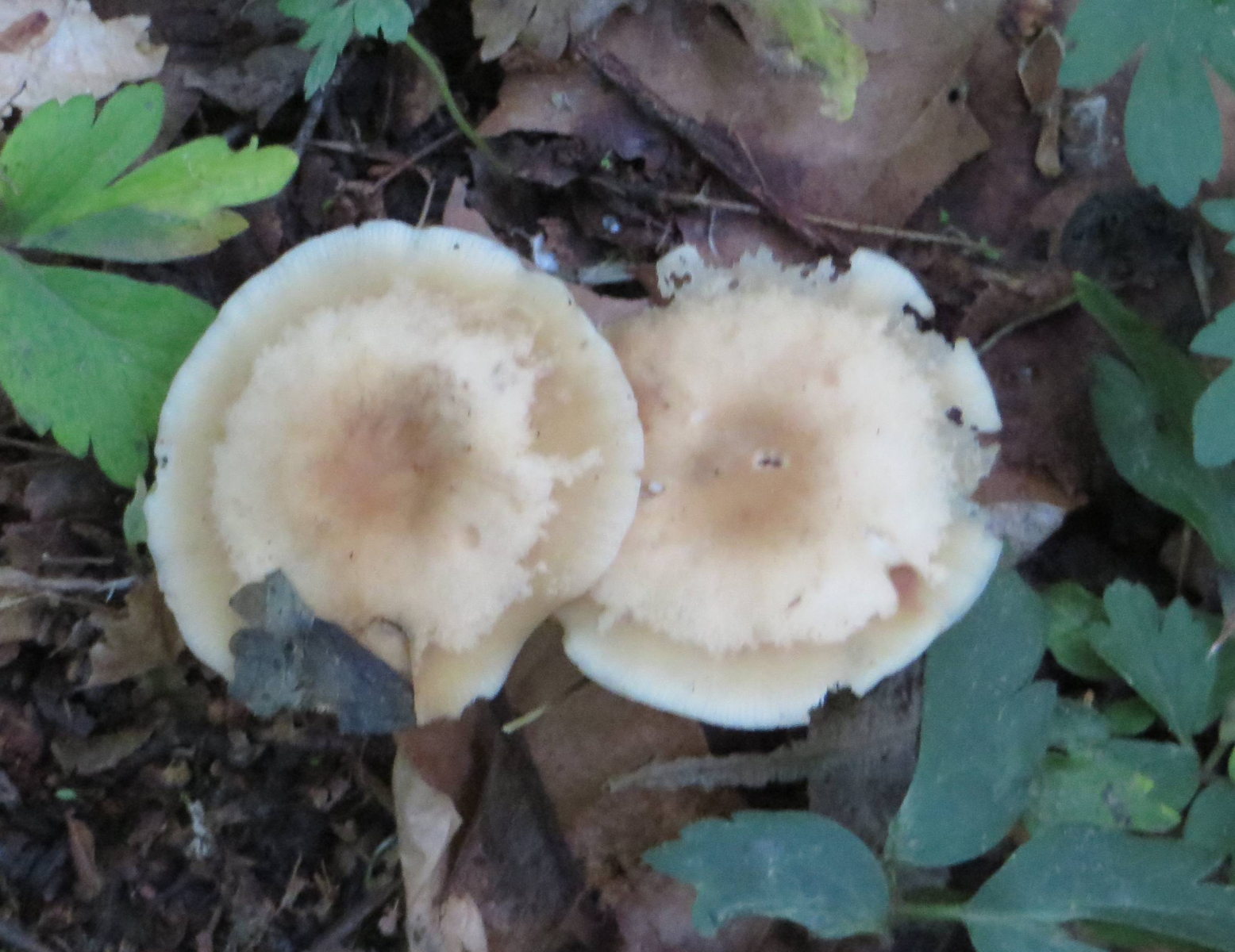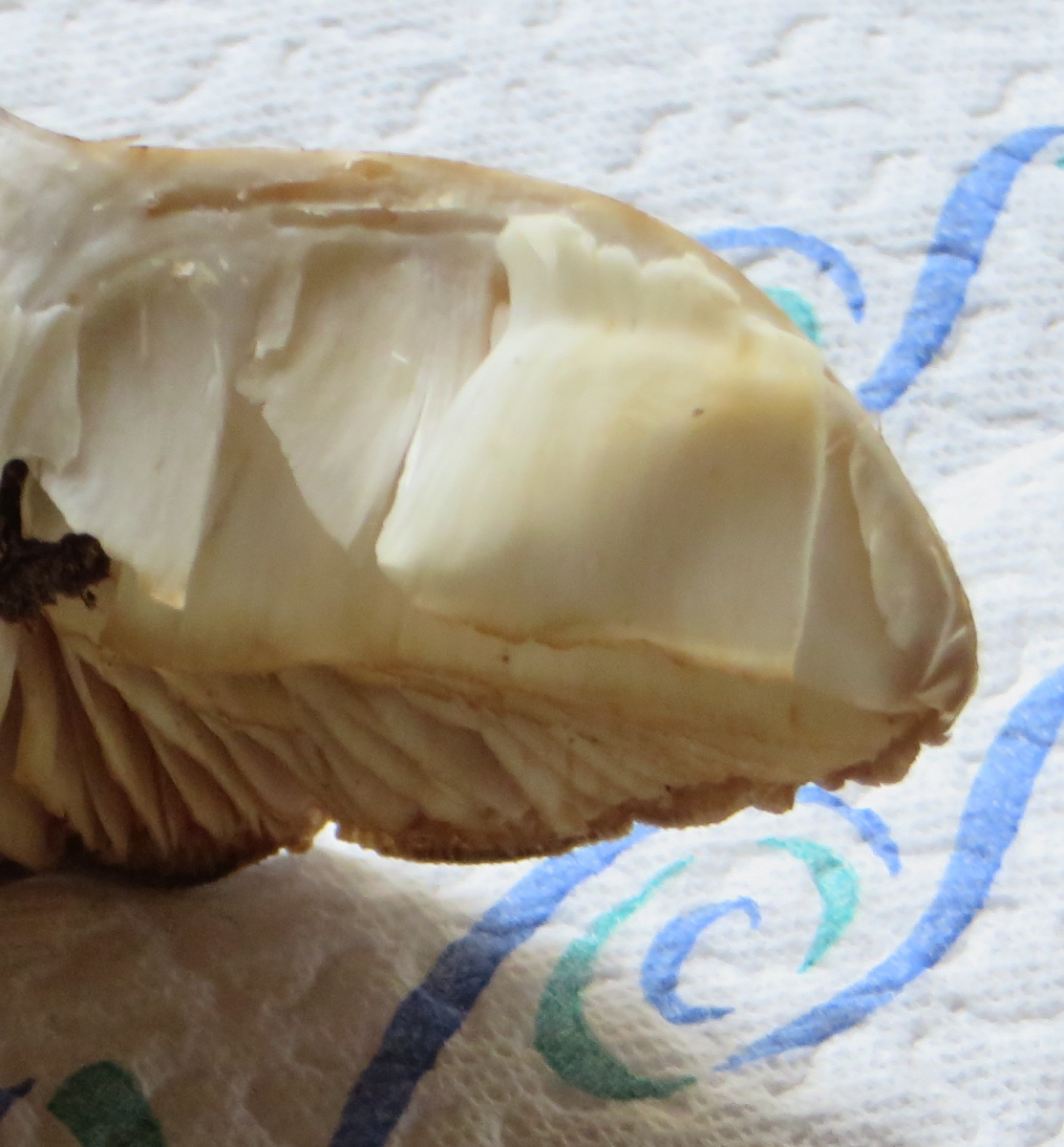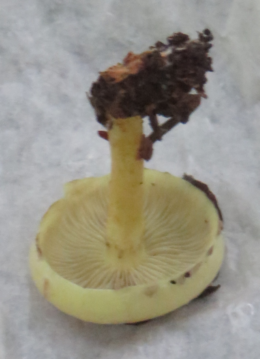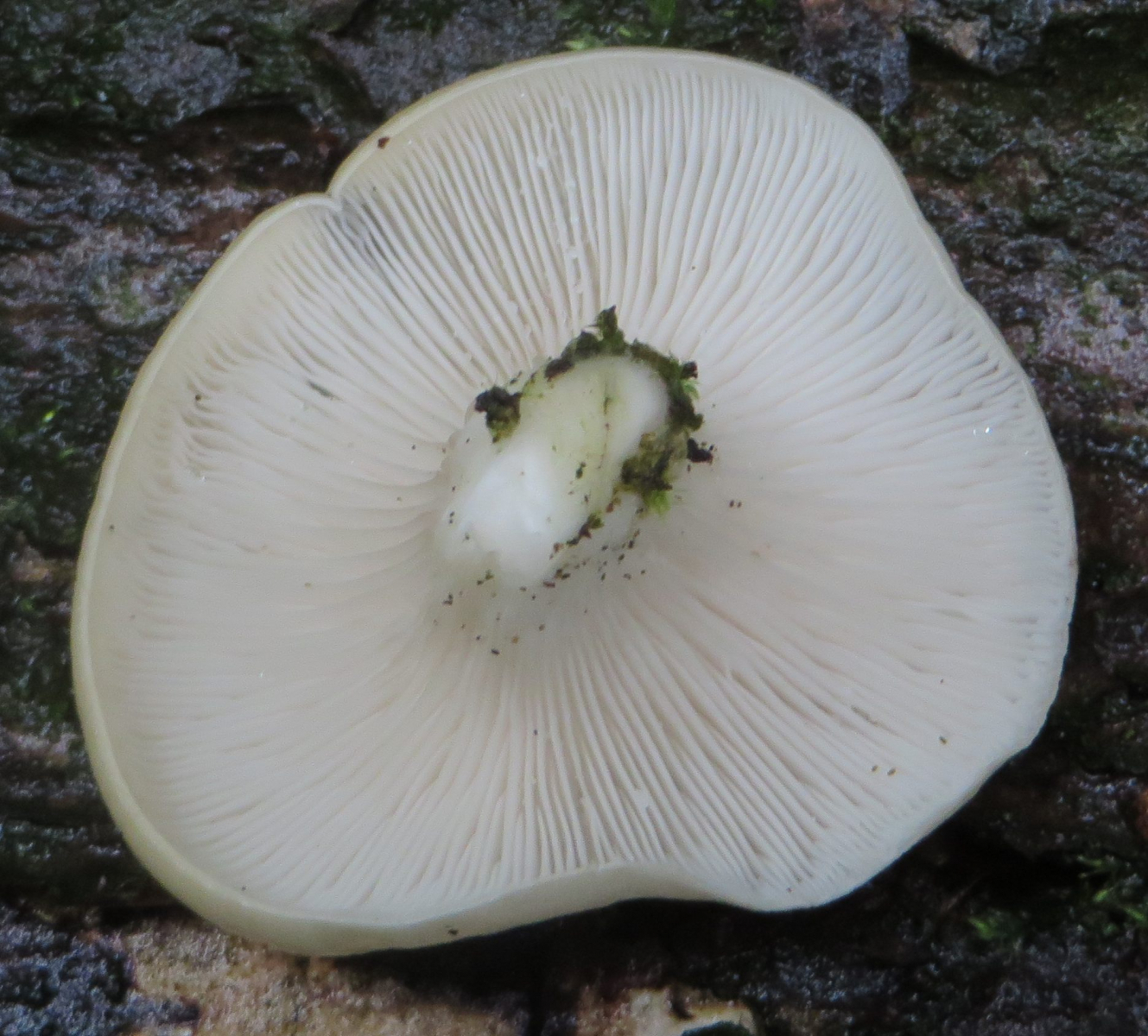 3. Die folgenden Pilze wuchsen auf morschem Totholz in einem Kiefern-Mischwald. Sie hatten bis zu 11 cm Durchmesser und waren auffällig kompakt und schwer. Die Lamellen waren sehr dick im Vergleich zum Hutfleisch und hatten recht großen Abstand voneinander; ein Paradies für um die Hundert kleiner Käfer, die sich darin versteckten und nach dem Pflücken aus dem Pilz fallen ließen... Im Vergleich zu den Lamellen der anderen hier gezeigten Pilze waren sie deutlich gelblicher. Der Hut hatte einen kleinen spitzen Buckel; Geruch unbedeutend: