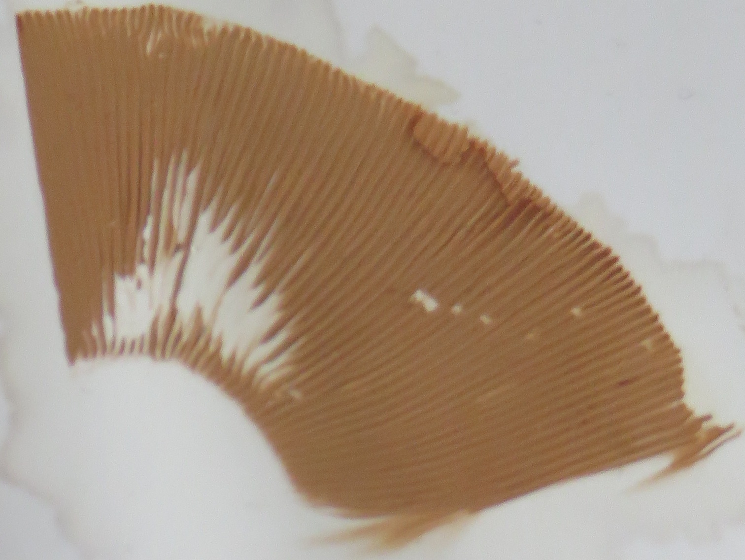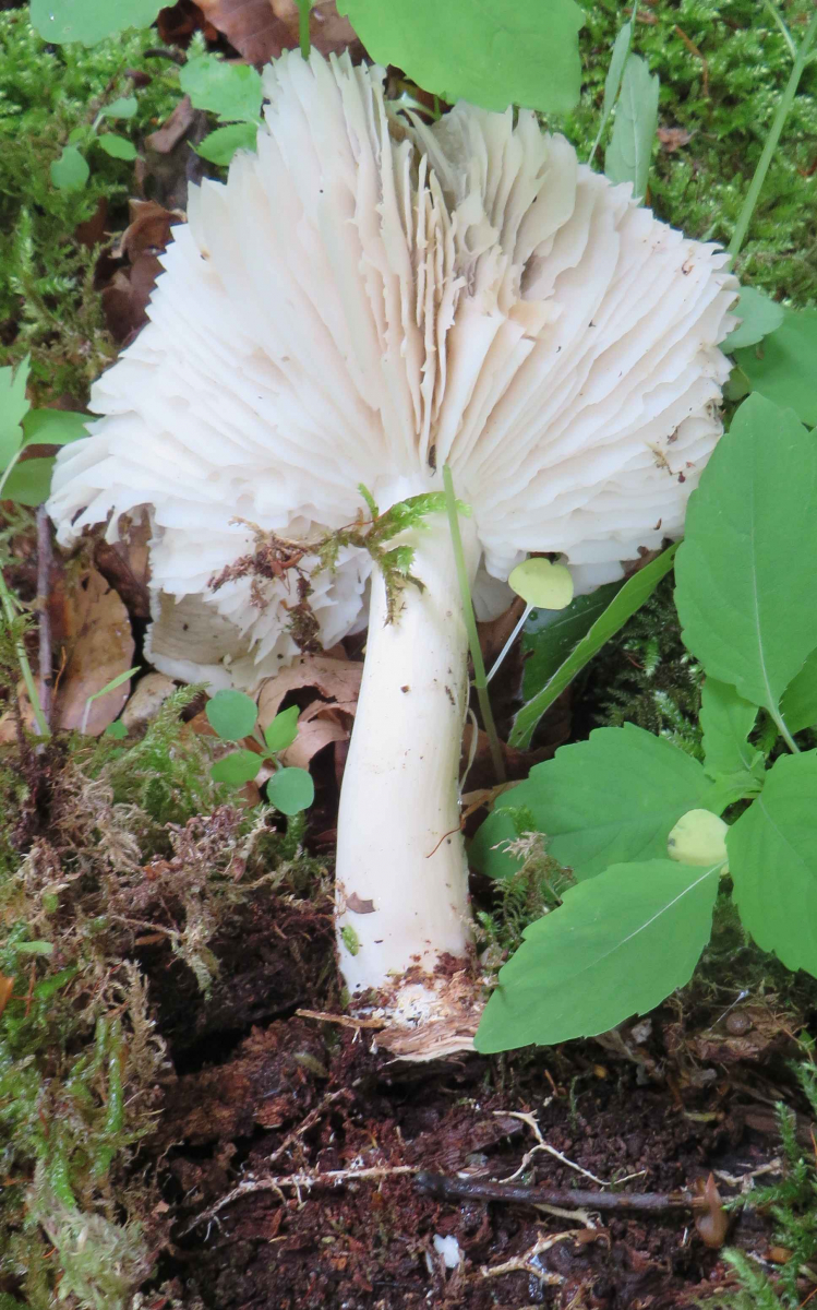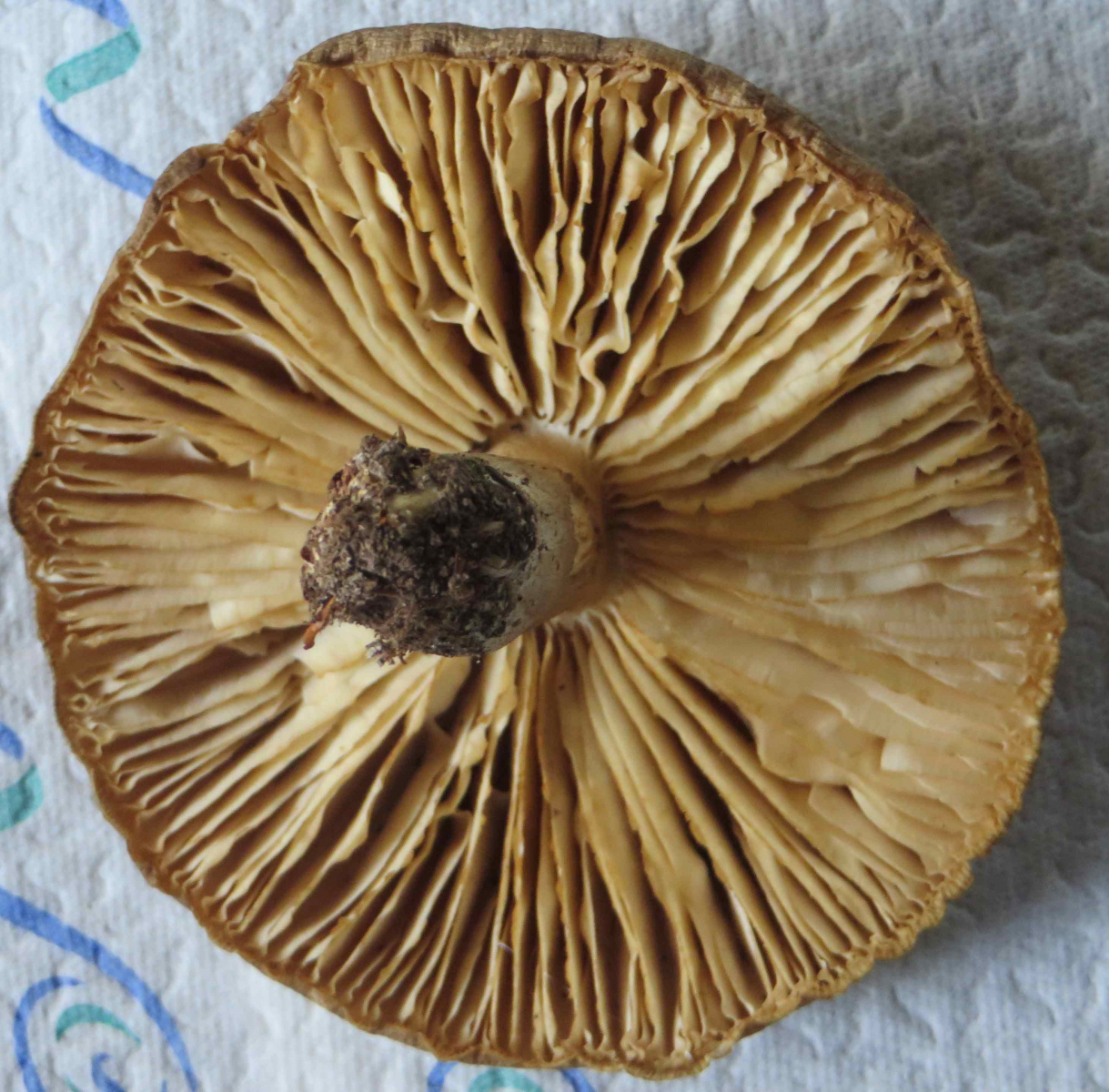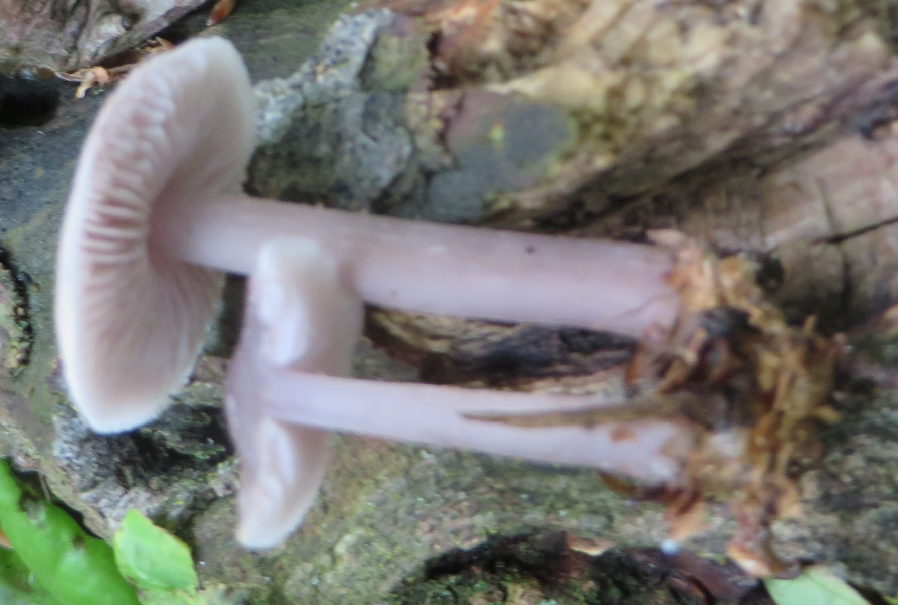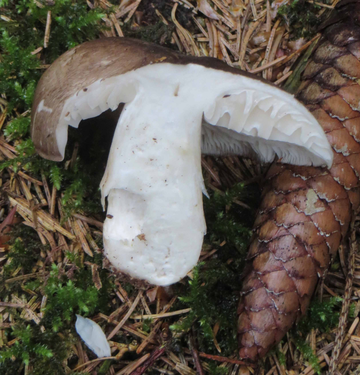 3. Die folgenden Pilze wuchsen auf morschem Totholz in einem Kiefern-Mischwald. Sie hatten bis zu 11 cm Durchmesser und waren auffällig kompakt und schwer. Die Lamellen waren sehr dick im Vergleich zum Hutfleisch und hatten recht großen Abstand voneinander; ein Paradies für um die Hundert kleiner Käfer, die sich darin versteckten und nach dem Pflücken aus dem Pilz fallen ließen... Im Vergleich zu den Lamellen der anderen hier gezeigten Pilze waren sie deutlich gelblicher. Der Hut hatte einen kleinen spitzen Buckel; Geruch unbedeutend: