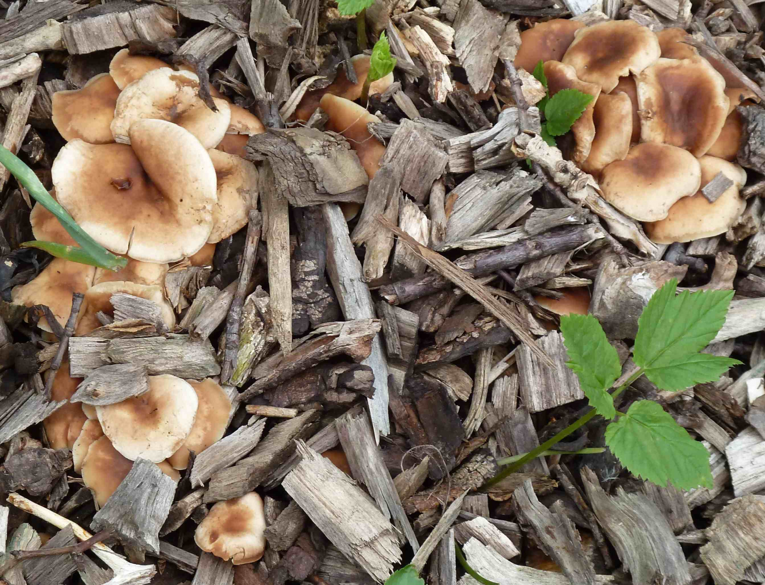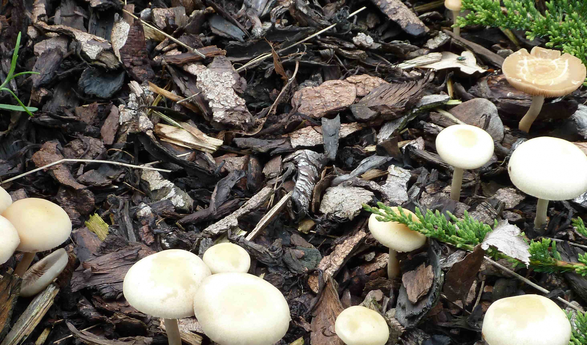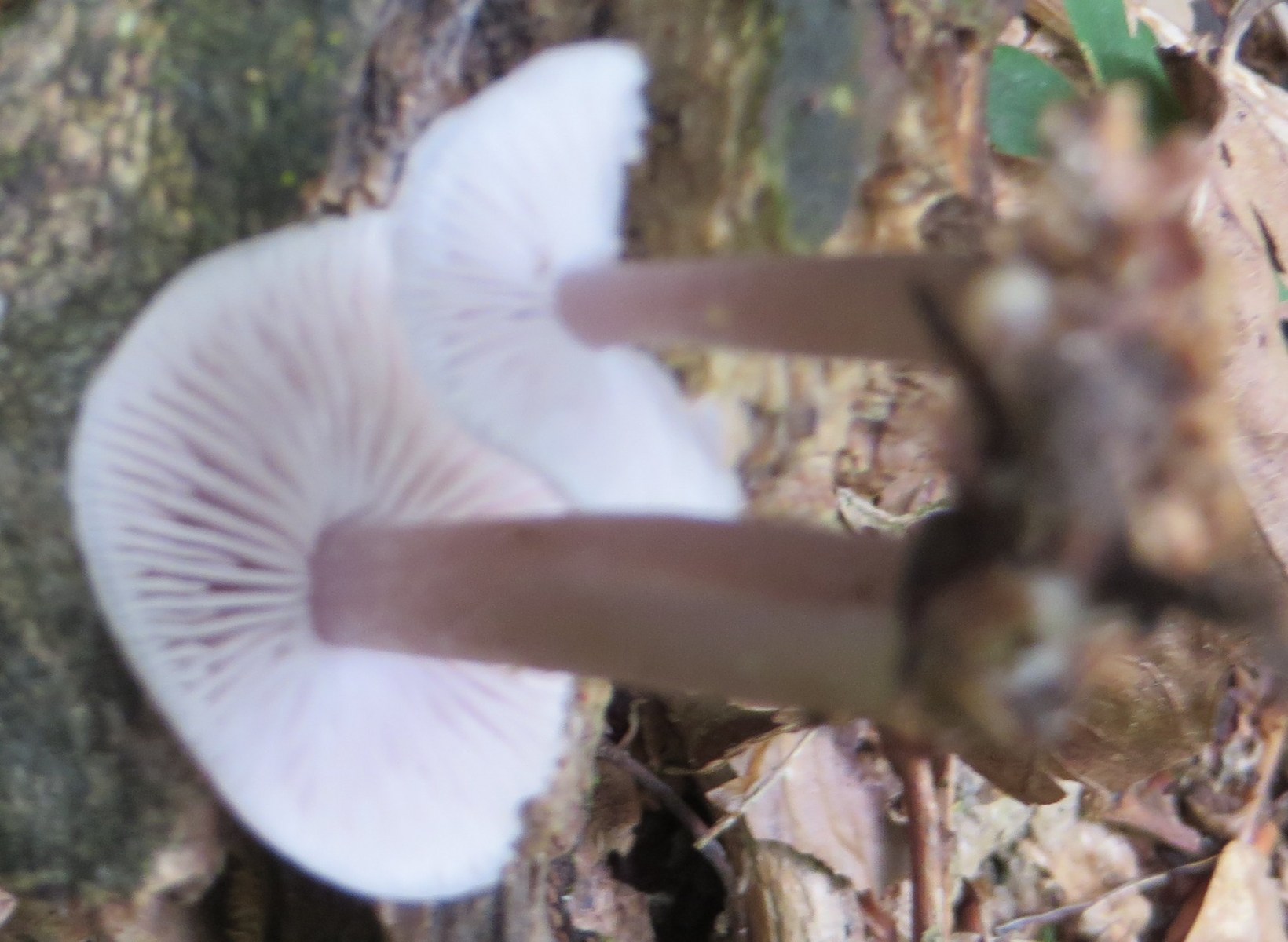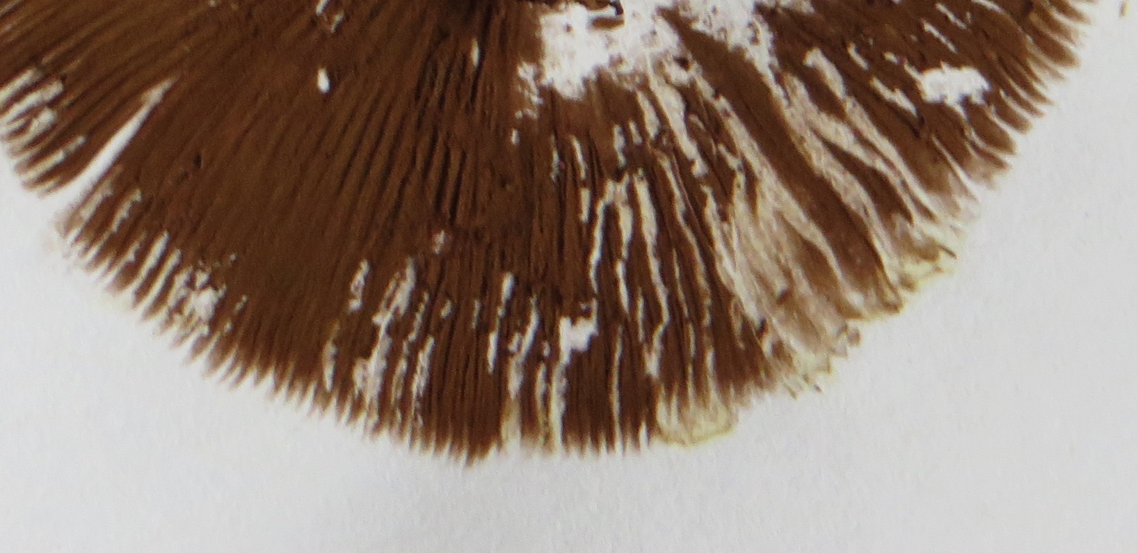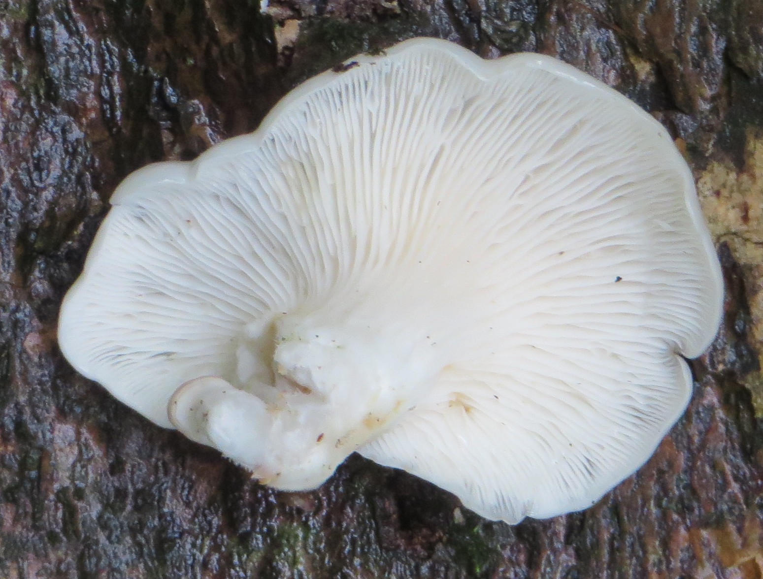 3. Die folgenden Pilze wuchsen auf morschem Totholz in einem Kiefern-Mischwald. Sie hatten bis zu 11 cm Durchmesser und waren auffällig kompakt und schwer. Die Lamellen waren sehr dick im Vergleich zum Hutfleisch und hatten recht großen Abstand voneinander; ein Paradies für um die Hundert kleiner Käfer, die sich darin versteckten und nach dem Pflücken aus dem Pilz fallen ließen... Im Vergleich zu den Lamellen der anderen hier gezeigten Pilze waren sie deutlich gelblicher. Der Hut hatte einen kleinen spitzen Buckel; Geruch unbedeutend: