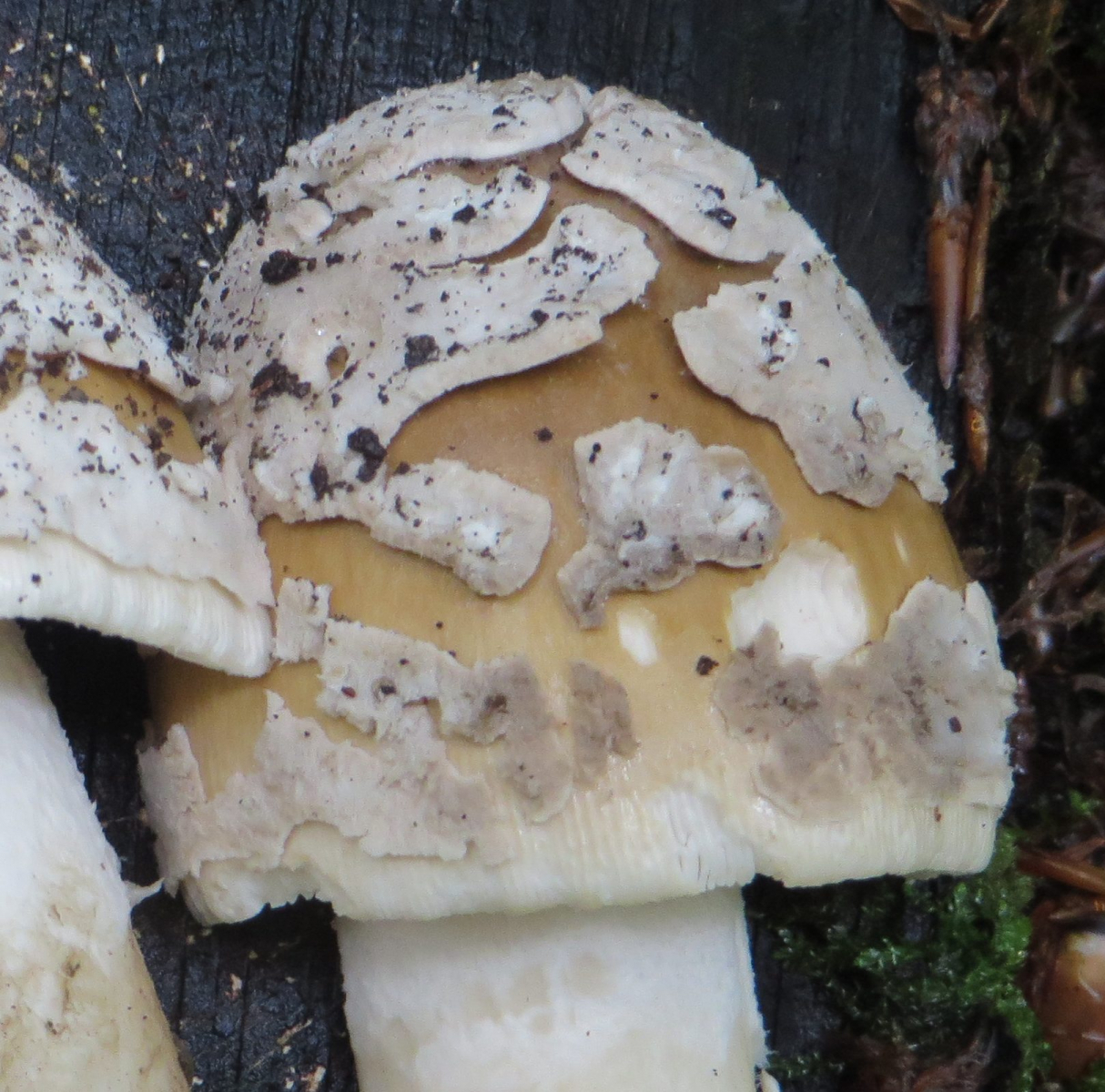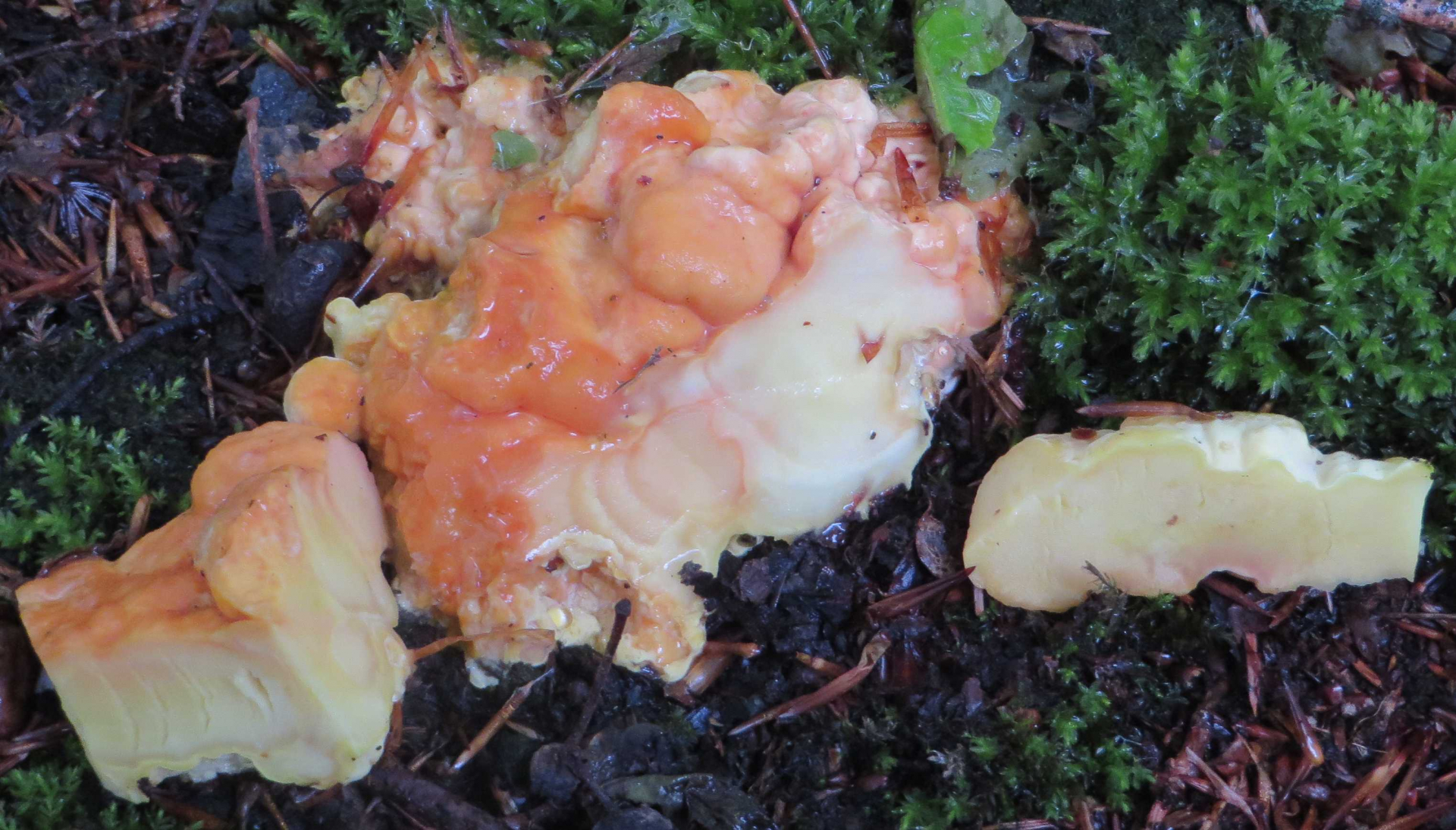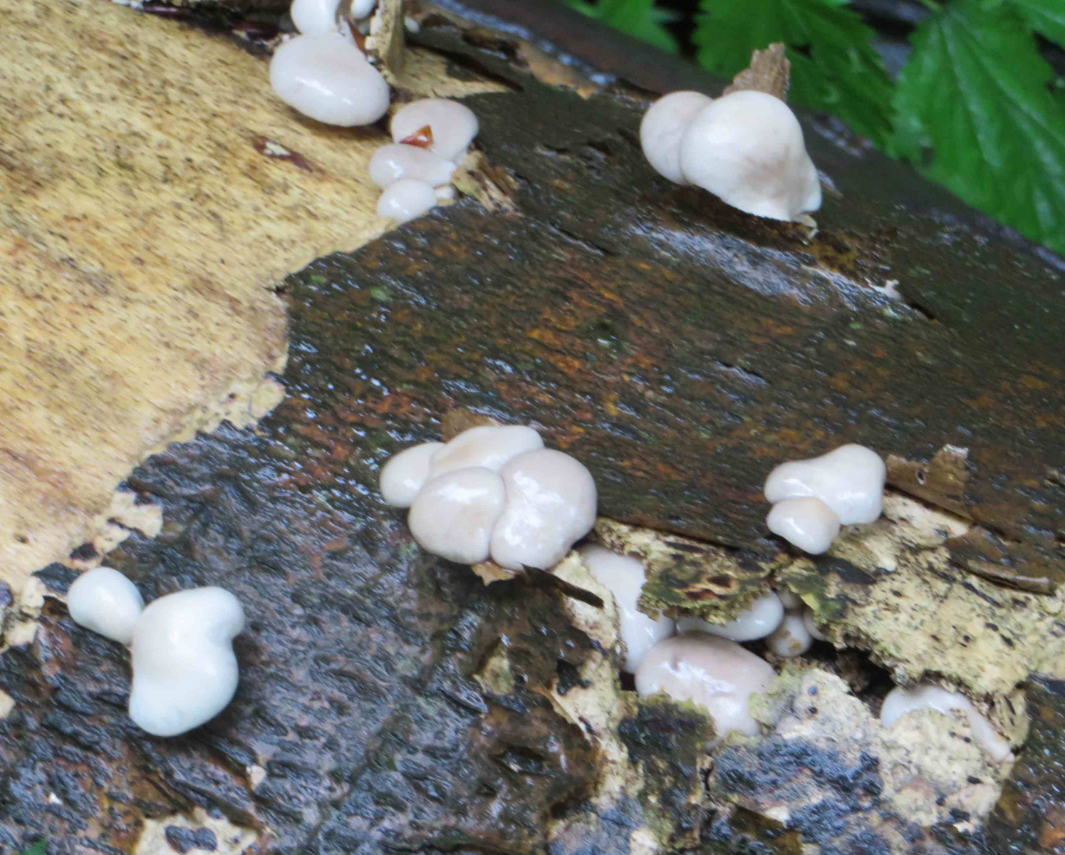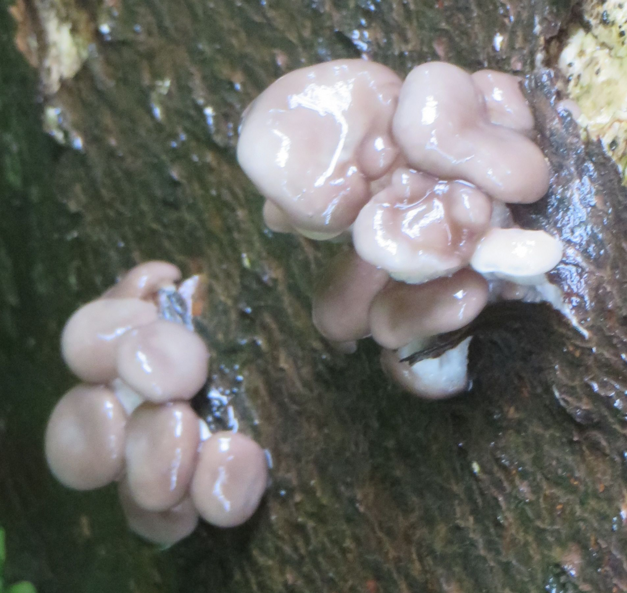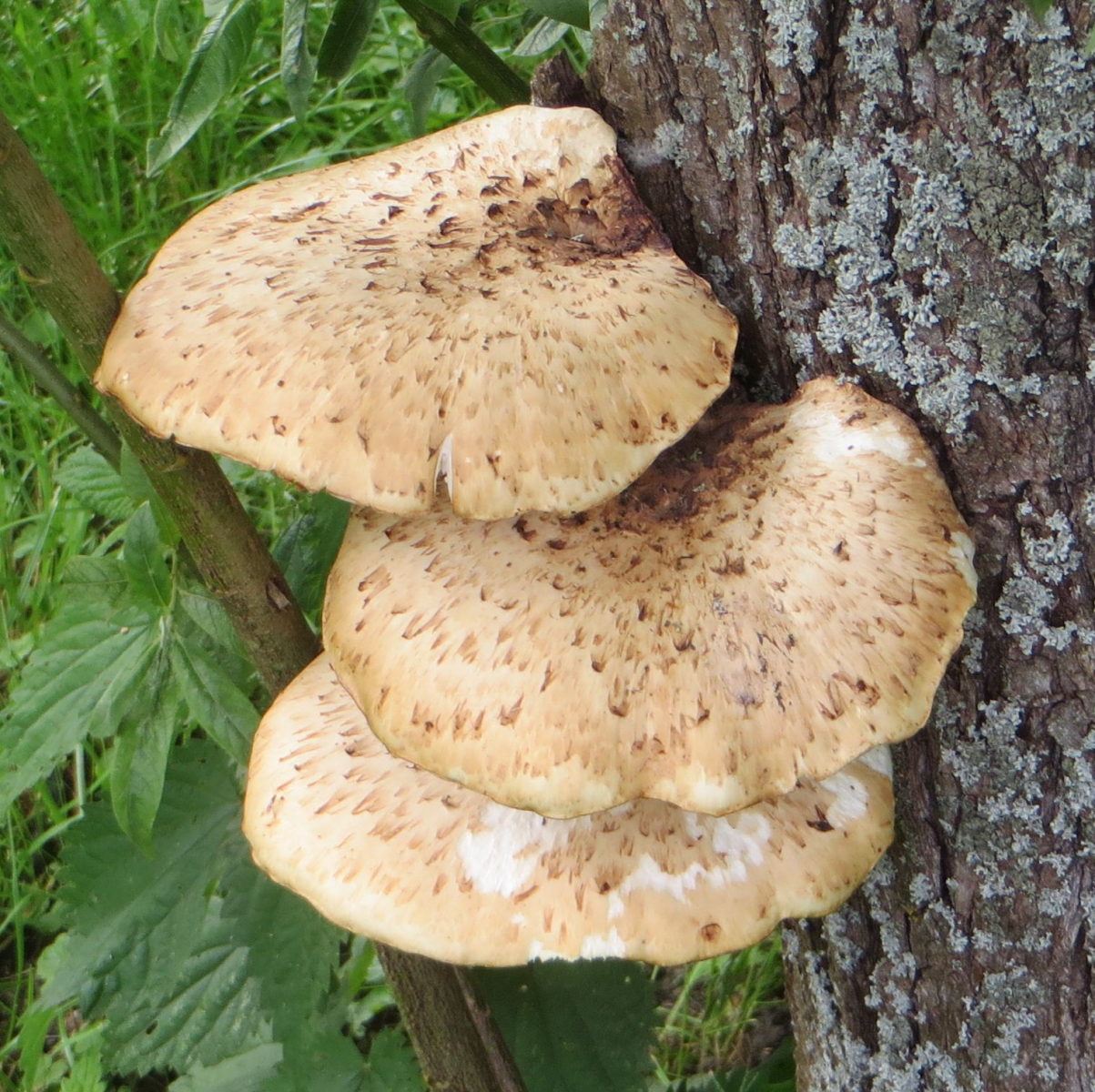 3. Die folgenden Pilze wuchsen auf morschem Totholz in einem Kiefern-Mischwald. Sie hatten bis zu 11 cm Durchmesser und waren auffällig kompakt und schwer. Die Lamellen waren sehr dick im Vergleich zum Hutfleisch und hatten recht großen Abstand voneinander; ein Paradies für um die Hundert kleiner Käfer, die sich darin versteckten und nach dem Pflücken aus dem Pilz fallen ließen... Im Vergleich zu den Lamellen der anderen hier gezeigten Pilze waren sie deutlich gelblicher. Der Hut hatte einen kleinen spitzen Buckel; Geruch unbedeutend: