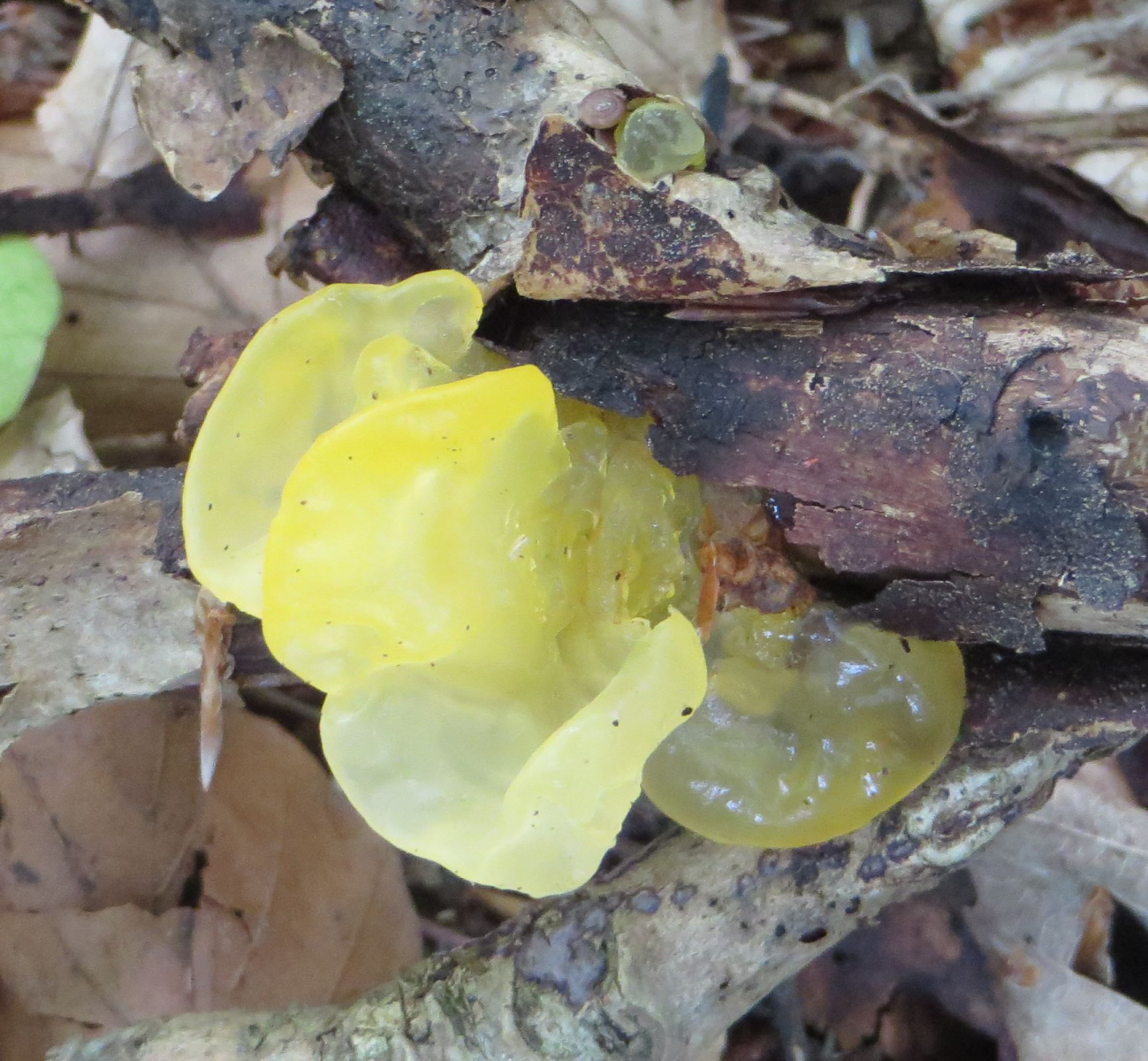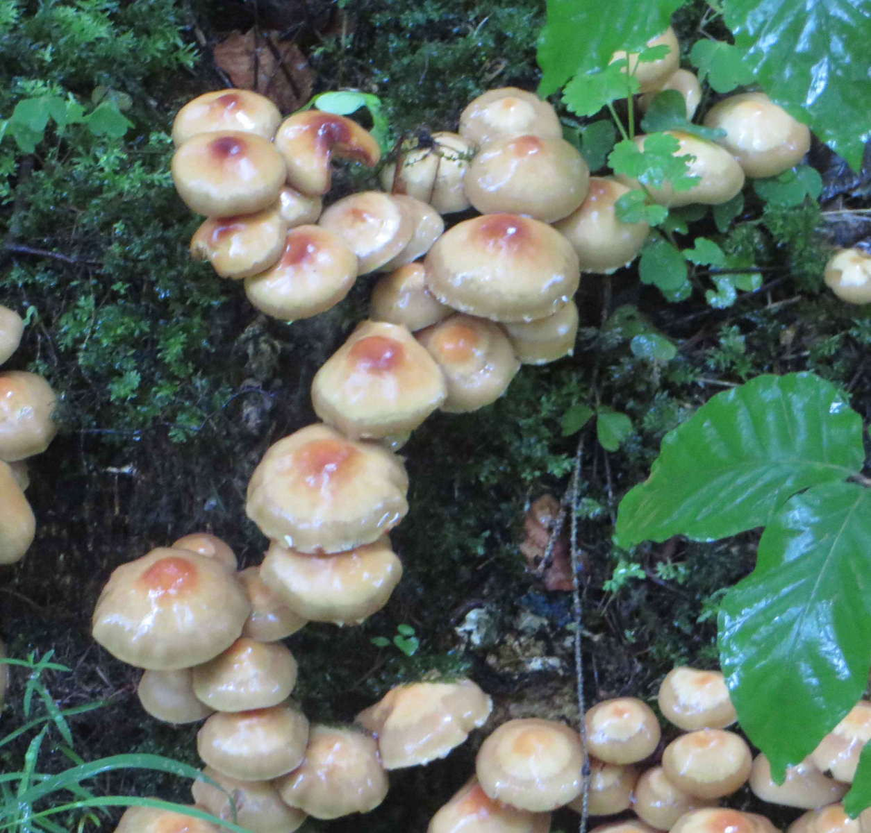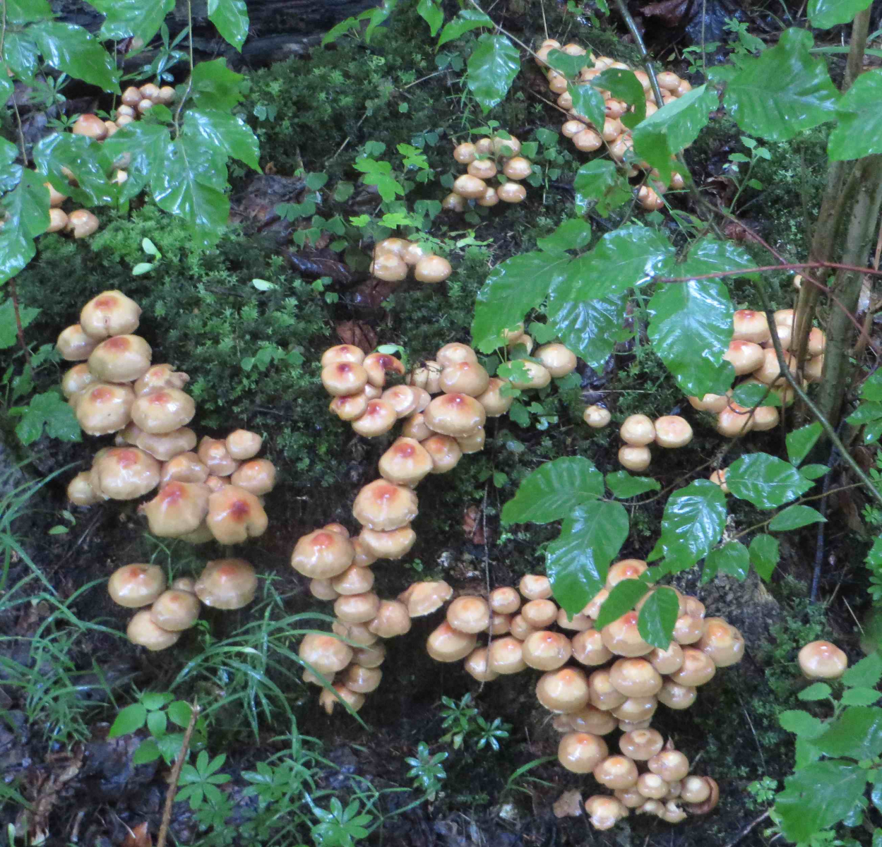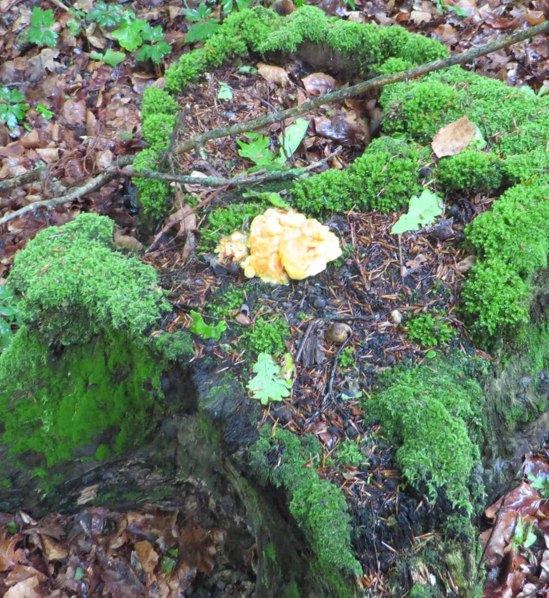 1. Hier die Fundstelle mit breitblättrigen Rüblingen auf Totholz, in einem Buchenwald: