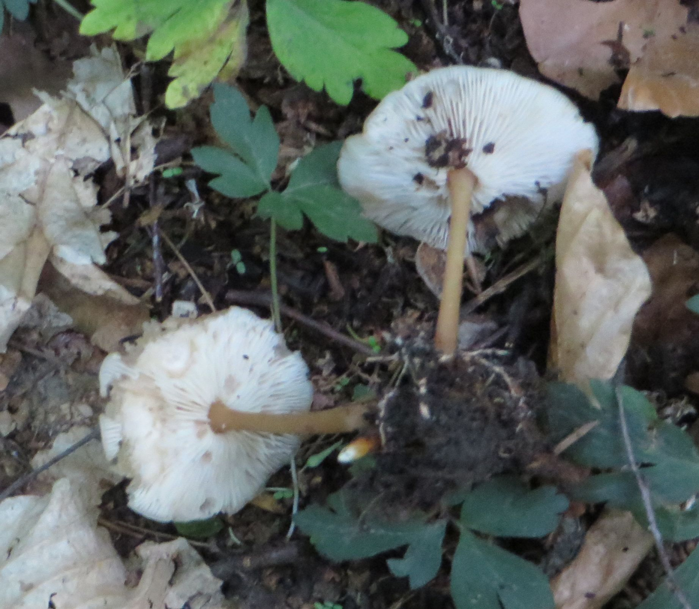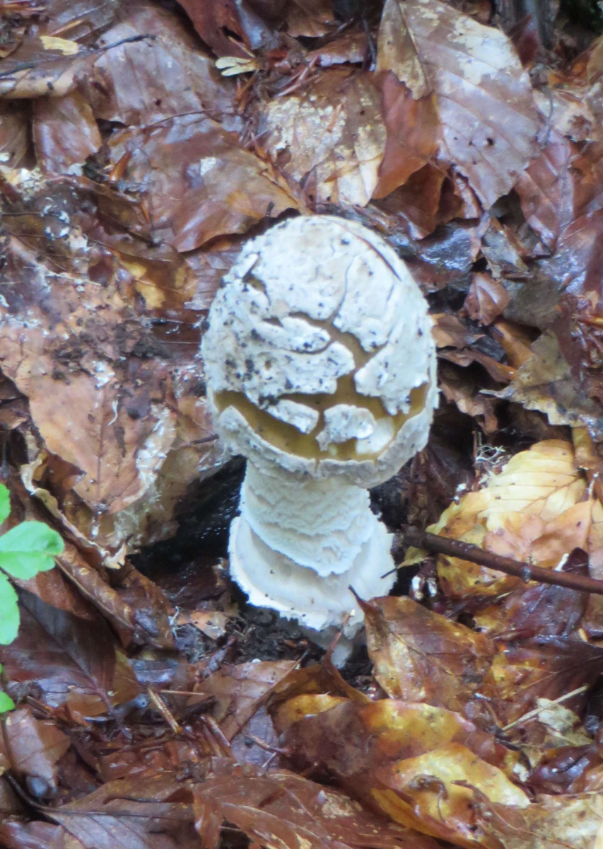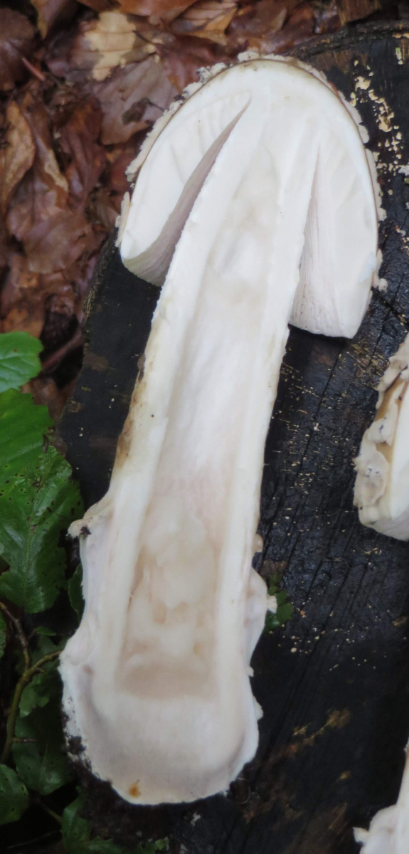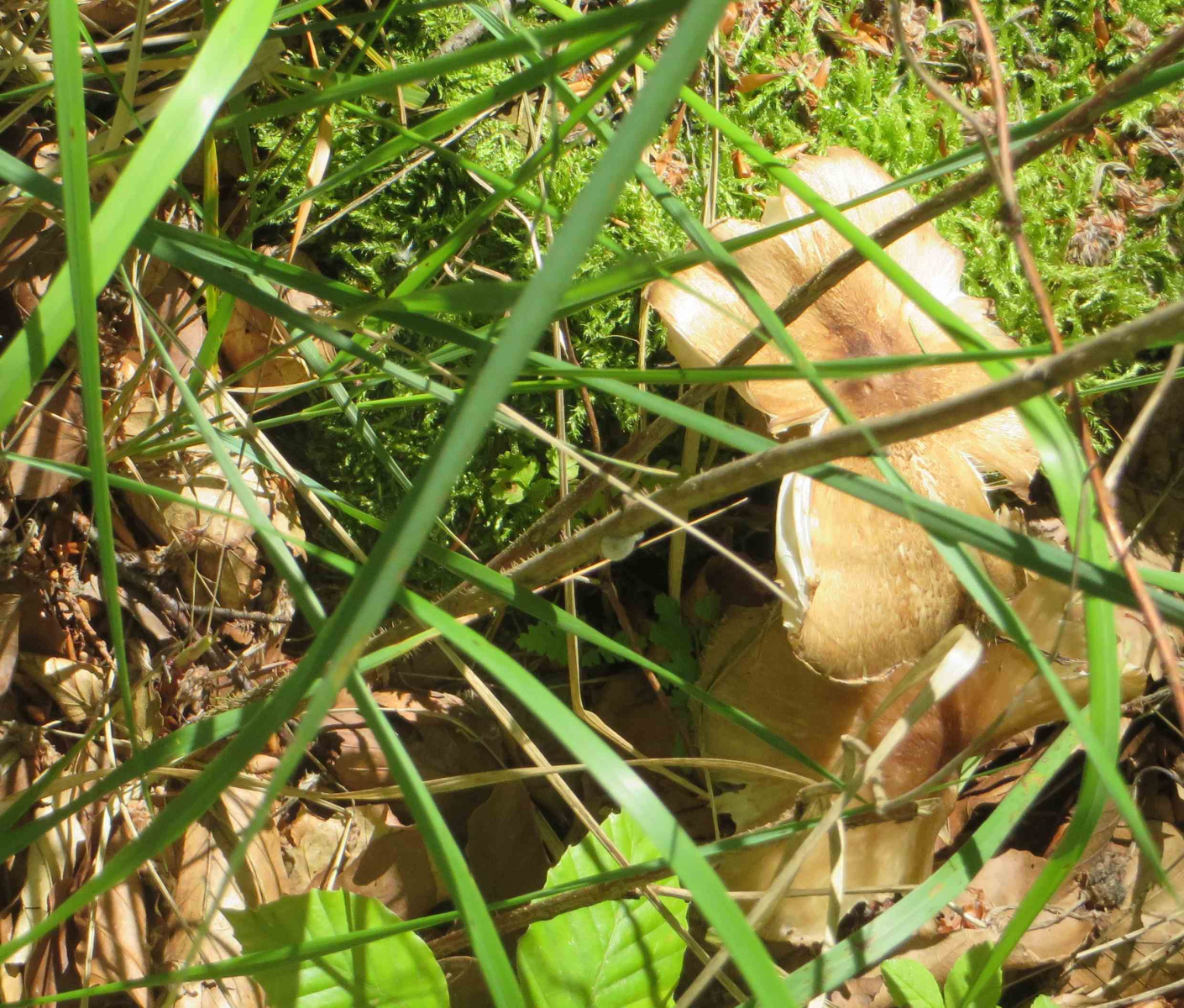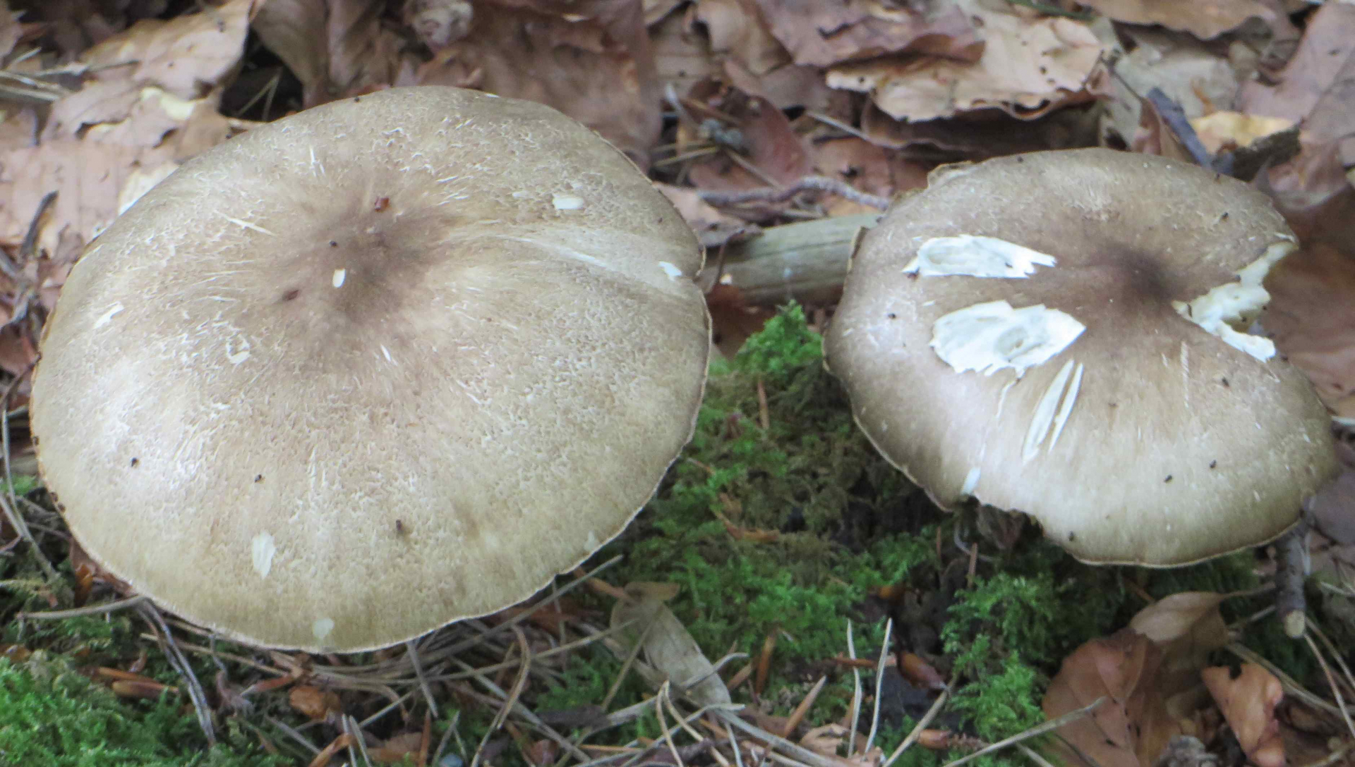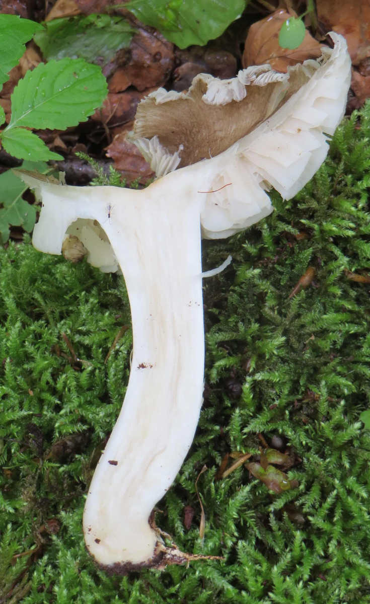 2. Die folgenden Pilze hatten 5-6 cm Durchmesser mit deutlich längeren Stielen, rissen (bei trockenem Wetter) im Alter seitlich auf, hatten schwachen (evtl. etwas süßlichen) Geruch, wuchsen im gleichen Buchenwald auf dem Erdboden: