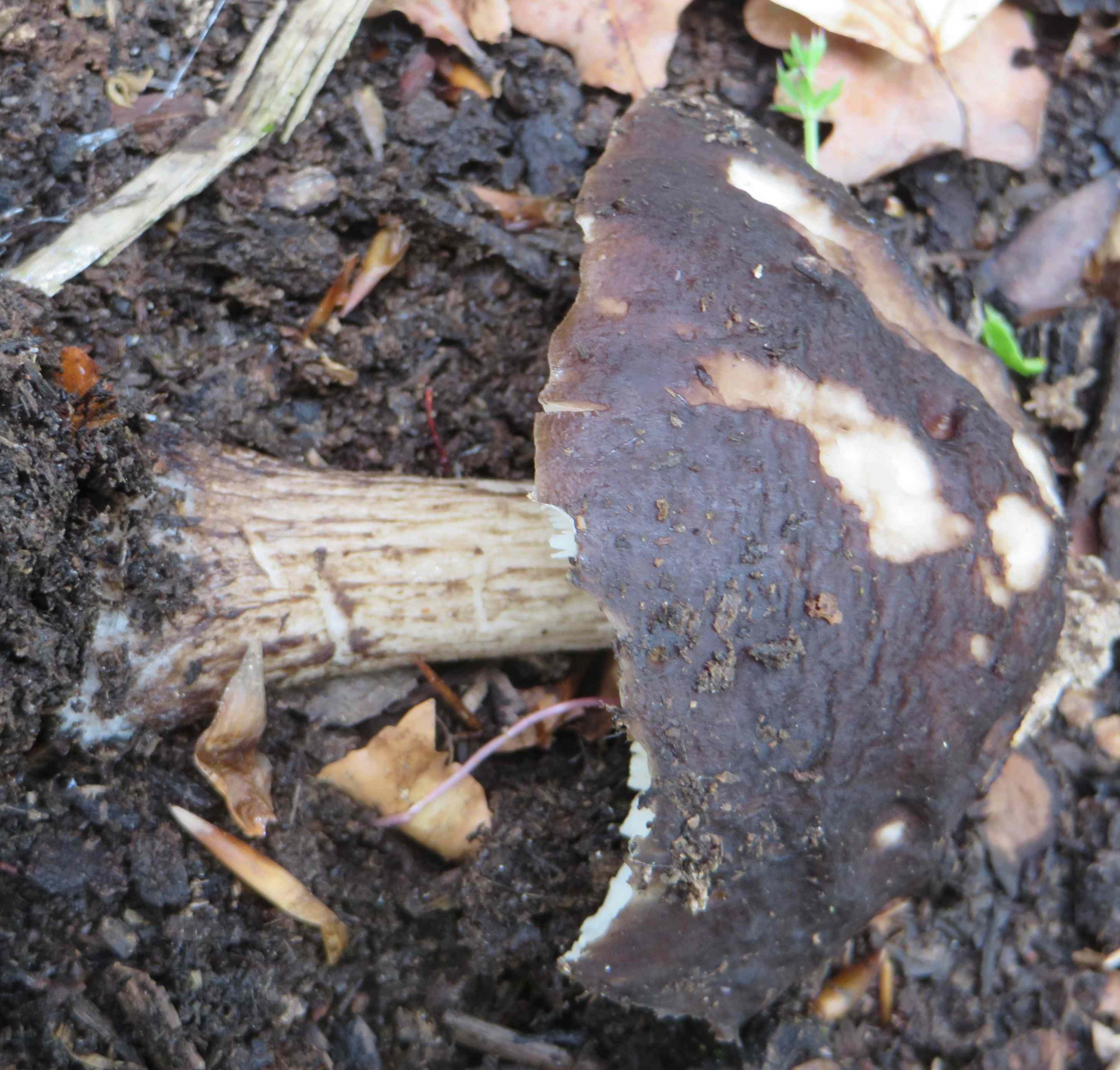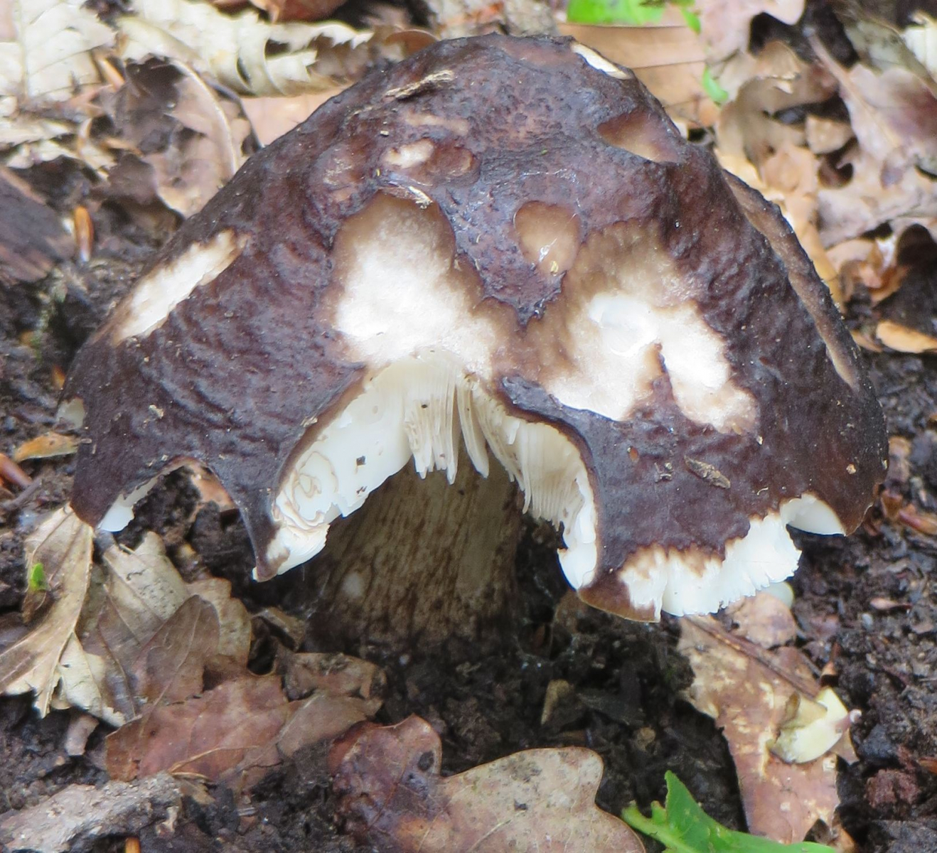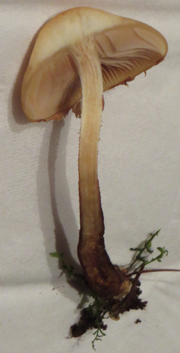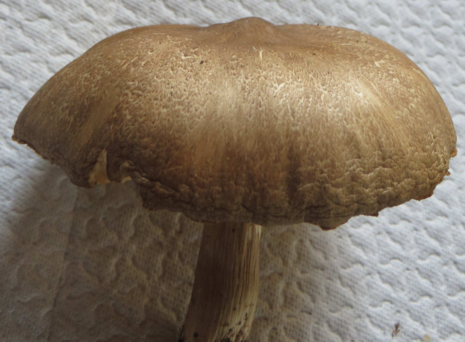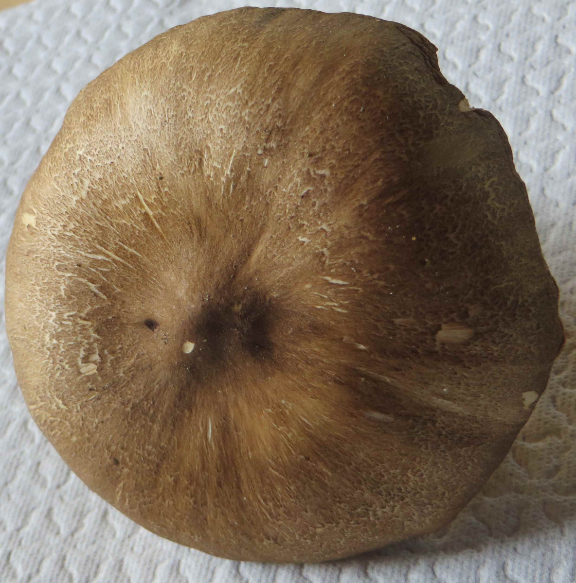 2. Die folgenden Pilze hatten 5-6 cm Durchmesser mit deutlich längeren Stielen, rissen (bei trockenem Wetter) im Alter seitlich auf, hatten schwachen (evtl. etwas süßlichen) Geruch, wuchsen im gleichen Buchenwald auf dem Erdboden: