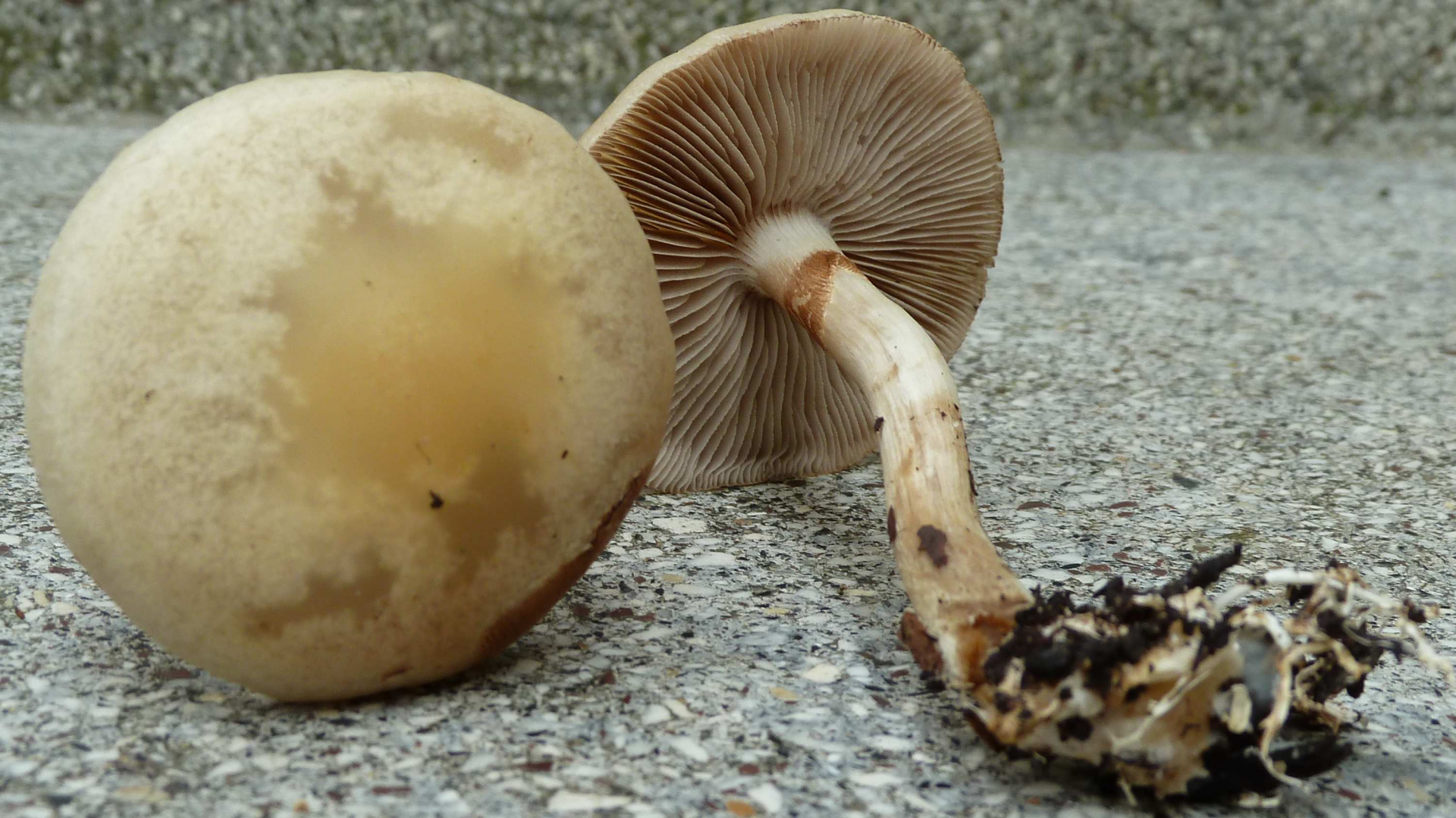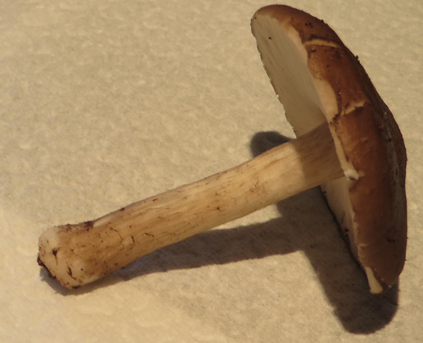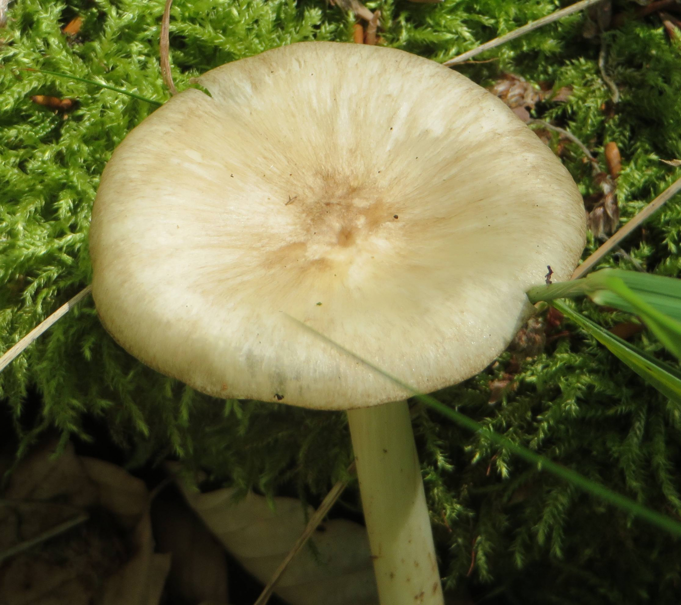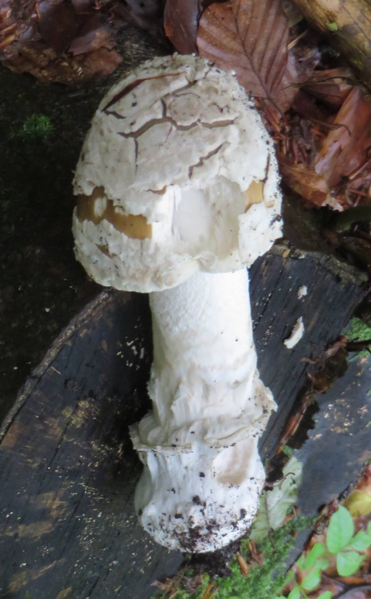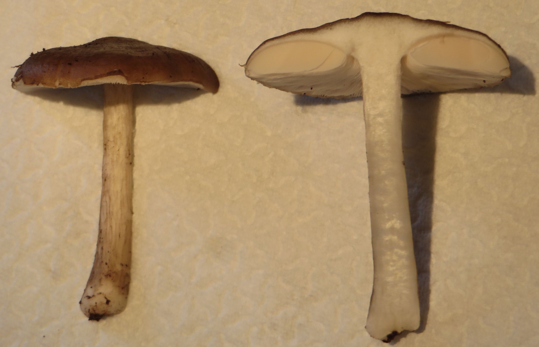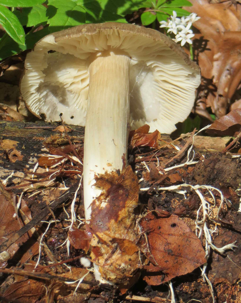 2. Die folgenden Pilze hatten 5-6 cm Durchmesser mit deutlich längeren Stielen, rissen (bei trockenem Wetter) im Alter seitlich auf, hatten schwachen (evtl. etwas süßlichen) Geruch, wuchsen im gleichen Buchenwald auf dem Erdboden: