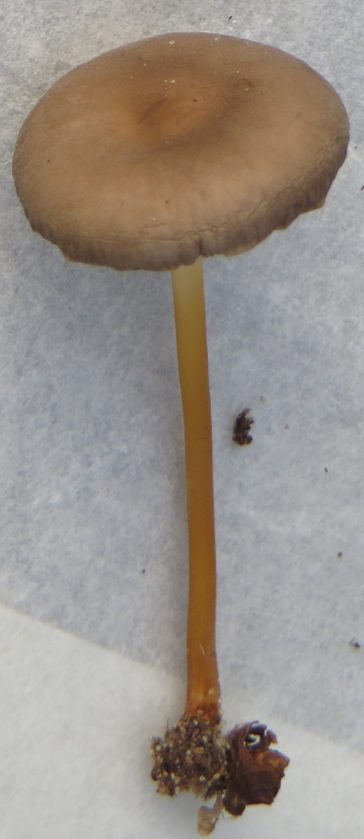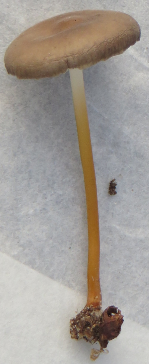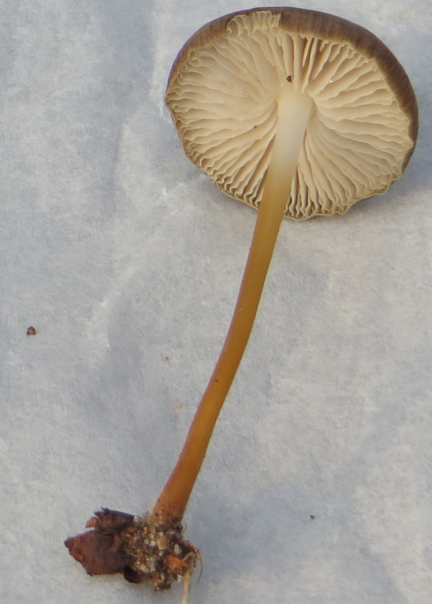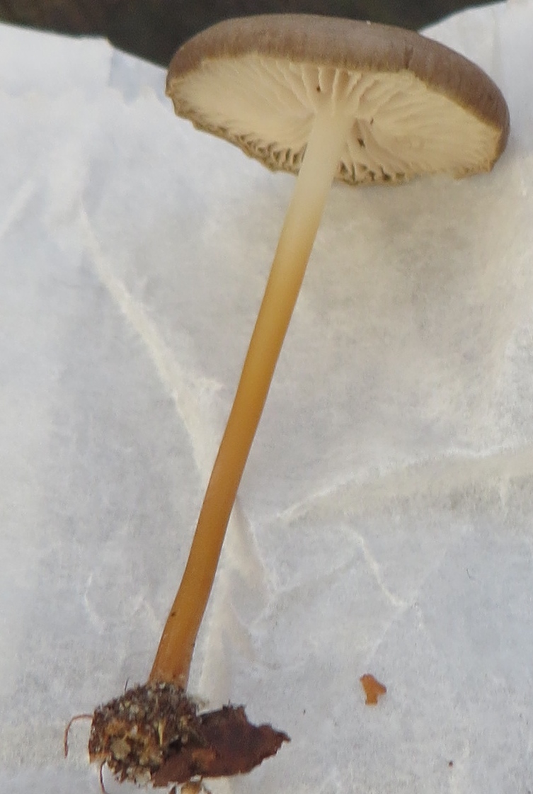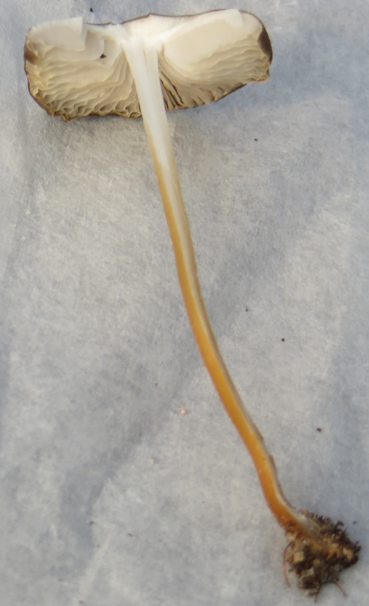 Zweiter Fund: Graubrauner Pilz, Durchmesser c.a. 2 cm, langer