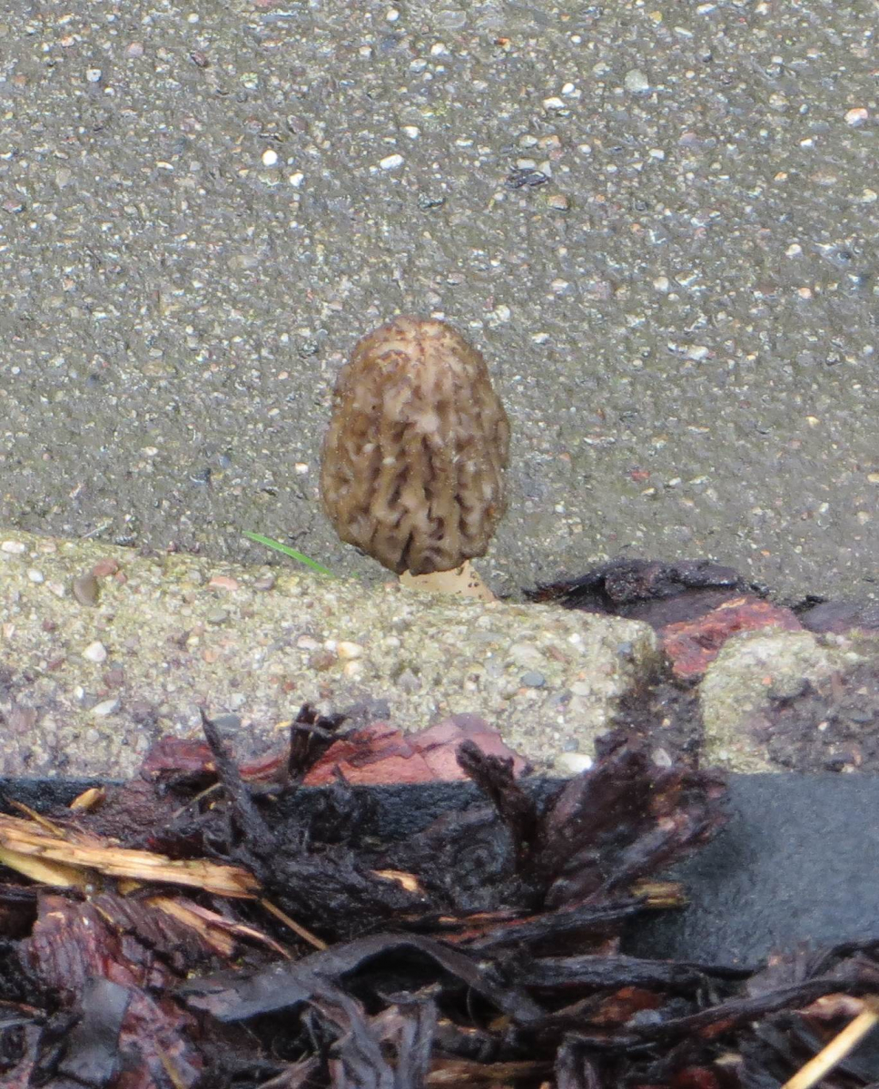 Hier eine weitere Spitzmorchel auf der anderen Seite des gemulchten Grünstreifens - nun auch mit sichtbarem Rindenmulch: