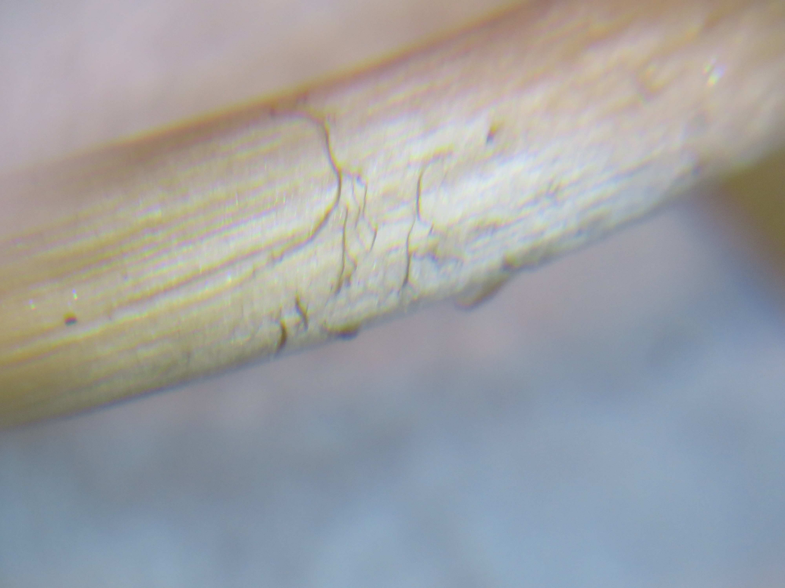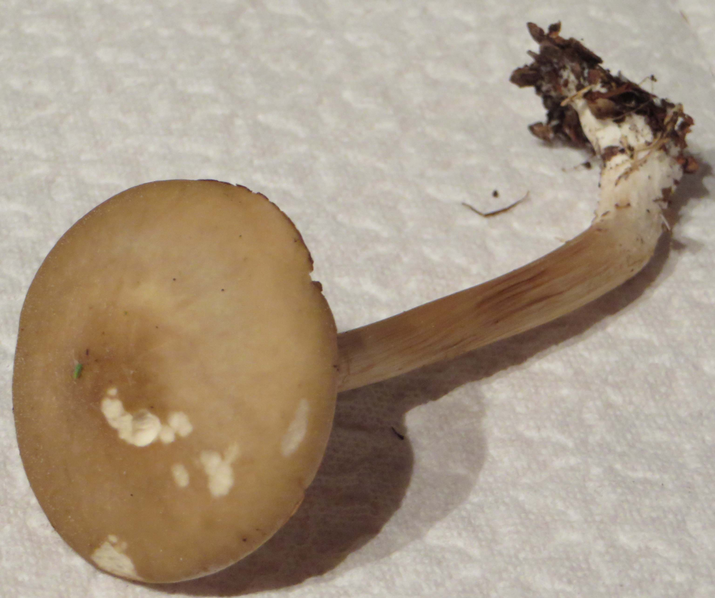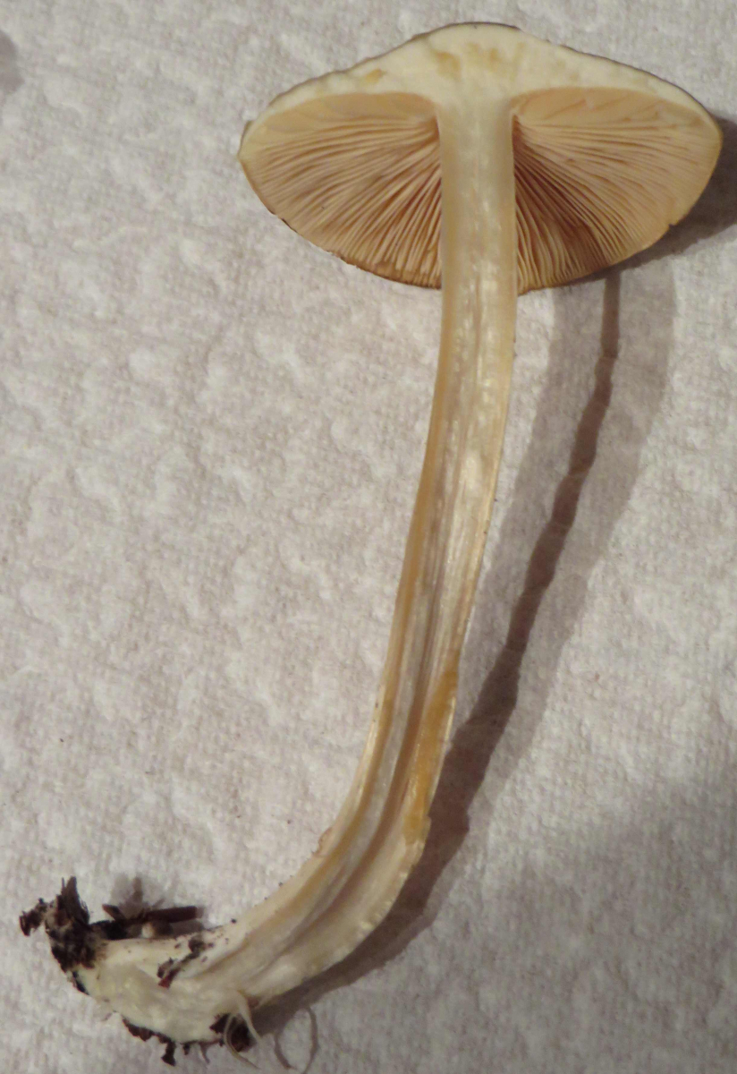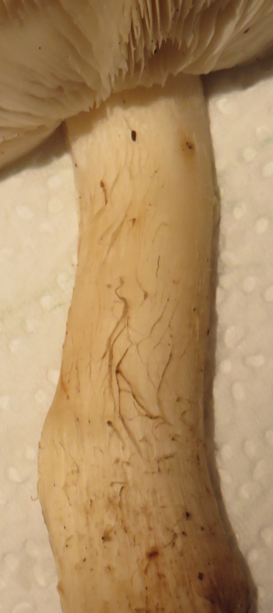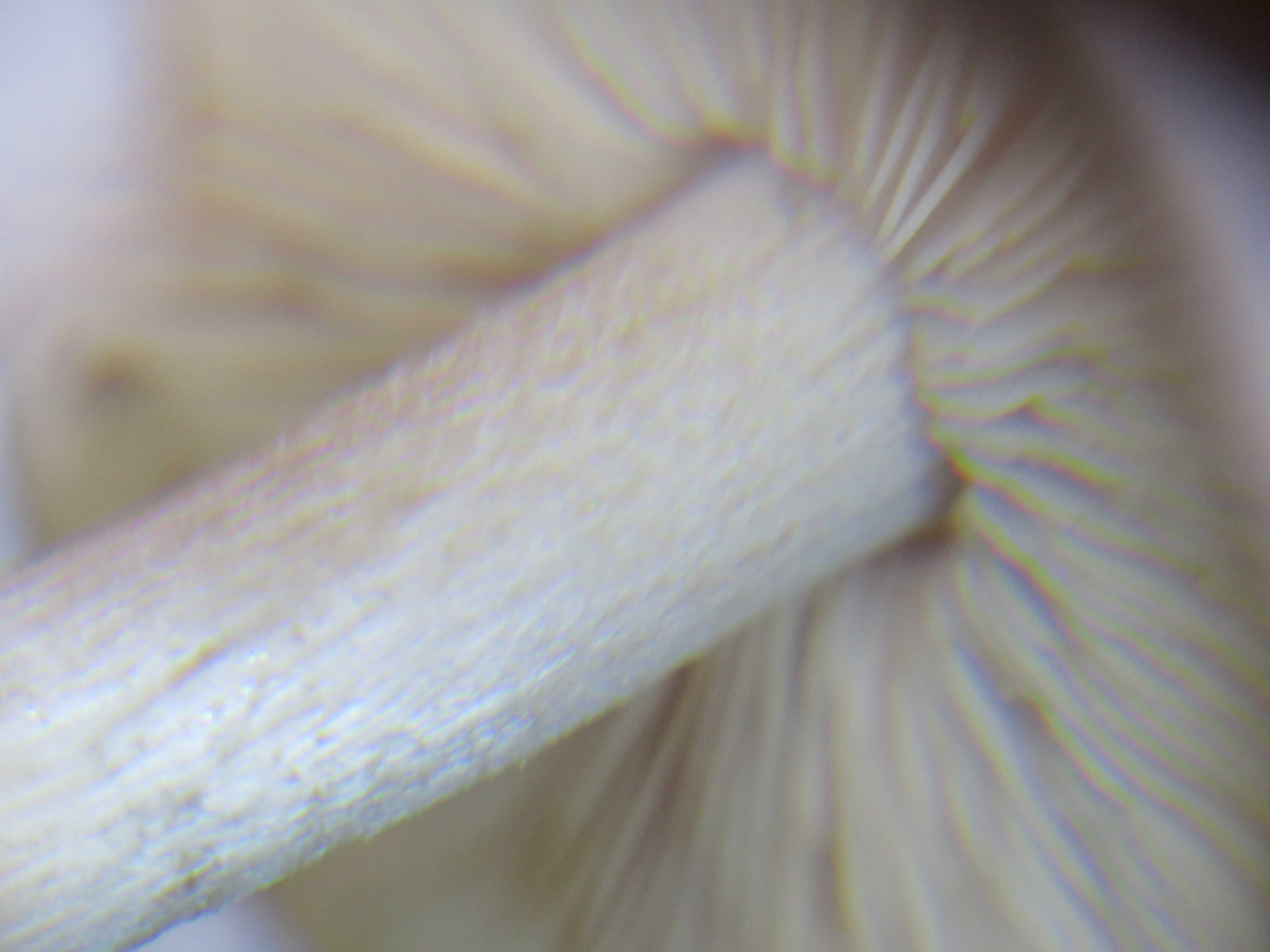 Stiel oben etwas beflockt, in der Mitte dunklere (braune?) Fädchen (Cortina-Reste?), unten Stieloberfläche etwas längsgefasert