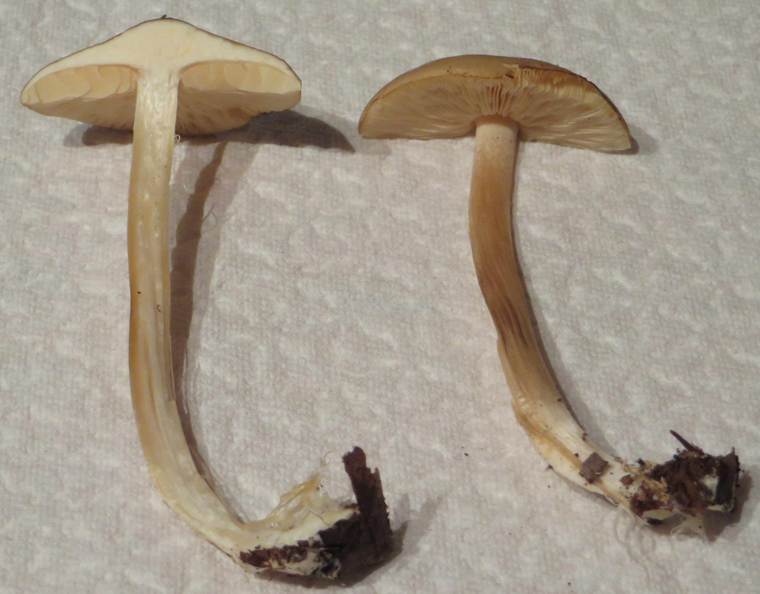 Ja, die Gestalt der Pilze passte nicht perfekt: Auch die kleineren Fruchtkörper waren eher stumpfkegelig, der Rand kaum eingerollt und der Stiel nicht ganz so dick wie auf typischen Bildern vom Maipilz (ich hatte beim Maipilz auch noch nie von sichtbarem weißem Myzel am Fuß gelesen, wie es bei zwei der abgeschnittenen Fruchtkörper der Fall war).