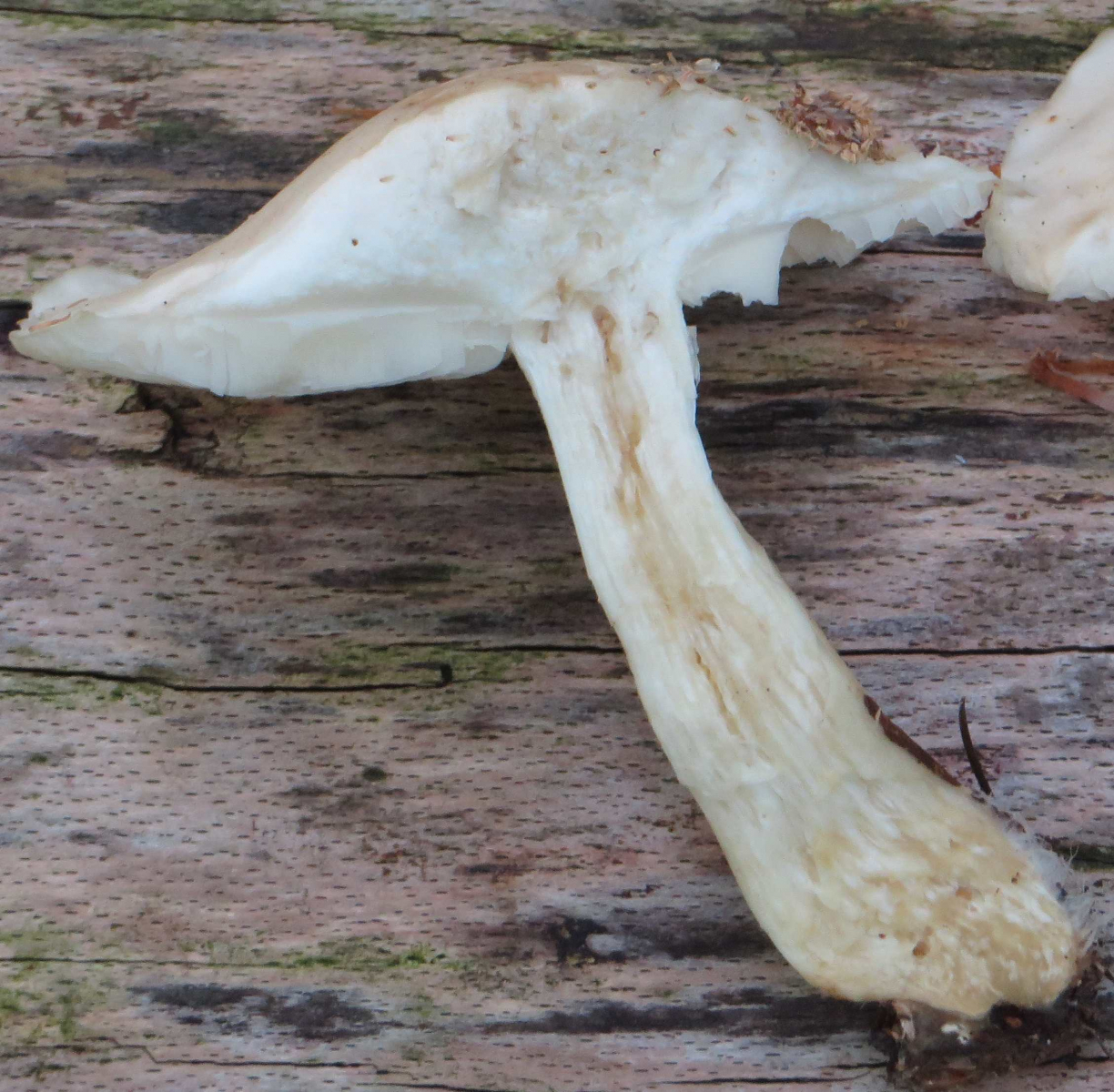 Stiel längsfaserig, etwas verdreht, Basis etwas breiter mit weißem Myzel, evtl. unten leicht hohl