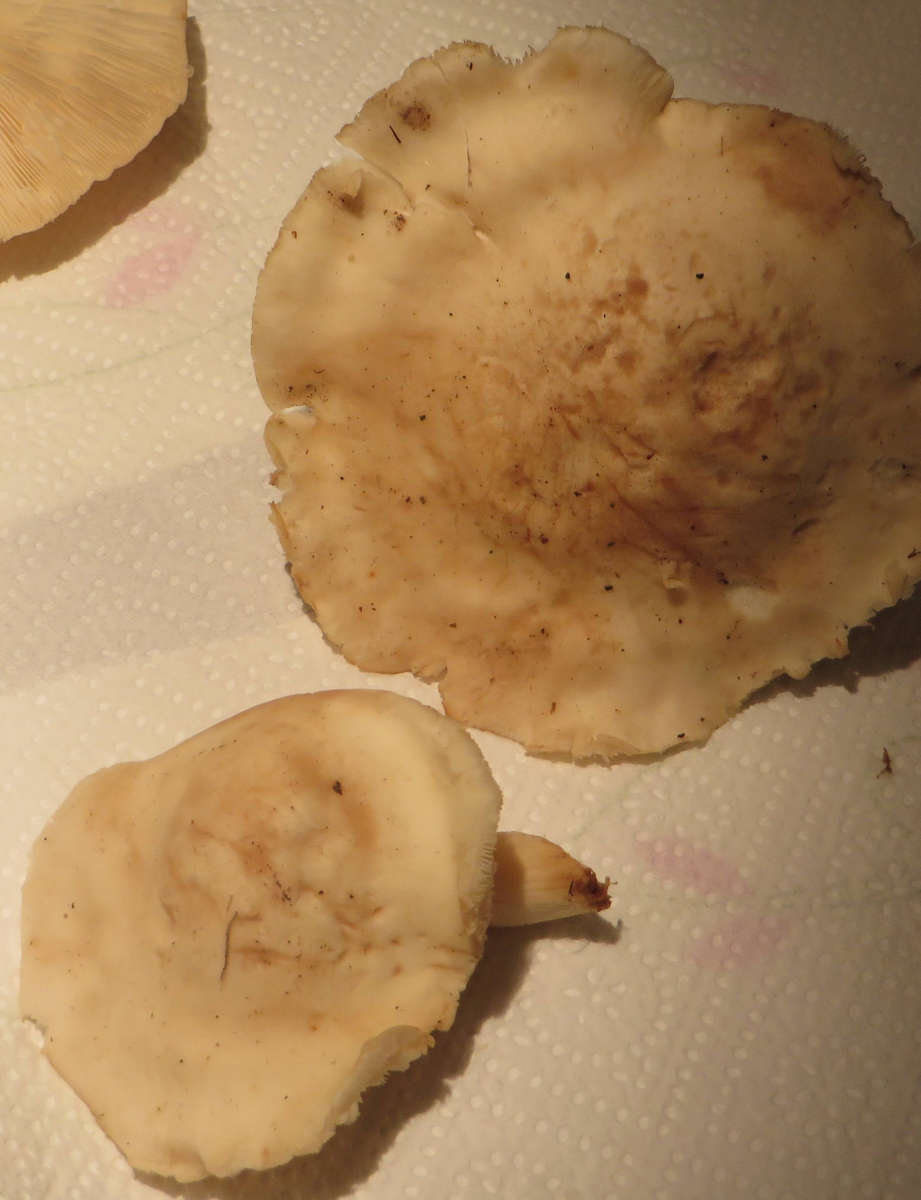 Hut flach und tellerförmig, kleiner Buckel, Rand etwas eingerollt, Rand ungerieft