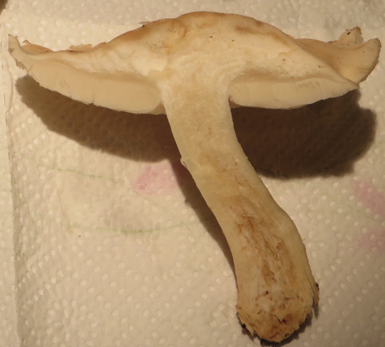 und ein Schnittbild davon, mit deutlich dünneren Lamellen im Vergleich zum Hutfleisch (Edit: Die Bestimmung wäre klarer, wenn der Kontrast noch stärker wäre. Und der Hutrand eingerollt):
