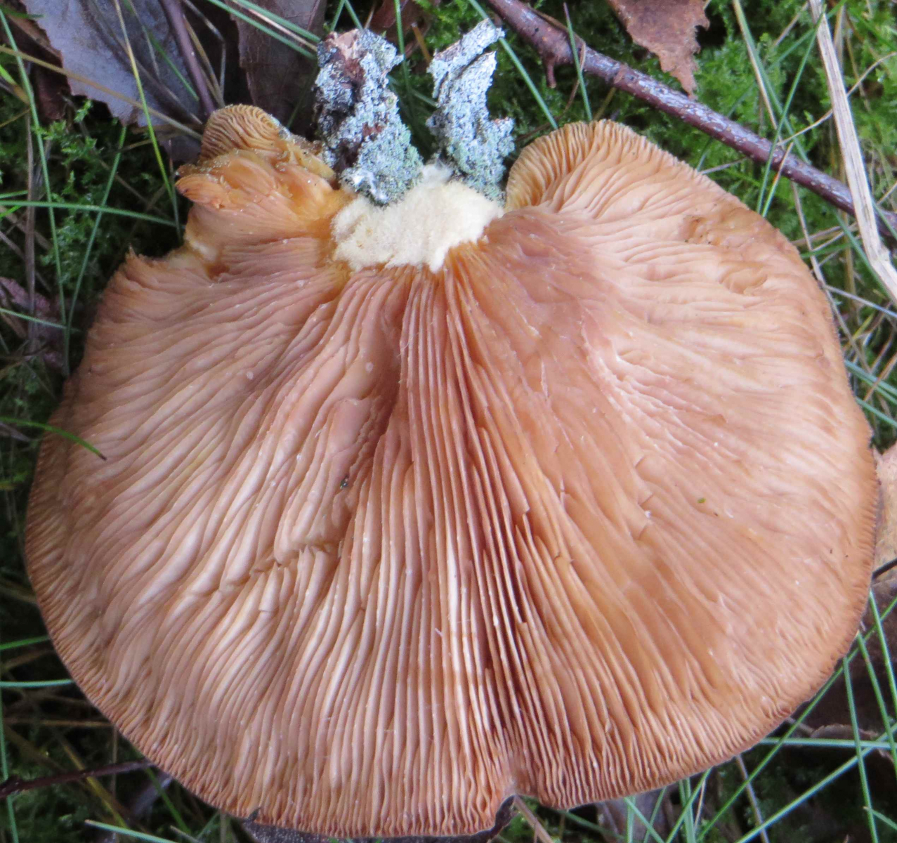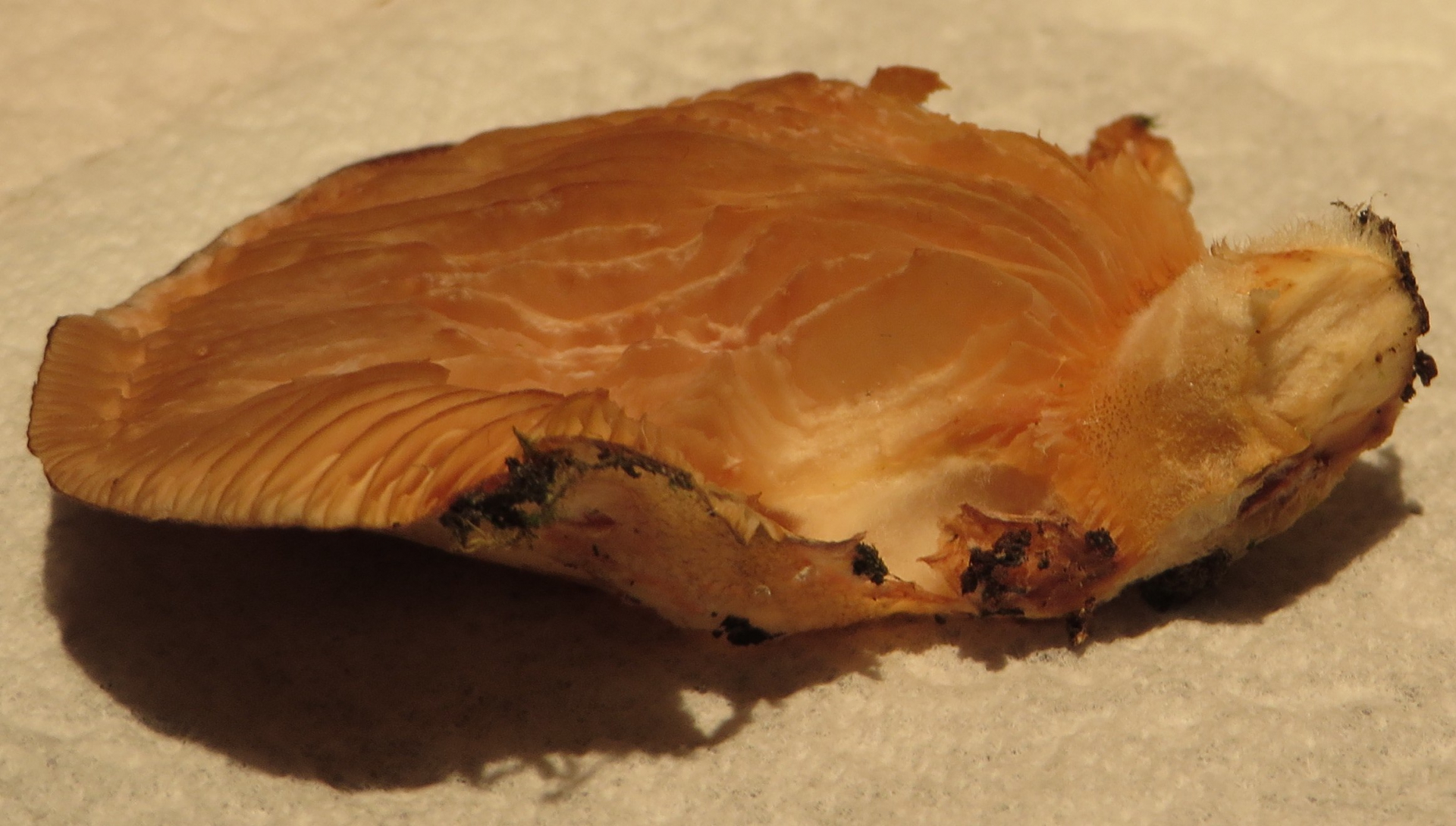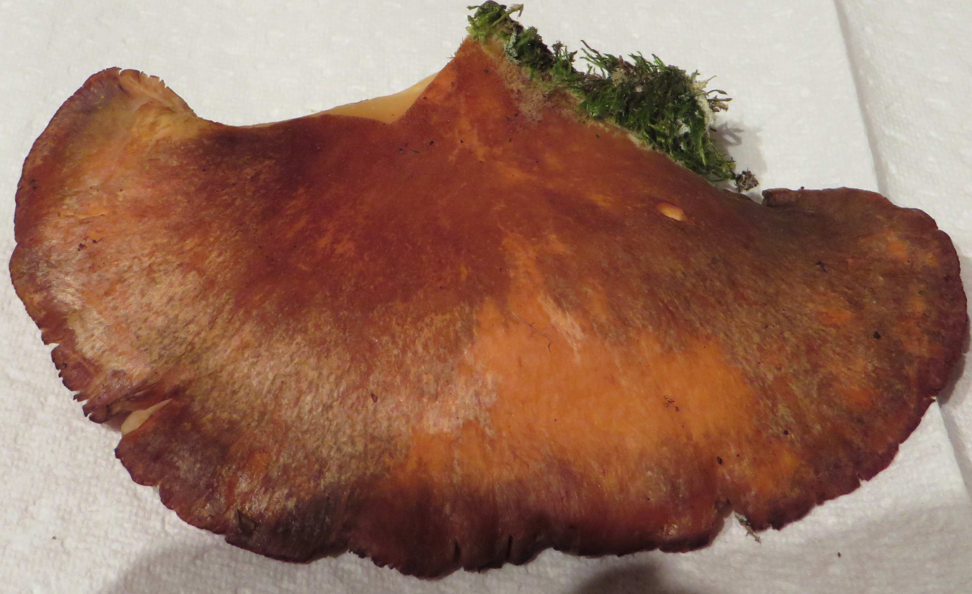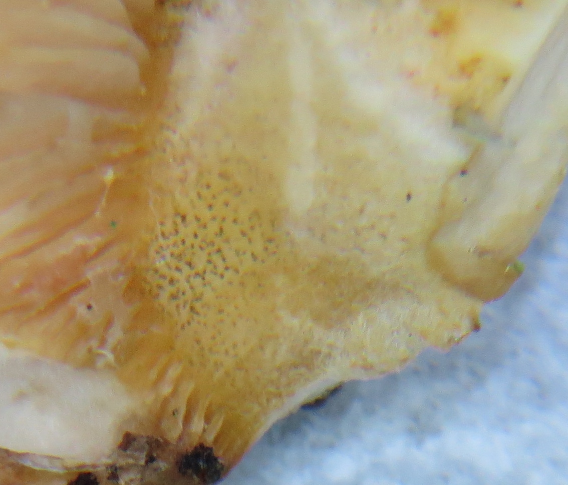 Hut: Gelb- und Orangetöne, hygrophan, Mitte orange, nach außen grauer