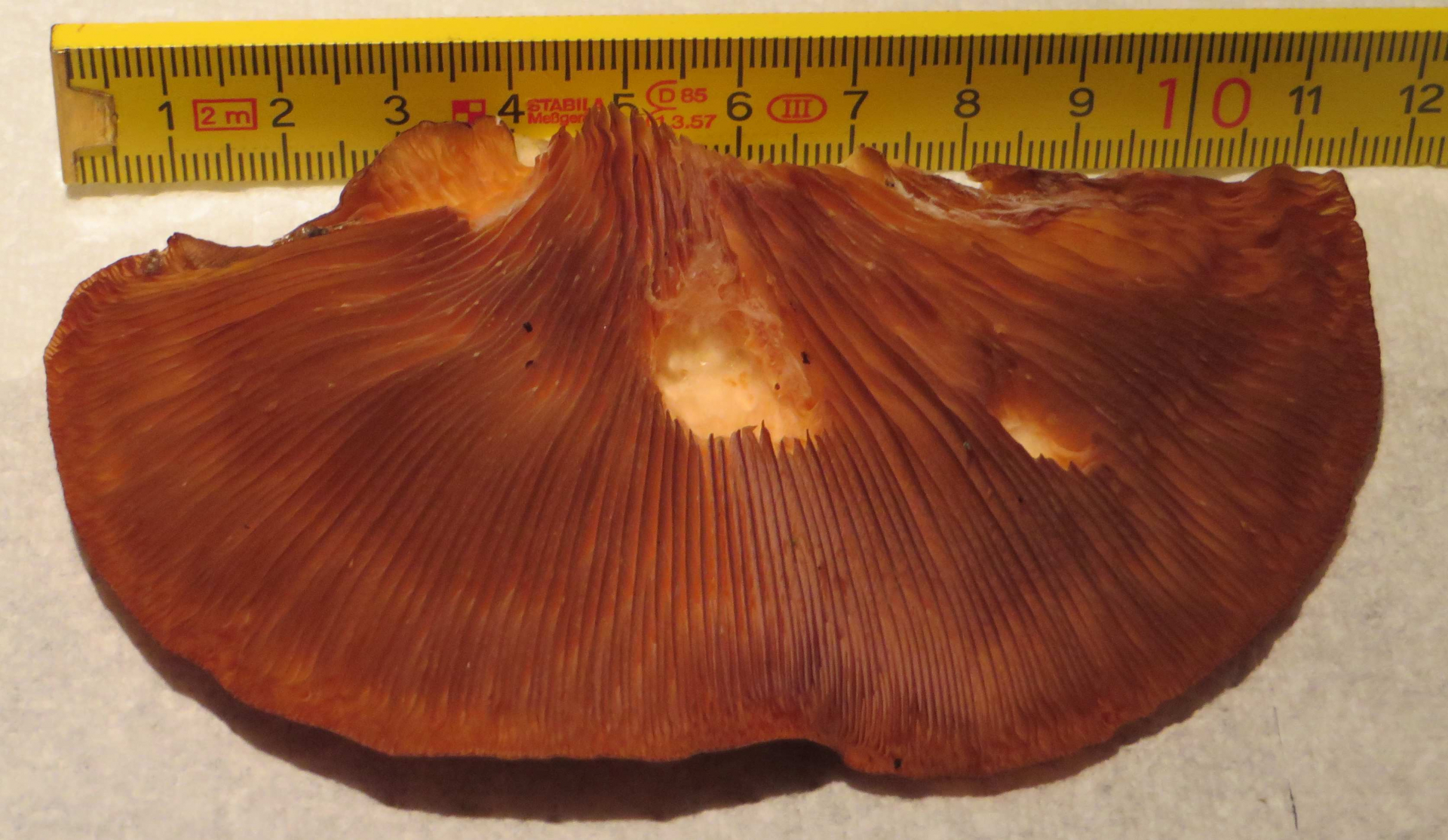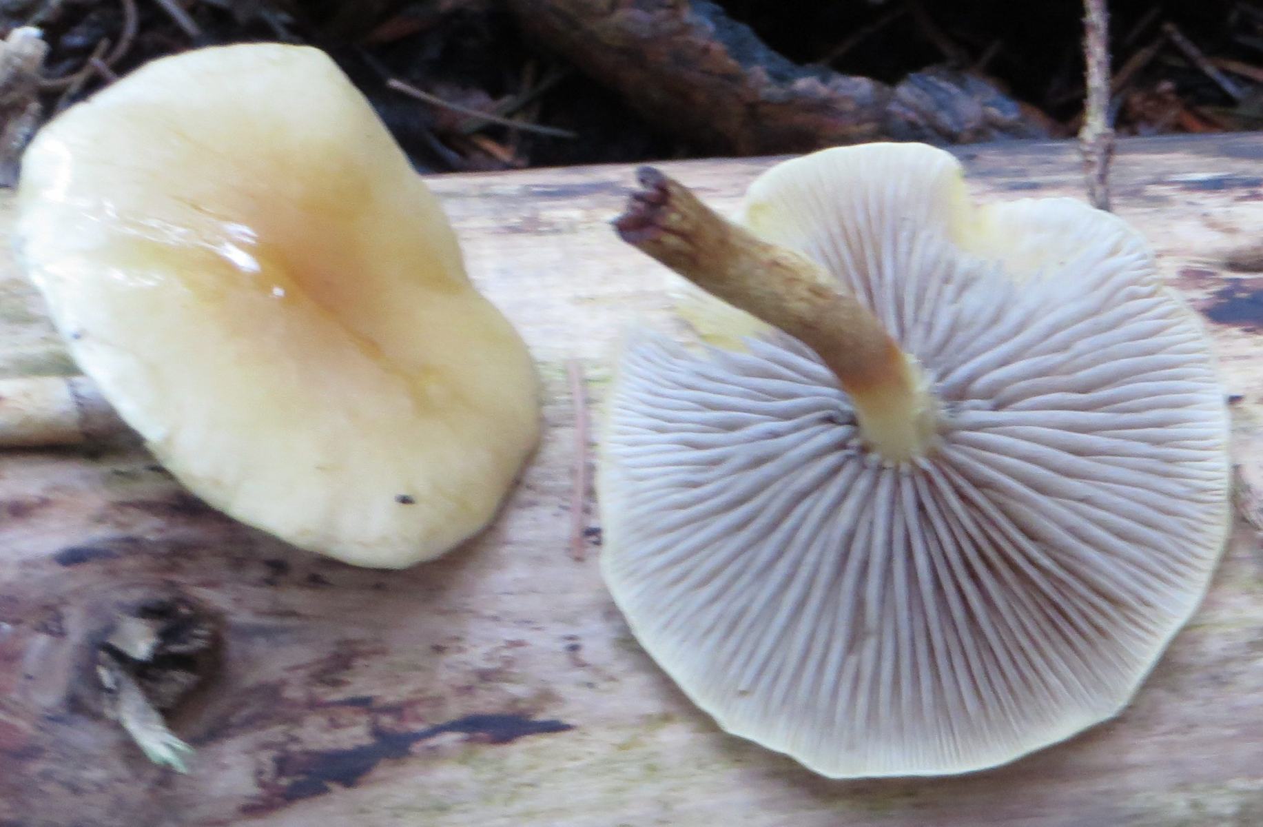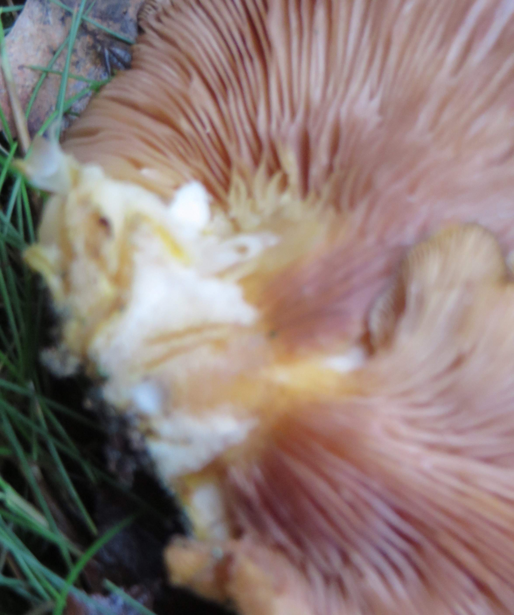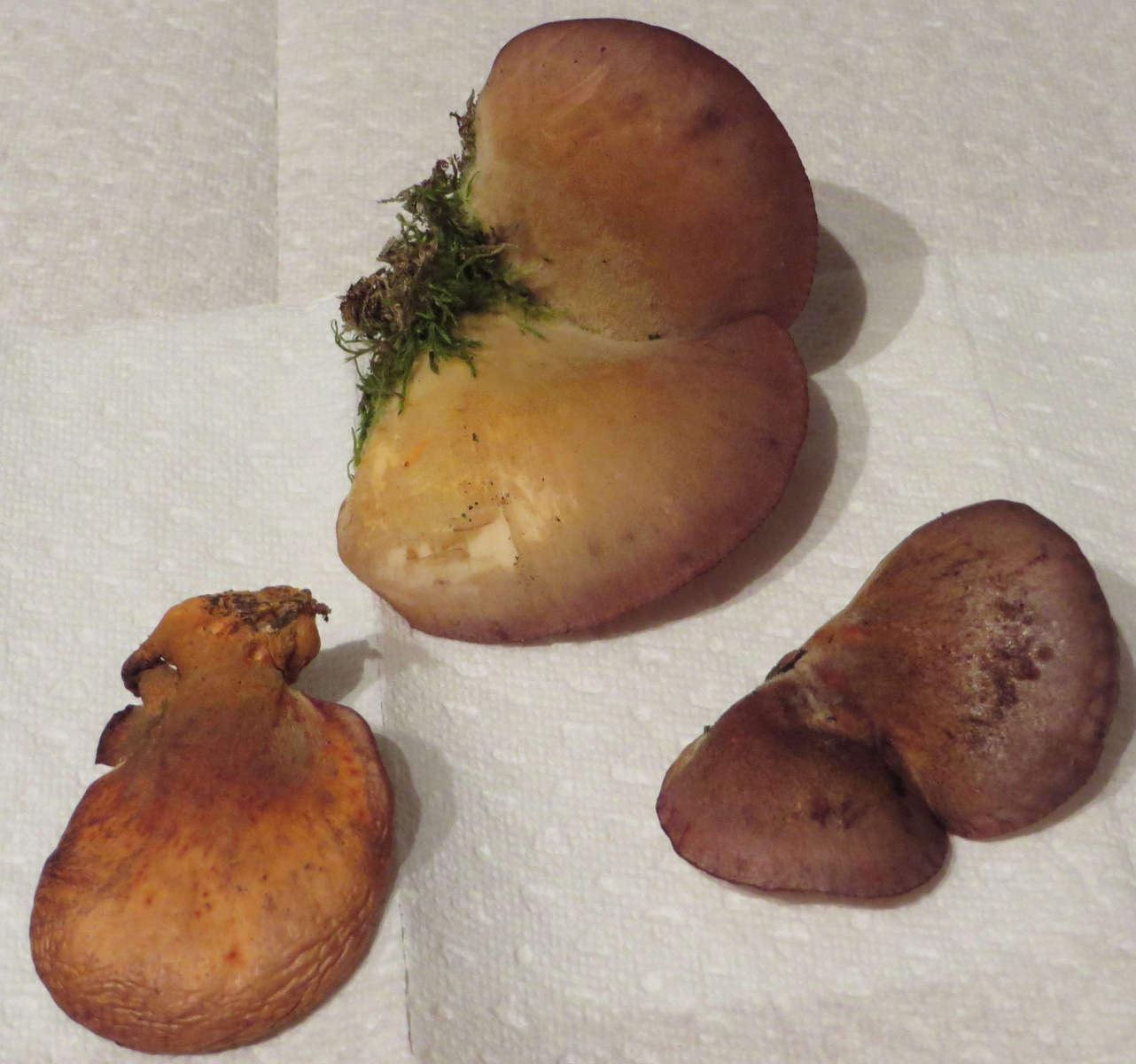 Hut: Gelb- und Orangetöne, hygrophan, Mitte orange, nach außen grauer