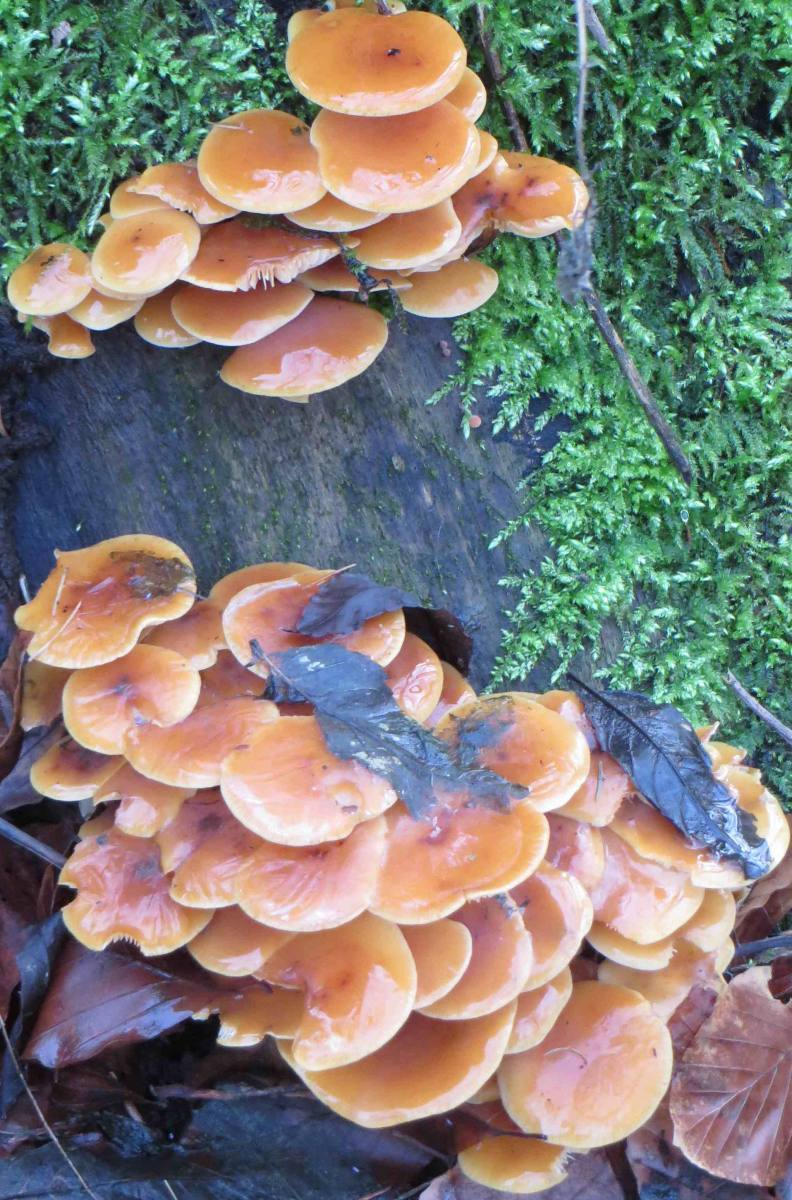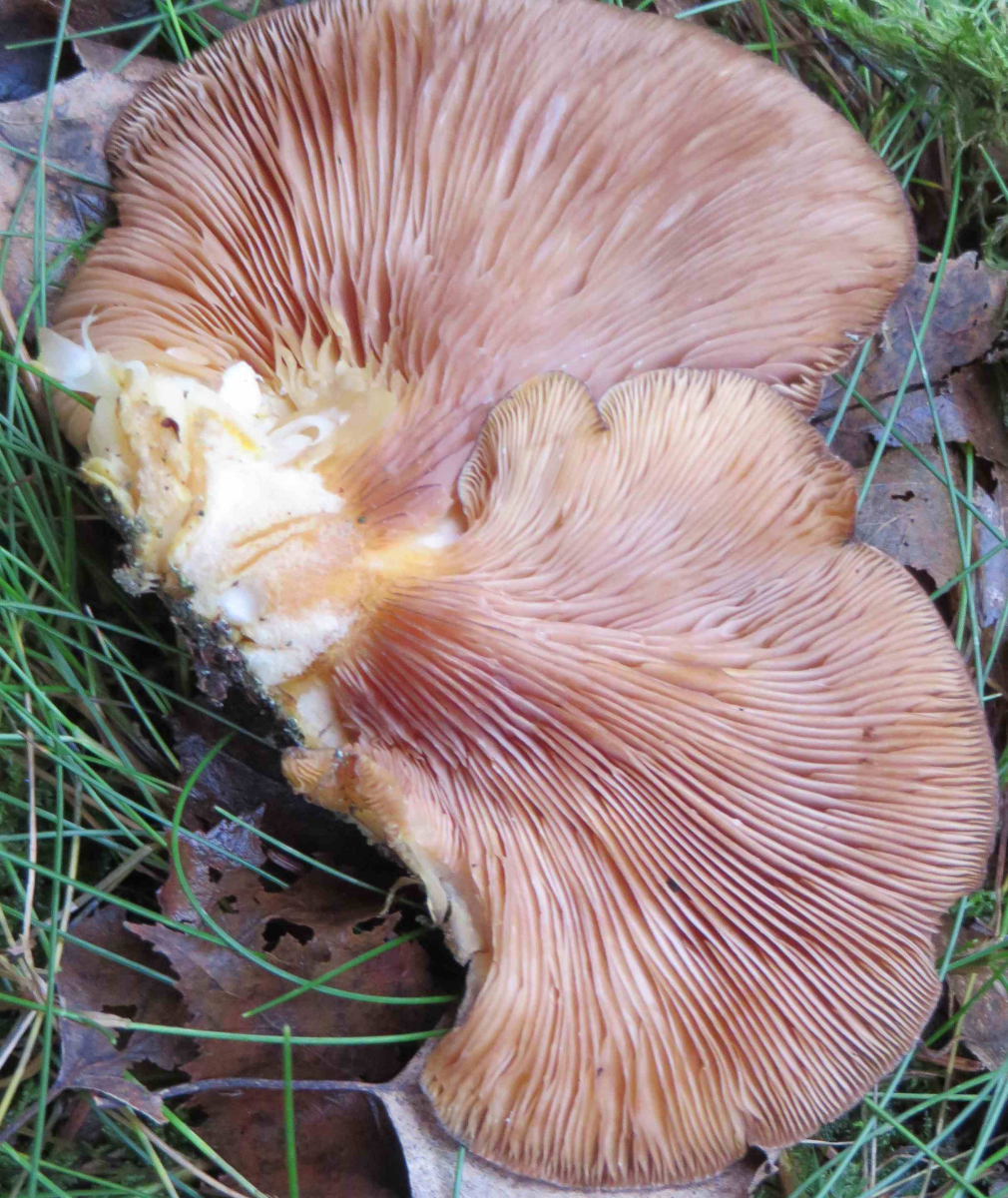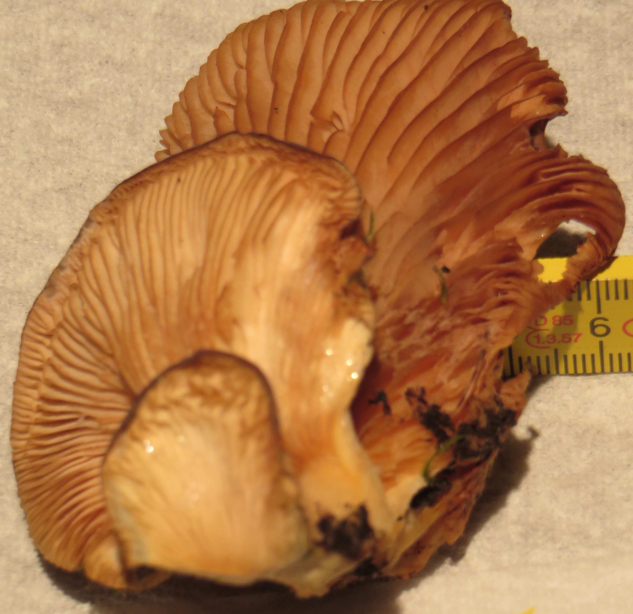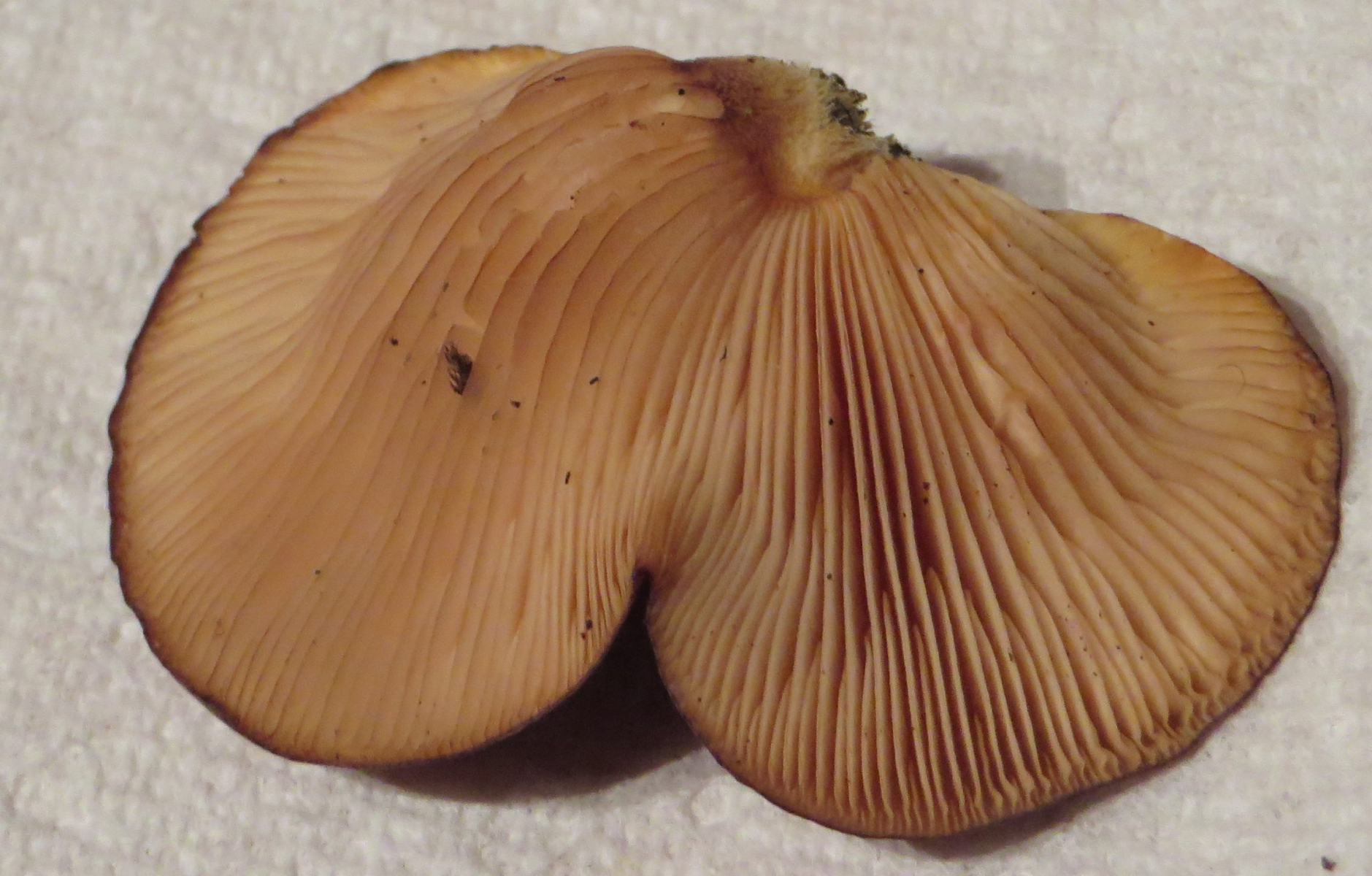 Hut: Gelb- und Orangetöne, hygrophan, Mitte orange, nach außen grauer